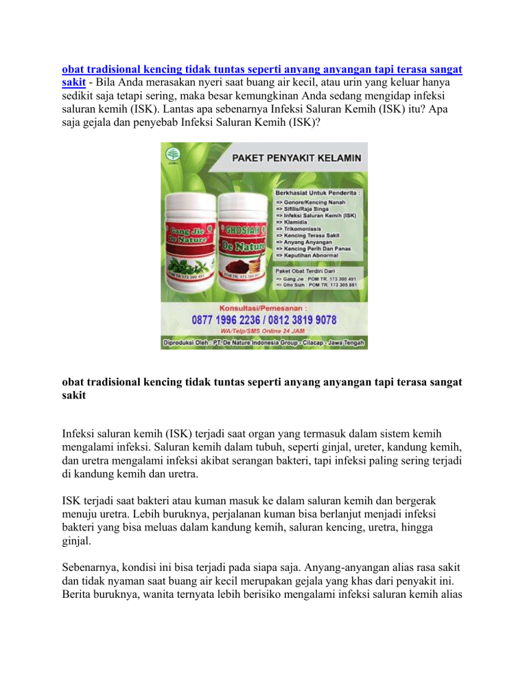 obat tradisional kencing tidak tuntas seperti anyang anyangan tapi terasa sangat sakit - Bila Anda merasakan nyeri saat buang air kecil, atau urin yang keluar hanya sedikit saja tetapi sering, maka besar kemungkinan Anda sedang mengidap infeksi saluran kemih (ISK). Lantas apa sebenarnya Infeksi Saluran Kemih (ISK) itu? Apa saja gejala dan penyebab Infeksi Saluran Kemih (ISK)? obat tradisional kencing tidak tuntas seperti anyang anyangan tapi terasa sangat sakit Infeksi saluran kemih (ISK) terjadi saat organ yang termasuk dalam sistem kemih mengalami infeksi. Saluran kemih dalam tubuh, seperti ginjal, ureter, kandung kemih, dan uretra mengalami infeksi akibat serangan bakteri, tapi infeksi paling sering terjadi di kandung kemih dan uretra. ISK terjadi saat bakteri atau kuman masuk ke dalam saluran kemih dan bergerak menuju uretra. Lebih buruknya, perjalanan kuman bisa berlanjut menjadi infeksi bakteri yang bisa meluas dalam kandung kemih, saluran kencing, uretra, hingga ginjal. Sebenarnya, kondisi ini bisa terjadi pada siapa saja. Anyang-anyangan alias rasa sakit dan tidak nyaman saat buang air kecil merupakan gejala yang khas dari penyakit ini. Berita buruknya, wanita ternyata lebih berisiko mengalami infeksi saluran kemih alias ISK. Hal tersebut bisa terjadi karena uretra pada wanita lebih pendek, sehingga bakteri jadi lebih mudah untuk mencapai kandung kemih. Beberapa gejala khas infeksi saluran kemih (ISK) antara lain: Area vagina terasa sakit atau panas saat buang air kecil. Anyang-anyangan atau keinginan kuat untuk buang air kecil namun yang keluar hanya sedikit. Ini terjadi cukup sering sehingga mengganggu aktivitas. Nyeri pada perut bagian bawah. Urin berwarna gelap atau mengandung darah. Urin berbau tidak sedap hingga berbau busuk. Beberapa kasus ISK juga bisa menimbulkan demam. Mudah lelah layaknya sedang sakit flu. obat tradisional kencing tidak tuntas seperti anyang anyangan tapi terasa sangat sakit Pada wanita, risiko infeksi saluran kemih menjadi lebih besar karena beberapa kondisi. Seperti kehamilan, pernah mengalami ISK sebelumnya, menopause, memiliki kelainan pada saluran kemih sejak lahir, penggunaan kateter urine dalam jangka panjang, hingga adanya sumbatan dalam saluran kemih, misalnya karena batu ginjal. Selain itu, ada beberapa faktor lain yang menjadi pemicu ISK ke wanita. Apa saja? 1. Infeksi Bakteri Escherichia Coli Bakteri Escherichia Coli alias E.Coli. adalah penyebab infeksi saluran kencing paling umum. Untuk mencegah ISK karena infeksi bakteri ini, pastikan selalu menjaga kebersihan pada daerah kewanitaan dan mengurangi pemakaian panty liner. Infeksi saluran kemih juga bisa terjadi karena kurang bersih saat membersihkan area intim. Karena itu, wanita dianjurkan untuk selalu membersihkan organ intim dengan cara yang benar, yaitu dari arah depan ke belakang bukan sebaliknya. Membersihkan Miss V juga sebaiknya dilakukan dengan menggunakan air bersih yang mengalir. 2. Tidak Tuntas Membersihkan Organ Intim Setelah buang air besar atau buang air kecil, membersihkan organ intim dengan benar adalah cara terbaik untuk mencegah infeksi bakteri. Sayangnya, belum banyak orang yang menyadari dan melakukannya dengan cara yang benar. Selain tidak melakukan cara membersihkan yang tepat, kebanyakan orang juga tidak tuntas dalam membersihkan. Itulah yang membuat sisa kotoran mungkin masih menempel dan menyebabkan kuman dan bakteri berkumpul. Setelah itu, bakteri mulai berkembang biak yang pada akhirnya menyebabkan infeksi kandung kemih. 3. Menahan Buang Air Kecil Kebiasaan menahan buang air kecil, terutama setelah berhubungan intim bisa menyebabkan terjadinya ISK. Sebab, bakteri penyebab infeksi ini biasanya disebarkan lewat aktivitas seksual antara pria dan wanita. Dengan kondisi uretra yang lebih pendek, wanita menjadi lebih berisiko mengalami infeksi. Maka dari itu, sangat dianjurkan untuk selalu buang air kecil sesudah melakukan hubungan intim. 4. Malas Minum Air Putih Selain menyebabkan tubuh kekurangan cairan alias dehidrasi, malas minum air putih juga bisa menyebabkan infeksi saluran kemih. Bagaimana caranya? Saat tubuh kurang asupan air putih, ginjal pun akan kehilangan cairan. Padahal, organ ini membutuhkan cairan untuk berfungsi dengan baik. Kondisi ini akan membuat seseorang menjadi jarang buang air kecil dan ginjal menjadi kering. Nah, pada saat seperti itulah bakteri menjadi lebih mudah untuk menyerang sehingga terjadilah infeksi saluran kemih. Maka dari itu, memenuhi kebutuhan tubuh akan cairan sangat penting dilakukan, yakni dengan cara minum dua liter air atau sekitar delapan gelas dalam satu hari. CARA ALAMI DAN TRADISIONAL MENGOBATI INFEKSI SALURAN KEMIH (ISK) 1. Buang air kecil selesai berhubungan seks Ini adalah salah satu pengobatan rumahan yang paling penting untuk pencegahan ISK. Setelah seks, Dr Prince merekomendasikan untuk segera berkemih dan mandi. Gunanya untuk membuang bakteri yang mungkin memasuki uretra. Selain itu, buang air kecil secara teratur setiap dua sampai tiga jam atau ketika merasa dorongan untuk berkemih. Sebab menahan air seni dalam waktu lama akan menyebabkan penumpukan bakteri dan meningkatkan risiko ISK. 2. Jangan mandi berendam setelah berhubungan seks Zat kimia dalam garam dan gel mandi dapat mengiritasi uretra dan membuatnya rentan terhadap infeksi. Hindari juga bahan kimia atau parfum dalam semprotan produk pembasuh wanita, tisu toilet beraroma, dan deodoran. Ini dapat mengganggu keseimbangan pH normal di vagina dan meningkatkan risiko infeksi bakteri berbahaya. 3. Perbanyak minum air putih Air minum membantu menghilangkan bakteri, sehingga penting untuk tetap terhidrasi selama terkena ISK. Hidrasi juga membantu membersihkan ginjal dan kandung kemih. Bila asupan umum air minum sebanyak delapan gelas per hari, tingkatkan jumlahnya jika mengalami ISK. 4. Hindari kafein dan alkohol Kafein dan alkohol mengiritasi kandung kemih yang dapat memperburuk ISK. Selain itu perhatikan pula kandungan kafein dalam soda, minuman berenergi, kopi