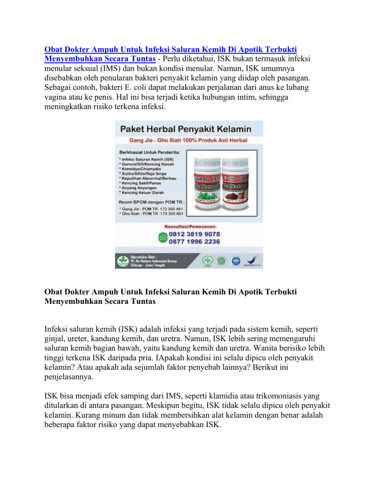 Obat Dokter Ampuh Untuk Infeksi Saluran Kemih Di Apotik Terbukti Menyembuhkan Secara Tuntas - Perlu diketahui, ISK bukan termasuk infeksi menular seksual (IMS) dan bukan kondisi menular. Namun, ISK umumnya disebabkan oleh penularan bakteri penyakit kelamin yang diidap oleh pasangan. Sebagai contoh, bakteri E. coli dapat melakukan perjalanan dari anus ke lubang vagina atau ke penis. Hal ini bisa terjadi ketika hubungan intim, sehingga meningkatkan risiko terkena infeksi. Obat Dokter Ampuh Untuk Infeksi Saluran Kemih Di Apotik Terbukti Menyembuhkan Secara Tuntas Infeksi saluran kemih (ISK) adalah infeksi yang terjadi pada sistem kemih, seperti ginjal, ureter, kandung kemih, dan uretra. Namun, ISK lebih sering memengaruhi saluran kemih bagian bawah, yaitu kandung kemih dan uretra. Wanita berisiko lebih tinggi terkena ISK daripada pria. IApakah kondisi ini selalu dipicu oleh penyakit kelamin? Atau apakah ada sejumlah faktor penyebab lainnya? Berikut ini penjelasannya. ISK bisa menjadi efek samping dari IMS, seperti klamidia atau trikomoniasis yang ditularkan di antara pasangan. Meskipun begitu, ISK tidak selalu dipicu oleh penyakit kelamin. Kurang minum dan tidak membersihkan alat kelamin dengan benar adalah beberapa faktor risiko yang dapat menyebabkan ISK. Wanita yang mengidap diabetes juga berisiko tinggi mengidap ISK karena kurang mampu melawan infeksi akibat sistem kekebalan tubuhnya yang melemah. Kondisi lain yang meningkatkan risiko, contohnya perubahan hormon, multiple sclerosis, dan kondisi apa pun yang memengaruhi aliran urin, seperti batu ginjal, stroke, dan cedera tulang belakang. Gejala Infeksi Saluran Kemih (ISK) Infeksi saluran kemih tidak selalu menunjukkan tanda-tanda atau gejala yang berat. Gejala yang timbul pun dapat berbeda antara infeksi saluran kemih bawah dan atas. Infeksi saluran kemih bawah yang melibatkan kandung kemih dan uretra biasanya ditandai dengan adanya: Rasa pedih dan panas saat berkemih Dorongan kuat dan persisten untuk berkemih secara tiba-tiba Rasa nyeri atau tidak nyaman saat berkemih Rasa tidak tuntas atau terasa ada yang tertinggal saat berkemih Anyang-anyangan Kekeruhan pada air seni Perubahan warna air seni menjadi merah, merah muda terang, atau kecoklatan Aroma air seni yang menyengat Nyeri pada perut bawah, terutama dialami pada wanita Rasa pegal dan mudah lelah Sedangkan, tanda dan gejala yang umumnya terjadi pada infeksi saluran kemih atas yang melibatkan organ ginjal dan ureter adalah: Demam dengan suhu di atas 38oC Nyeri pada pinggang Menggigil Agitasi dan rasa tidak nyaman pada tubuh Pencegahan Infeksi Saluran Kemih Bila seseorang sering mengalami infeksi saluran kemih, ada beberapa hal yang bisa dilakukan untuk menghindari terjadinya infeksi berulang, seperti : Menjaga kondisi hidrasi tubuh dengan memastikan konsumsi air minum yang rutin dan mencukupi kebutuhan harian. Menjaga kebersihan anus dan membersihkannya dari arah depan ke belakang saat selesai buang air di toilet. Mencuci tangan dengan benar, khususnya usai melakukan aktivitas di toilet Berkemih dan membesihkan diri setelah berhubungan seksual. Menggunakan pakaian dalam yang terbuat dari katun dan menghindari bahan sintetis seperti nilon. Obat Infeksi Saluran Kemih (ISK) - Anyang Anyangan - Kencing Nanah/Gonore - Sipilis/Raja Singa - Klamidia - Penyakit Kelamin Herbal Alami De Nature Indonesia adalah sebuah perusahaan yang bergerak di bidang Obat Tradisional (OT) dari dalam Negeri, yang mencoba mengangkat dan menghidupkan kembali Budaya Nenek Moyang kita Yaitu Jamu Tradisional sebagai salah satu warisan leluhur budaya bangsa yang perlu dilestarikan. Produk De Nature dalam artikel ini khusus untuk mengatasi masalah kelamin / penyakit kelamin. Sekedar informasi untuk kenyamanan Konsumen, bahwa Produk dari perusahaan kami ini sudah memiliki: Ijin Resmi Perusahaan dari Kementerian Kesehatan Ijin BPOM, yang artinya sudah lulus uji stabilitas Produk Sertifikat Halal MUI, sehingga kehalalannya bisa dipertanggungjawabkan Apoteker Yang berpengalaman Sudah melewati Proses Sortir Bahan Baku, Guna Menjaga Mutu Produk Proses Produksi Sesuai Alur CPOTB (Cara Pembuatan Obat Tradisional Yang Baik Dan Benar) Sertifikat ISO 9001 : 2015 yang artinya sudah Berstandar Internasional Untuk informasi lebih lanjut mengenai Produk dan Harga, Cara Pemesanan/ Konsultasi atau hal lainnya, anda dapat menghubungi kami melalui Telpon/WhatsApp/SMS (Online 24 jam / Fast Respon) pada nomor yang tertera pada gambar obat di atas. Produk Yang Asli : Pastikan Dikirim dari "JL. Pahonjean Perum Cendana Asri No 9, Kecamatan Majenang, Kabupaten Cilacap, Jawa Tengah Kode Pos 53257." Karena pengiriman barang hanya satu pintu jika di kirim dari luar daerah tersebut sudah bisa di pastikan produk PALSU! Produk yang asli memiliki hologram pemilik De Nature Indonesia jika berhologram dengan gambar yang lain dipastikan PALSU! Penelusuran yang terkait dengan Obat Dokter Ampuh Untuk Infeksi Saluran Kemih Di Apotik Terbukti Menyembuhkan Secara Tuntas : obat infeksi saluran kemih di apotik, harga obat infeksi saluran kemih di apotik, bisakah infeksi saluran kencing sembuh tanpa obat, obat kencing sakit di apotik, yakult untuk mengobati infeksi saluran kemih, obat infeksi saluran kencing pada pria di apotik, batugin untuk infeksi saluran kemih, habbatussauda untuk infeksi saluran kencing, obat kencing bercabang di apotik, berapa lama sembuh dari infeksi saluran kemih