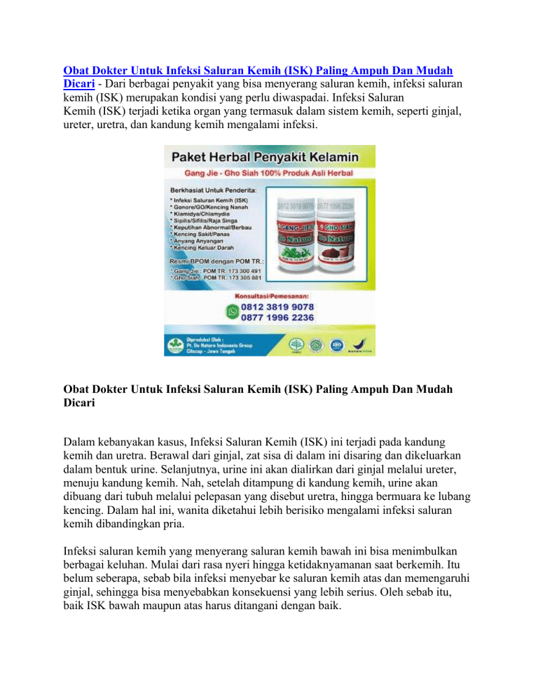 Obat Dokter Untuk Infeksi Saluran Kemih (ISK) Paling Ampuh Dan Mudah Dicari - Dari berbagai penyakit yang bisa menyerang saluran kemih, infeksi saluran kemih (ISK) merupakan kondisi yang perlu diwaspadai. Infeksi Saluran Kemih (ISK) terjadi ketika organ yang termasuk dalam sistem kemih, seperti ginjal, ureter, uretra, dan kandung kemih mengalami infeksi. Obat Dokter Untuk Infeksi Saluran Kemih (ISK) Paling Ampuh Dan Mudah Dicari Dalam kebanyakan kasus, Infeksi Saluran Kemih (ISK) ini terjadi pada kandung kemih dan uretra. Berawal dari ginjal, zat sisa di dalam ini disaring dan dikeluarkan dalam bentuk urine. Selanjutnya, urine ini akan dialirkan dari ginjal melalui ureter, menuju kandung kemih. Nah, setelah ditampung di kandung kemih, urine akan dibuang dari tubuh melalui pelepasan yang disebut uretra, hingga bermuara ke lubang kencing. Dalam hal ini, wanita diketahui lebih berisiko mengalami infeksi saluran kemih dibandingkan pria. Infeksi saluran kemih yang menyerang saluran kemih bawah ini bisa menimbulkan berbagai keluhan. Mulai dari rasa nyeri hingga ketidaknyamanan saat berkemih. Itu belum seberapa, sebab bila infeksi menyebar ke saluran kemih atas dan memengaruhi ginjal, sehingga bisa menyebabkan konsekuensi yang lebih serius. Oleh sebab itu, baik ISK bawah maupun atas harus ditangani dengan baik. Sedangkan ISK atas lain lagi ceritanya. Kondisi ini akan memengaruhi ginjal ureter. Kondisi ini disebut dengan pielonefritis atau infeksi saluran kemih pada ginjal. Lalu, bagaimana sih cara menangani atau obat-obatan yang perlu diminum untuk mengatasi ISK? Gejalanya Cenderung Berbeda Sebelum mengetahui cara mengobati penyakit ini, maka ada baiknya untuk berkenalan dulu dengan gejalanya. Nah, gejala dari ISK atas dan bawah relatif berbeda. Dengan kata lain, gejala ISK ini tergantung dari jenis infeksi yang dialami. Untuk kasus ISK atas, pengidapnya biasanya akan mengalami nyeri pinggang, punggung bawah, ataupun selangkangan. Hati-hati, nyeri ini bisa semakin menjadijadi saat berkemih. Selain itu, gejala ISK atas juga meliputi demam, mual dan muntah, diare, serta tubuh terasa dingin dan menggigil. Untuk ISK bawah beda lagi. Nah, berikut gejala yang bisa dirasakan pengidapnya: Tak bisa menahan rasa ingin buang air kecil. Timbul nyeri saat buang air kecil. Ada rasa panas saat buang air kecil. Frekuensi berkemih meningkat, tapi jumlah urine sedikit. Lemas. Adanya darah dalam urine (hematuria). Nyeri di perut bagian bawah. Bau urine sangat menyengat. Kandung kemih terasa masih penuh, meski sudah buang air kecil. Warna urine jadi keruh. Nyeri di punggung (pada wanita) atau di bagian rektum (pada pria)/ Ketahui Cara Mengobatinya Dalam kebanyakan kasus, infeksi saluran kemih ini umumnya bisa ditangani dengan antibiotik. Jenis obat yang akan diresepkan bergantung pada kondisi kesehatan pengidapnya, dan jenis bakteri yang ditemukan di urine. Obat, seperti fosfomycin, nitrofurantoin, trimethoprim, dan ceftriaxone, merupakan jenis antibiotik yang biasanya digunakan untuk mengatasi ISK. Namun, dalam beberapa kasus, antibiotik jenis fluoroquinolon, seperti ciprofloxacin dan levofloxacin, akan digunakan bila tak ada pilihan lain. Akan tetapi, dokter biasanya akan menghindari untuk meresepkan obat ini. Pasalnya, efek sampingnya melebihi manfaat yang bisa didapat. Ketika mengonsumsi obat-obatan di atas, biasanya gejala akan hilang setelah beberapa hari mengonsumsinya. Tapi yang perlu diingat, pengobatan dengan antibiotik tetap harus dilanjut hingga selesai. Sedangkan pengidap ISK yang sering kambuh, penanganannya beda lagi. Di sini dokter akan menganjurkan untuk mengonsumsi antibiotik dalam dosis rendah tiap hari, selama enam bulan atau lebih. Obat Dokter Untuk Infeksi Saluran Kemih (ISK) Paling Ampuh Dan Mudah Dicari Ada cara lain yang bisa anda gunakan sebagai obat infeksi saluran kemih selain menggunakan antibiotik. Salah satu caranya yaitu menggunakan cara alami. Cara alami diyakini bisa digunakan sebagai langkah pengobatan yang tepat dan juga aman. Cara alami bisa dilakukan dengan membuat ramuan sendiri maupun dengan obat alami atau obat herbal. Jika ingin memilih menggunakan obat herbal maka pastikan jika obat tersebut memang sudah teruji klinis dan mempunyai izin edar dan resmi BPOM. Selain itu pastikan juga kehalalan produk tersebut dengan memiliki label HALAL MUI. Alangkah lebih baiknya juga jika produk sudah memiliki sertifikat ISO (9001:2015). Obat Infeksi Saluran Kemih (ISK) - Anyang Anyangan - Kencing Nanah/Gonore - Sipilis/Raja Singa - Klamidia - Penyakit Kelamin Herbal Alami Penelusuran yang terkait dengan Obat Dokter Untuk Infeksi Saluran Kemih (ISK) Paling Ampuh Dan Mudah Dicari : obat infeksi saluran kencing pada pria, obat infeksi saluran kencing pada wanita di apotik, bisakah infeksi saluran kencing sembuh tanpa obat, harga obat infeksi saluran kemih di apotik, obat kencing sakit di apotik, obat nyeri saat kencing terakhir di apotik, berapa lama sembuh dari infeksi saluran kemih, obat infeksi saluran kencing pada pria di apotik