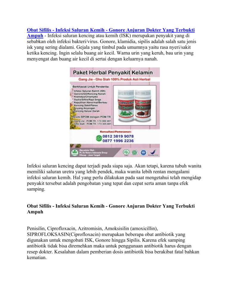 Obat Sifilis - Infeksi Saluran Kemih - Gonore Anjuran Dokter Yang Terbukti Ampuh - Infeksi saluran kencing atau kemih (ISK) merupakan penyakit yang di sebabkan oleh infeksi bakteri/virus. Gonore, klamidia, sipilis adalah salah satu jenis isk yang sering dialami. Gejala yang timbul pada umumnya yaitu rasa nyeri/sakit ketika kencing. Ingin selalu buang air kecil. Warna urin yang keruh, bau urin yang menyengat dan buang air kecil di sertai dengan keluarnya nanah. Infeksi saluran kencing dapat terjadi pada siapa saja. Akan tetapi, karena tubuh wanita memiliki saluran uretra yang lebih pendek, maka wanita lebih rentan mengalami infeksi saluran kemih. Hal yang perlu dilakukan pada saat mengetahui telah mengidap penyakit tersebut adalah pengobatan yang tepat dan cepat serta aman tanpa efek samping. Obat Sifilis - Infeksi Saluran Kemih - Gonore Anjuran Dokter Yang Terbukti Ampuh Penisilin, Ciprofloxacin, Azitromisin, Amoksisilin (amoxicillin), SIPROFLOKSASIN(Ciprofloxacin) merupakan beberapa obat antibiotik yang digunakan untuk mengobati ISK, Gonore hingga Sipilis. Karena efek samping antibiotik tidak bisa diremehkan maka untuk penggunaan antibiotik harus dengan resep dokter. Kesalahan dalam pemberian dosis antibiotik bisa berakibat fatal bahkan kematian. Maka ditegaskan kembali akan lebih bijak jika anda berkonsultasi dengan dokter anda untuk penggunaan obat jenis antibiotik. Mengingat resiko dan efek samping antibiotik. Gejala Penyakit Sipilis/Gonore/Klamida Pada Wanita: Keluarnya cairan berwarna putih pekat, putih kekuningan, putih kehijauan atau putih kelabu dari saluran vagina. Cairan ini dapat encer atau kental, lengket dan kadang-kadang berbusa.cairan ini mengeluarkan bau yang menyengat. Pada penderita tertentu, terdapat rasa gatal yang menyertainya serta dapat mengakibatkan iritasi pada vagina. Keputihan berwarna putih susu, bergumpal, dan disertai rasa gatal pada kelamin. Keputihan berbusa dan berbau busuk. Bercak-bercak darah setelah berhubungan seks. Keluarnya lendir pada vagina. Rasa sakit atau nyeri saat kencing atau saat berhubungan seksual. Rasa nyeri pada perut bagian bawah. Komplikasi Penyakit Menular Seksual Deteksi dan penanganan terhadap penyakit menular seksual perlu dilakukan sejak dini. Jika dibiarkan, penyakit menular seksual dapat menyebabkan beberapa komplikasi berikut: Peradangan pada mata Radang sendi Nyeri panggul Radang panggul Infertilitas Penyakit jantung Kanker serviks Kanker anus Abses anus Penyakit menular seksual juga dapat menyebabkan komplikasi pada kehamilan. Beberapa penyakit menular seksual, seperti gonore, chlamydia, HIV, dan sifilis dapat menular dari ibu hamil ke janinnya selama kehamilan atau saat persalinan. Kondisi ini dapat memicu keguguran dan gangguan kesehatan atau cacat lahir pada bayi. Mencegah Penyakit Menular Seksual Langkah utama pencegahan penyakit menular seksual adalah menerapkan perilaku seks yang aman, yaitu menggunakan kondom dan tidak bergonta-ganti pasangan seksual. Selain itu, ada beberapa tindakan pencegahan lain yang dapat dilakukan, yaitu: Kenali pasangan seksual masing-masing. Lakukan vaksinasi, terutama vaksin HPV dan hepatitis B. Tidak menggunakan NAPZA, terutama dengan berbagi penggunaan jarum suntik. Lakukan pemeriksaan kesehatan secara rutin, khususnya yang berkaitan dengan organ reproduksi. Minum banyak air putih. Gunakan celana dalam berbahan katun dan tidak terlalu ketat. Penderita penyakit menular seksual sebaiknya tidak melakukan hubungan seks hingga penyakit dinyatakan sembuh oleh dokter. Hal ini dilakukan untuk mencegah penularan penyakit kepada pasangan. Obat Sifilis - Infeksi Saluran Kemih - Gonore Anjuran Dokter Yang Terbukti Ampuh Kami akan membantu anda dengan memberikan informasi mengenai cara mengobati infeksi saluran kemih (isk), anyang anyangan, kencing nanah/gonore, sipilis/raja singa, anyang anyangan dan berbagai jenis penyakit kelamin lainnya lainnya secara alami dengan Obat Herbal De Nature. Paket Obat Herbal ini terdiri dari Gang Jie Dan Gho Siah. Obat berbahan dasar herbal dan diracik secara modern sesuai aturan BPOM. Atau dengan kata lain Obat alami ini sudah terdaftar resmi di BPOM. Produk Herbal Gang Jie dan Gho Siah merupakan produk eksklusif dari De Nature. Gang Jie POM.TR 173 300 491 Gho Siah POM.TR 173 305 881 Sekedar informasi untuk kenyamanan Konsumen, bahwa Produk dari perusahaan kami ini selain sudah terdaftar resmi di BPOM juga sudah memiliki: Ijin Resmi Perusahaan dari Kementerian Kesehatan Sertifikat Halal MUI, sehingga kehalalannya bisa dipertanggungjawabkan Apoteker Yang berpengalaman Sudah melewati Proses Sortir Bahan Baku, Guna Menjaga Mutu Produk Proses Produksi Sesuai Alur CPOTB (Cara Pembuatan Obat Tradisional Yang Baik Dan Benar) Sertifikat ISO 9001 : 2015 yang artinya sudah Berstandar Internasional Untuk informasi lebih lanjut mengenai Produk dan Harga, Cara Pemesanan/ Konsultasi atau hal lainnya, anda dapat menghubungi kami melalui Telpon/WhatsApp/SMS (Online 24 jam / Fast Respon) pada nomor yang tertera pada gambar obat dibawah ini. Obat Infeksi Saluran Kemih (ISK) - Anyang Anyangan - Kencing Nanah/Gonore - Sipilis/Raja Singa - Klamidia - Penyakit Kelamin Herbal Alami Penelusuran yang terkait dengan Obat Sifilis - Infeksi Saluran Kemih - Gonore Anjuran Dokter Yang Terbukti Ampuhh : penyebab kencing sakit dan keluar nanah pada pria, obat alami kencing nanah, obat kencing bernanah di apotik, obat alami keluar nanah dari kemaluan pria, kencing tidak sakit tapi masih keluar nanah, kencing nanah sembuh sendiri, keluar nanah dari saluran kencing, obat sakit saat kencing dan keluar nanah, obat sipilis di apotik untuk pria, obat sipilis di apotik resep dokter, obat sipilis kapsul di apotik, nama obat sipilis di apotik terdekat, antibiotik sipilis paling ampuh, amoxicillin obat sipilis, resep dokter, obat raja singa