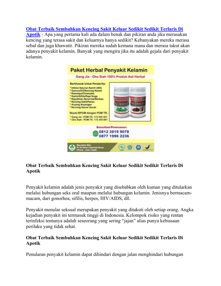 Obat Terbaik Sembuhkan Kencing Sakit Keluar Sedikit Sedikit Terlaris Di Apotik - Apa yang pertama kali ada dalam benak dan pikiran anda jika merasakan kencing yang terasa sakit dan keluarnya hanya sedikit? Kebanyakan mereka merasa sebal dan juga khawatir. Pikiran mereka sudah kemana mana dan merasa takut akan adanya penyakit kelamin. Banyak yang mengira jika itu adalah gejala dari penyakit kelamin. Obat Terbaik Sembuhkan Kencing Sakit Keluar Sedikit Sedikit Terlaris Di Apotik Penyakit kelamin adalah jenis penyakit yang disebabkan oleh kuman yang ditularkan melalui hubungan seks oral maupun melalui hubungan kelamin. Jenisnya bermacammacam, dari gonorhea, sifilis, herpes, HIV/AIDS, dll. Penyakit menular seksual merupakan penyakit yang ditakuti oleh setiap orang. Angka kejadian penyakit ini termasuk tinggi di Indonesia. Kelompok risiko yang rentan terinfeksi tentunya adalah seseorang yang sering “jajan” alias punya kebiasaan perilaku yang tidak sehat. Obat Terbaik Sembuhkan Kencing Sakit Keluar Sedikit Sedikit Terlaris Di Apotik Penularan penyakit kelamin dapat dihindari dengan jalan menghindari hubungan kelamin secara sembarangan (seks bebas), dengan setia kepada satu orang pasangan saja, atau dengan menggunakan alat-alat pencegahan seperti kondom. HIV/AIDS dapat pula ditulari melalui penggunaan jarum suntik yang telah tercemar oleh kuman HIV/AIDS, misalnya seperti yang sering dilakukan oleh para pemakai obat bius. Sampai sekarang HIV/AIDS belum dapat disembuhkan. Obat-obatan yang diberikan kepada penderita HIV sampai sekarang baru mampu memperpanjang hidup si pasien. Gejala penyakit kelamin yang paling umum Tidak semua penyakit kelamin menunjukkan gejala khas, namun ciri-ciri di bawah ini bisa Anda jadikan petunjuk awal untuk dikonsultasikan lebih lanjut kepada dokter. Beberapa ciri penyakit kelamin yang paling umum adalah: 1. Perih atau sakit saat kencing Munculnya sensasi perih dan panas seperti terbakar ketika buang air kecil adalah gejala penyakit kelamin yang paling umum. Penyakit kelamin yang menyebabkan gejala ini termasuk: Klamidia Gonore Trikomoniasis Perhatikan juga adanya bercak darah pada urin. Namun, gejala ini juga bisa timbul akibat infeksi saluran kencing (ISK) atau batu ginjal. 2. Keluar cairan dari penis Penis seharusnya sama sekali tidak mengeluarkan cairan apa pun selain air mani saat ejakulasi dan urine saat berkemih. Maka jika Anda belakangan ini menyadari penis mengeluarkan cairan asing yang berbau amis atau busuk, kemungkinan menandakan gejala penyakit kelamin: Klamidia Gonore Trikomoniasis Jika Anda mengalami ciri penyakit kelamin ini, segera kunjungi dokter untuk mendapat diagnosis akurat. 3. Vagina terasa panas atau gatal Bacterial vaginosis dan kutu kemaluan bisa menyebabkan rasa gatal di vagina. Namun, gejala ini tidak selalu diakibatkan oleh penyakit menular seksual. Vagina yang terasa panas terbakar atau gatal bisa jadi disebabkan oleh iritasi atau infeksi ragi. Walaupun begitu, jika Anda mendeteksi sensasi yang tidak biasa di sekitar vagina Anda, konsultasikan dengan dokter Anda. 4. Nyeri saat seks Ada banyak hal yang bisa menyebabkan rasa sakit saat berhubungan seks, tapi ini juga bisa menjadi ciri penyakit kelamin yang sering terlewatkan. Jika Anda mengalami sakit saat seks, konsultasikan dengan dokter jika rasa nyeri tersebut: Baru kali ini Anda alami Berubah (intensitas, lokasi, bentuk) Timbul setelah berganti pasangan seksual Timbul setelah berganti kebiasaan seksual Rasa sakit saat ejakulasi dapat juga diklasifikasikan sebagai gejala penyakit kelamin untuk pria. 5. Keputihan abnormal atau perdarahan vagina Keputihan yang berbau busuk atau berwarna selain putih jernih (hijau, kuning, abuabu, berbusa) dapat menjadi ciri penyakit kelamin umum. Namun, gejala ini juga dapat menandakan infeksi kelamin non-seksual seperti infeksi jamur vagina dan dan bacterial vaginosis. Gejala seperti ini juga bisa muncul sebagai gejala kanker. Keputihan akibat trikomoniasis biasanya berwarna hijau, berbusa, dan berbau tidak sedap. Keputihan akibat gonore umumnya berwarna kekuningan dengan noda darah. Jika Anda mengalami keputihan abnormal dan disertai perdarahan vagina di luar jadwal menstruasi, segera laporkan pada dokter. 6. Luka atau kutil kelamin Luka atau kutil yang muncul tiba-tiba di area genital tanpa penyebab jelas mungkin juga termasuk sebagai ciri penyakit kelamin menular berikut: Herpes genital HPV Sipilis Molloscum contagiosum Maka, segera konsultasikan dengan dokter bahkan jika benjolan sudah hilang sebelum Anda pergi ke dokter. Anda masih berpotensi mudah menyebarkan infeksi walaupun benjolan sudah kempis karena virus tetap berada dalam darah Anda. 7. Sakit panggul atau perut bagian bawah Nyeri panggul bisa diakibatkan oleh banyak kondisi kesehatan dan tidak selalu dikaitkan dengan gejala penyakit kelamin menular. Namun, salah satu penyebabnya adalah radang panggul. Radang panggul akan timbul ketika penyakit kelamin tidak kenjung diobati. Bakteri naik ke rahim dan perut Anda, menyebabkan peradangan dan luka jaringan parut. Sakit panggul jenis ini bisa amat menyakitkan, dan pada beberapa kasus dapat berujung fatal. Obat Terbaik Sembuhkan Kencing Sakit Keluar Sedikit Sedikit Terlaris Di Apotik Sebagian penyakit kelamin sudah dapat disembuhkan, tetapi untuk penyakit-penyakit tertentu seperti HIV/AIDS sampai kini belum ditemukan obatnya. Penyakit kelamin tertentu dapat disembuhkan dengan pengobatan yang teratur, misalnya dengan antibiotika. Namun, mutasi kuman dapat menghasilkan kumankuman yang kebal terhadap pengobatan yang diberikan, sehingga kemudian malah muncul varian yang lebih ganas seperti misalnya Vietnam rose yang muncul pada masa Perang Vietnam. Obat Infeksi Saluran Kemih (ISK) - Anyang Anyangan - Kencing Nanah/Gonore - Sipilis/Raja Singa - Klamidia - Penyakit Kelamin Herbal Alami Produk Herbal Gang Jie dan Gho Siah merupakan produk eksklusif dari De Nature. Gang Jie POM.TR 173 300 491 Gho Siah POM.TR 173 305 881 KOMPOSISI: Gang Jie : Orthosiphon 
