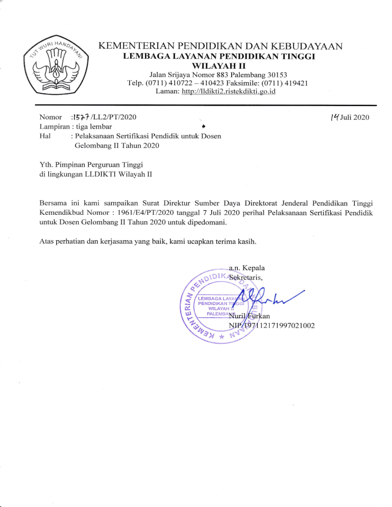 Kemendikbud Nomor : l96LlE4lPT/2020 tanggal 7 Juli 2020 perihal Pelaksanaan Sertifikasi Pendidik