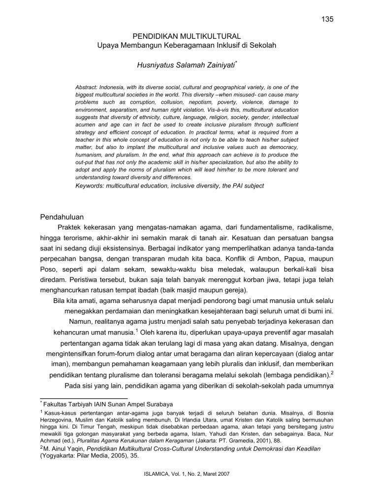 135 PENDIDIKAN MULTIKULTURAL Upaya Membangun Keberagamaan Inklusif di Sekolah Husniyatus Salamah Zainiyati* Abstract: Indonesia, with its diverse social, cultural and geographical variety, is one of the biggest multicultural societies in the world. This diversity –when misused- can cause many problems such as corruption, collusion, nepotism, poverty, violence, damage to environment, separatism, and human right violation. Vis-à-vis this, multicultural education suggests that diversity of ethnicity, culture, language, religion, society, gender, intellectual acumen and age can in fact be used to create inclusive pluralism through sufficient strategy and efficient concept of education. In practical terms, what is required from a teacher in this whole concept of education is not only to be able to teach his/her subject matter, but also to implant the multicultural and inclusive values such as democracy, humanism, and pluralism. In the end, what this approach can achieve is to produce the out-put that has not only the academic skill in his/her specialization, but also the ability to adopt and apply the norms of pluralism which will lead him/her to be more tolerant and understanding toward diversity and differences. Keywords: multicultural education, inclusive diversity, the PAI subject Pendahuluan Praktek kekerasan yang mengatas-namakan agama, dari fundamentalisme, radikalisme, hingga terorisme, akhir-akhir ini semakin marak di tanah air. Kesatuan dan persatuan bangsa saat ini sedang diuji eksistensinya. Berbagai indikator yang memperlihatkan adanya tanda-tanda perpecahan bangsa, dengan transparan mudah kita baca. Konflik di Ambon, Papua, maupun Poso, seperti api dalam sekam, sewaktu-waktu bisa meledak, walaupun berkali-kali bisa diredam. Peristiwa tersebut, bukan saja telah banyak merenggut korban jiwa, tetapi juga telah menghancurkan ratusan tempat ibadah (baik masjid maupun gereja). Bila kita amati, agama seharusnya dapat menjadi pendorong bagi umat manusia untuk selalu menegakkan perdamaian dan meningkatkan kesejahteraan bagi seluruh umat di bumi ini. Namun, realitanya agama justru menjadi salah satu penyebab terjadinya kekerasan dan kehancuran umat manusia.1 Oleh karena itu, diperlukan upaya-upaya preventif agar masalah pertentangan agama tidak akan terulang lagi di masa yang akan datang. Misalnya, dengan mengintensifkan forum-forum dialog antar umat beragama dan aliran kepercayaan (dialog antar iman), membangun pemahaman keagamaan yang lebih pluralis dan inklusif, dan memberikan pendidikan tentang pluralisme dan toleransi beragama melalui sekolah (lembaga pendidikan).2 Pada sisi yang lain, pendidikan agama yang diberikan di sekolah-sekolah pada umumnya * Fakultas Tarbiyah IAIN Sunan Ampel Surabaya 1 Kasus-kasus pertentangan antar-agama juga banyak terjadi di seluruh belahan dunia. Misalnya, di Bosnia Herzegovina, Muslim dan Katolik saling membunuh. Di Irlandia Utara, umat Kristen dan Katolik saling bermusuhan hingga kini. Di Timur Tengah, meskipun tidak disebabkan perbedaan agama, akan tetapi yang bersitegang justru mewakili tiga golongan masyarakat yang berbeda agama, Islam, Yahudi dan Kristen, dan sebagainya. Baca, Nur Achmad (ed.), Pluralitas Agama Kerukunan dalam Keragaman (Jakarta: PT. Gramedia, 2001), 88. 2 M. Ainul Yaqin, Pendidikan Multikultural Cross-Cultural Understanding untuk Demokrasi dan Keadilan (Yogyakarta: Pilar Media, 2005), 35. ISLAMICA, Vol. 1, No. 2, Maret 2007 136 Pendidikan Multikultural: Upaya Membangun Keberagamaan Inklusif di Sekolah juga tidak menghidupkan pendidikan multikultural yang baik, bahkan cenderung berlawanan. Akibatnya konflik sosial sering kali diperkeras oleh adanya legitimasi keagamaan yang diajarkan dalam pendidikan agama di sekolah-sekolah daerah yang rawan konflik. Hal ini membuat konflik mempunyai akar dalam keyakinan keagamaan yang fundamental sehingga konflik sosial kekerasan semakin sulit diatasi, karena dipahami sebagai bagian dari panggilan agamanya.3 Realita tersebut menunjukkan bahwa pendidikan agama baik di sekolah umum maupun sekolah agama lebih bercorak eksklusif, yaitu agama diajarkan dengan cara menafikan hak hidup agama lain, seakan-akan hanya agamanya sendiri yang benar dan mempunyai hak hidup, sementara agama yang lain salah, tersesat dan terancam hak hidupnya, baik di kalangan mayoritas maupun minoritas. Seharusnya pendidikan agama dapat dijadikan sebagai wahana untuk mengembangkan moralitas universal yang ada dalam agama-agama sekaligus mengembangkan teologi inklusif dan pluralis. Berkaitan dengan hal ini, maka penting bagi institusi pendidikan dalam masyarakat yang multikultur untuk mengajarkan perdamaian dan resolusi konflik seperti yang ada dalam pendidikan multikultural Pendidikan Muktikultural Akar pendidikan multikultural, berasal dari perhatian seorang pakar pendidikan Amerika Serikat, Prudence Crandall (18-3-1890) yang secara intensif menyebarkan pandangan tentang arti penting latar belakang peserta didik, baik ditinjau dari aspek budaya, etnis, dan agamanya. Pendidikan yang memperhatikan secara sungguh-sungguh latar belakang peserta didik merupakan cikal bakal bagi munculnya pendidikan multikultural.4 Secara etimologi istilah pendidikan multikultural terdiri dari dua term, yaitu pendidikan dan multikultural. Pendidikan berarti proses pengembangan sikap dan tata laku seseorang atau kelompok dalam usaha mendewasakan melalui pengajaran, pelatihan, proses dan cara mendidik. Dan multikultural diartikan sebagai keragaman kebudayaan, aneka kesopanan. Sedangkan secara terminologi, pendidikan multikultural berarti proses pengembangan seluruh potensi manusia yang menghargai pluralitas dan heterogenitasnya sebagai konsekwensi keragaman budaya, etnis, suku dan aliran (agama). Pengertian seperti ini mempunyai implikasi yang sangat luas dalam pendidikan, karena pendidikan dipahami sebagai proses tanpa akhir atau proses sepanjang hayat. Dengan demikian, pendidikan multikultural menghendaki penghormatan dan penghargaan setinggi-ti