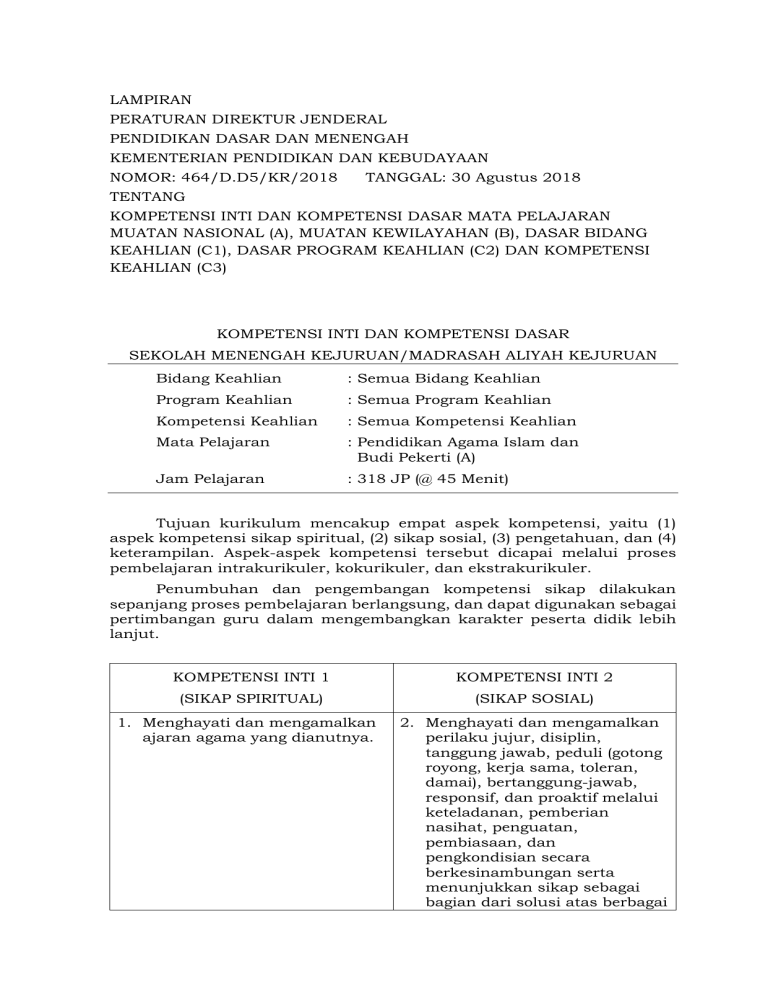 LAMPIRAN PERATURAN DIREKTUR JENDERAL PENDIDIKAN DASAR DAN MENENGAH KEMENTERIAN PENDIDIKAN DAN KEBUDAYAAN NOMOR: 464/D.D5/KR/2018 TANGGAL: 30 Agustus 2018 TENTANG KOMPETENSI INTI DAN KOMPETENSI DASAR MATA PELAJARAN MUATAN NASIONAL (A), MUATAN KEWILAYAHAN (B), DASAR BIDANG KEAHLIAN (C1), DASAR PROGRAM KEAHLIAN (C2) DAN KOMPETENSI KEAHLIAN (C3) KOMPETENSI INTI DAN KOMPETENSI DASAR SEKOLAH MENENGAH KEJURUAN/MADRASAH ALIYAH KEJURUAN Bidang Keahlian : Semua Bidang Keahlian Program Keahlian : Semua Program Keahlian Kompetensi Keahlian : Semua Kompetensi Keahlian Mata Pelajaran : Pendidikan Agama Islam dan Budi Pekerti (A) Jam Pelajaran : 318 JP (@ 45 Menit) Tujuan kurikulum mencakup empat aspek kompetensi, yaitu (1) aspek kompetensi sikap spiritual, (2) sikap sosial, (3) pengetahuan, dan (4) keterampilan. Aspek-aspek kompetensi tersebut dicapai melalui proses pembelajaran intrakurikuler, kokurikuler, dan ekstrakurikuler. Penumbuhan dan pengembangan kompetensi sikap dilakukan sepanjang proses pembelajaran berlangsung, dan dapat digunakan sebagai pertimbangan guru dalam mengembangkan karakter peserta didik lebih lanjut. KOMPETENSI INTI 1 KOMPETENSI INTI 2 (SIKAP SPIRITUAL) (SIKAP SOSIAL) 1. Menghayati dan mengamalkan ajaran agama yang dianutnya. 2. Menghayati dan mengamalkan perilaku jujur, disiplin, tanggung jawab, peduli (gotong royong, kerja sama, toleran, damai), bertanggung-jawab, responsif, dan proaktif melalui keteladanan, pemberian nasihat, penguatan, pembiasaan, dan pengkondisian secara berkesinambungan serta menunjukkan sikap sebagai bagian dari solusi atas berbagai permasalahan dalam berinteraksi secara efektif dengan lingkungan sosial dan alam serta dalam menempatkan diri sebagai cerminan bangsa dalam pergaulan dunia. KOMPETENSI DASAR KOMPETENSI DASAR 1.1 Membaca al-Qur’an dengan meyakini bahwa kontrol diri (mujahadah an-nafs), prasangka baik (husnuzzan), dan persaudaraan (ukhuwah) adalah perintah agama 2.1 Menunjukkan perilaku kontrol diri (mujahadah annafs), prasangka baik (husnuzzan), dan persaudaraan (ukhuwah) sebagai implementasi perintah QS al-Anfal (8):72, QS al- Hujurat (49): 10 dan 12 serta Hadis terkait 1.2 Meyakini bahwa pergaulan bebas dan zina adalah dilarang agama 2.2 Menghindarkan diri dari pergaulan bebas dan perbuatan zina sebagai pengamalan QS al-Isra’ (17): 32, dan QS an-Nur (24): 2, serta Hadis terkait 1.3 Meyakini bahwa Allah Maha Mulia, Maha Memberi Rasa Aman, Maha Memelihara, Maha Sempurna Kekuatan-Nya, Maha Penghimpun, Maha Adil, dan Maha Akhir 2.3 Memiliki sikap keluhuran budi; kokoh pendirian, pemberi rasa aman, tawakal dan adil sebagai implementasi pemahaman al-Asmau al-Husna: AlKarim, Al-Mu’min, Al-Wakil, Al- Matin, Al-Jami’, Al-‘Adl, dan Al-Akhir 1.4 Meyakini keberadaan malaikat-malaikat Allah swt 2.4 Menunjukkan sikap disiplin, jujur dan bertanggung jawab, sebagai implementasi beriman kepada malaikatmalaikat Allah swt 1.5 Terbiasa berpakaian sesuai dengan syariat Islam 2.5 Menunjukkan perilaku berpakaian sesuai dengan syariat Islam 1.6 Meyakini bahwa jujur adalah ajaran pokok agama 2.6 Menunjukkan perilaku jujur dalam kehidupan seharihari 1.7 Meyakini bahwa menuntut ilmu adalah perintah Allah dan RasulNya 2.7 Memiliki sikap semangat keilmuan sebagai implementasi pemahaman QS at-Taubah (9): 122 dan Hadis terkait 1.8 Meyakini al-Qur’an, Hadis dan ijtihad sebagai sumber hukum Islam 2.8 Menunjukkan perilaku ikhlas dan taat beribadah sebagai implementasi pemahaman terhadap kedudukan al-Qur’an, Hadis, dan ijtihad sebagai sumber hukum Islam KOMPETENSI DASAR KOMPETENSI DASAR 1.9 Meyakini bahwa haji, zakat dan wakaf adalah perintah Allah dapat memberi kemaslahatan bagi individu dan masyarakat 2.9 Menunjukkan kepedulian sosial sebagai hikmah dari perintah haji, zakat, dan wakaf 1.10 Meyakini kebenaran dakwah Nabi Muhammad saw di Makkah 2.10 Bersikap tangguh dan rela berkorban menegakkan kebenaran sebagai ’ibrah dari sejarah strategi dakwah Nabi di Makkah 1.11 Meyakini kebenaran dakwah Nabi Muhammad saw di Madinah 2.11 Menunjukkan sikap semangat ukhuwah dan kerukunan sebagai ibrah dari sejarah strategi dakwah Nabi di Madinah 1.12 Terbiasa membaca alQur’an dengan meyakini bahwa taat pada aturan, kompetisi dalam kebaikan, dan etos kerja sebagai perintah agama 2.12 Bersikap taat aturan, tanggung jawab, kompetitif dalam kebaikan dan kerja keras sebagai implementasi dari pemahaman QS al Maidah (5): 48; QS an-Nisa (4): 59; dan QS at-Taubah (9): 105 serta Hadis yang terkait 1.13 Meyakini bahwa agama mengajarkan toleransi, kerukunan, dan menghindarkan diri dari tindak kekerasan 2.13 Bersikap toleran, rukun, dan menghindarkan diri dari tindak kekerasan sebagai implementasi pemahaman QS Yunus (10): 40-41 dan QS al-Maidah (5): 32, serta Hadis terkait 1.14 Meyakini adanya kitabkitab suci Allah swt 2.14 Peduli kepada orang lain dengan saling menasihati sebagai cerminan beriman kepada kitab-kitab Allah swt 1.15 Meyakini adanya rasulrasul Allah swt 2.15 Menunjukkan perilaku saling menolong sebagai cerminan beriman kepada rasul-rasul Allah swt 1.16 Meyakini bahwa Islam mengharus-kan umatnya untuk memiliki sifat syaja’ah (berani membela kebenaran) dalam mewujudkan kejujuran 2.16 Menunjukkan sikap syaja’ah (berani membela kebenaran) dalam mewujudkan kejujuran 1.17 Meyakini bahwa hormat dan patuh kepada 2.17 Menunjukkan perilaku hormat dan patuh kepada KOMPETENSI DASAR KOMPETENSI DASAR orangtua dan guru sebagai kewajiban agama orangtua dan guru sebagai implementasi pemahaman QS al-Isra’ (17): 23 dan Hadis terkait 1.18 Menerapkan penyelenggaraan jenazah sesuai dengan ketentuan syariat Islam 2.18 Menunjukkan sikap tanggung jawab dan kerja sama dalam penyelenggaraan perawatan jenazah di masyarakat 1.19 Menerapkan ketentuan khutbah, tablig, dan dakwah di masyarakat sesuai dengan syariat Islam 2.19 Menjaga kebersamaan dengan orang lain dengan saling menasihati melalui khutbah, tablig, dan dakwah 1.20 Menerapkan prinsip ekonomi dan muamalah sesuai dengan ketentuan sy
