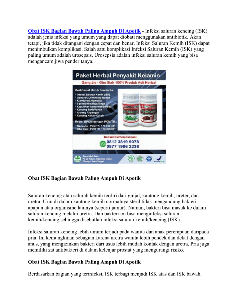 Obat ISK Bagian Bawah Paling Ampuh Di Apotik - Infeksi saluran kencing (ISK) adalah jenis infeksi yang umum yang dapat diobati menggunakan antibiotik. Akan tetapi, jika tidak ditangani dengan cepat dan benar, Infeksi Saluran Kemih (ISK) dapat menimbulkan komplikasi. Salah satu komplikasi Infeksi Saluran Kemih (ISK) yang paling umum adalah urosepsis. Urosepsis adalah infeksi saluran kemih yang bisa mengancam jiwa penderitanya. Obat ISK Bagian Bawah Paling Ampuh Di Apotik Saluran kencing atau salurah kemih terdiri dari ginjal, kantong kemih, ureter, dan uretra. Urin di dalam kantong kemih normalnya steril tidak mengandung bakteri apapun atau organisme lainnya (seperti jamur). Namun, bakteri bisa masuk ke dalam saluran kencing melalui uretra. Dan bakteri ini bisa menginfeksi saluran kemih/kencing sehingga disebutlah infeksi saluran kemih/kencing (ISK). Infeksi saluran kencing lebih umum terjadi pada wanita dan anak perempuan daripada pria. Ini kemungkinan sebagian karena uretra wanita lebih pendek dan dekat dengan anus, yang mengizinkan bakteri dari usus lebih mudah kontak dengan uretra. Pria juga memiliki zat antibakteri di dalam kelenjar prostat yang mengurangi risiko. Obat ISK Bagian Bawah Paling Ampuh Di Apotik Berdasarkan bagian yang terinfeksi, ISK terbagi menjadi ISK atas dan ISK bawah. ISK atas merupakan infeksi yang terjadi di bagian atas kandung kemih, yaitu di ginjal dan ureter. Sedangkan ISK bawah adalah infeksi pada kandung kemih bagian bawah, yaitu kandung kemih dan uretra. ISK atas lebih berbahaya dan dapat memicu urosepsis, yaitu kondisi ketika bakteri di ginjal yang terinfeksi menyebar ke darah. Urosepsis bisa mengakibatkan tekanan darah turun hingga syok, bahkan kematian. Gejala dan Tanda Infeksi saluran kemih tidak selalu menunjukkan tanda-tanda atau gejala yang berat. Gejala yang timbul pun dapat berbeda antara infeksi saluran kemih bawah dan atas. Infeksi saluran kemih bawah yang melibatkan kandung kemih dan uretra biasanya ditandai dengan adanya: Terasa panas seperti terbakar saat berkemih Dorongan kuat dan persisten untuk berkemih secara tiba-tiba Rasa nyeri atau tidak nyaman saat berkemih Rasa tidak tuntas atau terasa ada yang tertinggal saat berkemih Anyang-anyangan Kekeruhan pada air seni Perubahan warna air seni menjadi merah, merah muda terang, atau kecoklatan Aroma air seni yang menyengat Nyeri pada perut bawah, terutama dialami pada wanita Rasa pegal dan mudah lelah Sedangkan, tanda dan gejala yang umumnya terjadi pada infeksi saluran kemih atas yang melibatkan organ ginjal dan ureter adalah: Demam dengan suhu di atas 38oC Nyeri pada pinggang Menggigil Agitasi dan rasa tidak nyaman pada tubuh Penyebab Infeksi merupakan penyebab penyakit ini. Penyebab terbesar adalah infeksi bakteri terutama bakteri Gram negatif. Bakteri Gram negatif tersebut antara lain adalah Escherichia coli, Proteus sp., Klebsiella sp., serta Enterobacter. Bakteri lain mencakup Enterococcus, Pseudomonas, dan Staphylococcus. Kuman Chlamydia dan Mycoplasma juga dapat menginfeksi saluran kemih. Pengobatan Infeksi Saluran Kemih Infeksi saluran kemih yang ringan umumnya ditangani dengan pemberian antibiotik yang diresepkan oleh dokter. Untuk infeksi saluran kemih yang berulang, dokter bisa saja meresepkan antibiotik untuk jangka waktu yang lebih lama. Selain itu, juga dibutuhkan evaluasi lebih lanjut untuk menentukan penyebab infeksi saluran kemih yang terjadi cukup sering atau berulang dalam waktu dekat. NOTE: Penggunaan antibiotik harus dengan resep dokter karena jika digunakan sembarangan bisa menyebabkan efek samping dan kekebalan bakteri terhadap antibiotik sehingga penyakit akan semakin parah dan susah disembuhkan. Selain itu juga bisa membunuh bakteri baik yang dibutuhkan tubuh. Obat Infeksi Saluran Kemih (ISK) - Anyang Anyangan - Kencing Nanah/Gonore - Sipilis/Raja Singa - Klamidia - Penyakit Kelamin Herbal Alami Untuk informasi lebih lanjut mengenai Produk dan Harga, Cara Pemesanan/ Konsultasi atau hal lainnya, anda dapat menghubungi kami melalui Telpon/WhatsApp/SMS (Online 24 jam / Fast Respon) pada nomor yang tertera pada gambar obat di atas. Penelusuran yang terkait dengan Obat ISK Bagian Bawah Paling Ampuh Di Apotik : obat isk di apotik tanpa resep dokter, harga obat infeksi saluran kemih di apotik, merk obat anyang anyangan di apotik, obat kencing sakit di apotik, bisakah infeksi saluran kencing sembuh tanpa obat, obat infeksi saluran kencing pada wanita, obat isk untuk ibu hamil di apotik, obat infeksi saluran kencing pada pria