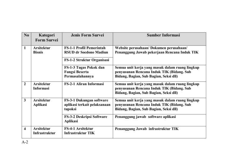 No 1 Kategori Form Survei Arsitektur Bisnis Jenis Form Survei FS-1-1 Profil Pemerintah RSUD dr Soedono Madiun Sumber Informasi Website perusahaan/ Dokumen perusahaan/ Penanggung Jawab pekerjaan Rencana Induk TIK FS-1-2 Struktur Organisasi FS-1-3 Tugas Pokok dan Fungsi Beserta Permasalahannya Semua unit kerja yang masuk dalam ruang lingkup penyusunan Rencana Induk TIK (Bidang. Sub Bidang, Bagian, Sub Bagian, Seksi dll) 2 Arsitektur Informasi FS-2-1 Aliran Informasi Semua unit kerja yang masuk dalam ruang lingkup penyusunan Rencana Induk TIK (Bidang. Sub Bidang, Bagian, Sub Bagian, Seksi dll) 3 Arsitektur Aplikasi FS-3-1 Dukungan software aplikasi terkait pelaksanaan tupoksi Semua unit kerja yang masuk dalam ruang lingkup penyusunan Rencana Induk TIK (Bidang. Sub Bidang, Bagian, Sub Bagian, Seksi dll) FS-3-2 Deskripsi Software Aplikasi Penanggung jawab software aplikasi FS-4-1 Arsitektur Infrastruktur TIK Penanggung Jawab infrastruktur TIK 4 A-2 Arsitektur Infrastruktur No 5 6 Kategori Form Survei Organisasi dan Manajemen Rencana Pengembangan TI Jenis Form Survei Sumber Informasi FS-4-2 Wide Area Network (WAN) Penanggung jawab WAN FS-4-3 Local Area Network (LAN) Penanggung Jawab LAN FS-4-4 Perangkat keras Penanggung Jawab Perangkat Keras TIK FS-4-5 Internet Survei Provider Penanggung jawab pengelola Internet FS-5-1 Kemampuan TI dari SDM Semua staf unit kerja yang masuk dalam ruang lingkup penyusunan Rencana Induk TIK (Bidang. Sub Bidang, Bagian, Sub Bagian, Seksi dll) FS-5-2 Peraturan dan Kebijakan TIK Penanggung Jawab peraturan dan kebijakan TIK FS-6-1 Rencana Pengembangan TIK Semua unit kerja yang masuk dalam ruang lingkup penyusunan Rencana Induk TIK (Bidang. Sub Bidang, Bagian, Sub Bagian, Seksi dll) A-3 A-4 FS-1-1 ARSITEKTUR BISNIS – PROFIL RSUD DR SOEDONO MADIUN Form Survei ini tidak perlu diisi jika sudah ada dokumen yang berisikan informasi yang diperlukan. 1. Nama 2. Visi 3. Misi 4. Strategi RSUD dr Soedono Madiun A-5 5. A-6 Program kerja Pimpinan FS-1-2 ARSITEKTUR BISNIS – STRUKTUR ORGANISASI Nama Unit Kerja : .................................................................................................................................................................................. ......................................................... A-7 Gambarkan Struktur Organisasi RSUD dr. Soedono Madiun. Jika sudah ada dokumen yang berisikan struktur organisasi tersebut, lampirkan saja dokumennya. A-8 FS-1-3 ARSITEKTUR BISNIS – TUGAS POKOK DAN FUNGSI BESERTA PERMASALAHANNYA Tuliskan permasalahan dan harapan yang berkaitan dengan masing-masing deskripsi pekerjaan. NAMA BAGIAN/ BIDANG/..... NAMA SUB BAGIAN/ SUB BIDANG/ SEKSI/ ... TUGAS POKOK DAN FUNGSI PERMASALAHAN HARAPAN TULISKAN PERMASALAHAN YANG BERKAITAN DENGAN PELAKSANAAN PEKERJAAN (MISAL KESULITAN PENCARIAN TULISKAN KEINGINAN MENDATANG SUPAYA PERMASALAHAN DAPAT TERATASI A-9 DATA, SERING LEMBUR UNTUK BUAT LAPORAN, KOMPUTER PERLU DIUPGRADE DSB) A-10 FS-2-1 ARSITEKTUR INFORMASI – ALIRAN INFORMASI Nama Bagian / Bidang / ...:..................................................................................................................................................................................... ................................................................. Nama Sub Bagian/ Sub Bidang / Seksi / ... : .......................................................................................................................................................................................... ................................... Tabel berikut diisi dengan tugas pokok dan fungsi beserta dokumen dan asal dokumen yang diperlukan untuk melaksanakan tugas pokok dan fungsi. Kolom berikutnya diisi dengan tindak lanjut terhadap dokumen/ laporan yang diterima dan apa saja dokumen yang dihasilkan dan dokumen yang dihasilkan diserahkan kepada siapa. Tugas Pokok dan Fungsi Nama Dokumen Input Bentuk Dokumen Input Unit Pengirim Dokumen/Laporan Tindak Lanjut Yang Dilakukan Setelah Menerima Nama Dokumen Output (Hasil Bentuk Dokumen Output Unit Penerima Dokumen Output A-11 Dokumen Tersebut A-12 Tindak Lanjut) FS-3-1 ARSITEKTUR APLIKASI – DUKUNGAN SOFTWARE APLIKASI TERKAIT PELAKSANAAN TUPOKSI A-13 Nama Bidang/ Bagian/..: .......................................................................................................................................................................................... .............................................................. Nama Sub Bidang/ Sub Bagian/ Seksi/.... : .......................................................................................................................................................................................... .................................... Tugas Pokok dan Fungsi Nama Software Aplikasi Yang Mendukung Pelaksanaan Tugas Pokok dan Fungsi (Jika Ada) dan versi aplikasi A-14 Fungsi Aplikasi Permasalahan Yang Berkaitan Dengan Software Aplikasi Harapan Yang Berkaitan Dengan Software Aplikasi FS-3-2 Nama Software Aplikasi Versi Aplikasi ARSITEKTUR APLIKASI – DESKRIPSI SOFTWARE APLIKASI Tahun Beli/ Buat/ Hibah/ Lainnya Status Aplikasi (Beli/ hibah/ sewa/ buat sendiri/ lainnya) Sistem Manajemen Basis Data Bahasa Pemrograman Yang Dipergunakan Fungsi Software Aplikasi A-15