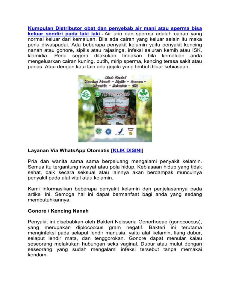 Kumpulan Distributor obat dan penyebab air mani atau sperma bisa keluar sendiri pada laki laki - Air urin dan sperma adalah cairan yang normal keluar dari kemaluan. Bila ada cairan yang keluar selain itu maka perlu diwaspadai. Ada beberapa penyakit kelamin yaitu penyakit kencing nanah atau gonore, sipilis atau rajasinga, infeksi saluran kemih atau ISK, klamidia. Perlu segera dilakukan tindakan bila kemaluan anda mengeluarkan cairan kuning, putih, mirip sperma, kencing terasa sakit atau panas. Atau dengan kata lain ada gejala yang timbul diluar kebiasaan. Layanan Via WhatsApp Otomatis [KLIK DISINI] Pria dan wanita sama sama berpeluang mengalami penyakit kelamin. Semua itu tergantung riwayat atau pola hidup. Kebiasaan hidup yang tidak sehat, baik secara seksual atau lainnya akan berdampak munculnya penyakit pada alat vital atau kelamin. Kami informasikan beberapa penyakit kelamin dan penjelasannya pada artikel ini. Semoga hal ini dapat bermanfaat bagi anda yang sedang membutuhkannya. Gonore / Kencing Nanah Penyakit ini disebabkan oleh Bakteri Neisseria Gonorhoeae (gonococcus), yang merupakan diplococcus gram negatif. Bakteri ini terutama menginfeksi pada selaput lendir manusia, yaitu alat kelamin, liang dubur, selaput lendir mata, dan tenggorokan. Gonore dapat menular kalau seseorang melakukan hubungan seks vaginal. Dubur atau mulut dengan seseorang yang sudah mengalami infeksi tersebut tanpa memakai kondom. Kencing nanah atau Gonore juga dapat tertular tidak saja dari kontak seksual. Bisa juga tertular dari fasilitas umum seperti kolam renang, wc umum, dan pakaian. Kami sarankan untuk secepatnya di obati karena jika tidak di tangani secara serius. Dapat memicu penaykit kelamin lainya seperti kanker prostat, atau kutil kelamin. Gejala Kencing Nanah atau Gonore Pada Pria: Gejala awal biasanya timbul dalam waktu 2-7 hari setelah terinfeksi, Nyeri dan perasaan tidak nyaman pada saluran kencing, Kemaluan keluar cairan nanah atau terkadang putih dan sebagian juga keluar darah, Jika keluar nanah nya banyak maka akan bisa keluar secara langsung. Tetapi ada juga yang keluar bersamaan dengan masturbasi. Atau bahkan hanya berupa bercak bercak putih/kuning di celana dalam biasanya terlihat saat bangun tidur dipagi hari, Sering buang air Kencing dan terasa terbakar atau sakit dan perih, walau sebagian orang tidak merasakan tanda-tanda ini, Ada juga yang merasakan anusnya gatal, pedih dan juga berdarah, Cairan putih bercampur nanah keluar dari penis, Terdapat bengkak dan merah pada penis, Penis Sakit Panas Nyeri Dan Keluar Cairan Putih, Bisa juga sakit di tenggorokan dan mata merah atau sakit mata. Gejala Kencing Nanah atau Gonore Pada Wanita: Kemungkinan besar yang terjadi pada wanita apabila terserang penyakit kencing nanah adalah. Tidak terlihat adanya tanda-tanda yang jelas atau spesifik. Akan tetapi biasanya ditemukan adanya Keputihan Abnormal yang berbeda dengan keputihan normal . Pada wanita, gejala awal bisa timbul dalam waktu 7-21 hari setelah terinfeksi, 80 % tidak menimbulkan gejala, Keluar cairan putih keruh kekuningan (Vaginal discharge), Nyeri abdomen Kronis, Nyeri saat kencing (disuria), Sakit tenggorokan jika terjadi infeksi pada tenggorokan disebabkan karena oral seks, Gatal gatal pada anus disertai keluar nanah jika terjadi infeksi pada daerah anus karena hubungan seks melalui anus, Pelvic Inflammatory Diseases (PID) = penyakit radang panggul. INFEKSI SALURAN KEMIH / ISK Infeksi saluran kemih / kencing (ISK) adalah infeksi bakteri yang mengenai bagian dari saluran kemih. Ketika mengenai saluran kemih bawah dinamai sistitis (infeksi kandung kemih) sederhana, dan ketika mengenai saluran kemih atas dinamai pielonefritis (infeksi ginjal). Gejala dari saluran kemih bawah meliputi buang air kecil terasa sakit dan sering buang air kecil atau desakan untuk buang air kecil (atau keduanya), sementara gejala pielonefritis meliputi demam dan nyeri panggul di samping gejala ISK bawah. Pada orang lanjut usia dan anak kecil, gejalanya bisa jadi samar atau tidak spesifik. Kuman tersering penyebab kedua tipe tersebut adalah Escherichia coli, tetapi bakteri lain, virus, maupun jamur dapat menjadi penyebab meskipun jarang. Sebagian besar kasus ISK disebabkan oleh bakteri Escherichia coli atau E. coli yang umumnya hidup di dalam saluran cerna. Bakteri ini masuk ke dalam saluran uretra seseorang ketika kurang baik dalam melakukan pembersihan setelah buang air besar maupun kecil. Misalnya pada saat kertas toilet yang dia gunakan untuk membersihkan anus turut menyentuh organ kelaminnya. Maka bakteri dapat masuk ke saluran kemih. Dalam kasus seperti ini wanita lebih rentan terkena ISK. Karena jarak uretra dengan anus pada tubuh mereka lebih dekat dan pintu uretra yang dekat dengan kandung kemih. Gejala Infeksi Saluran Kemih Bagian atas: #Demam dengan suhu tinggi lebih dari 38º C. #Menggigil tak terkendali. #Rasa mual ingin muntah. #Bahkan sampai muntah. #Buang air besar encer (diare). #Nyeri pada perut bagian bawah. Gejala Infeksi Saluran Kemih Bagian Bawah #Sindrom uretra: Sering buang air kecil atau dorongan ingin selalu buang air kecil. Rasa nyeri tumpul #yang konstan pada daerah kemaluan. Nyeri saat buang air kecil (disuria). #Air seni berawan atau bahkan ada darah dalam urin (hematuria). #Air seni berbau tak sedap. #Sakit punggung. #Secara umum merasa tidak sehat. Cara Mengobati Kencing Sakit - Infeksi Saluran Kemih (ISK) - Penyakit Kencing Nanah (Gonore) Layanan Via WhatsApp Otomatis [KLIK DISINI] 1 Paket Obat terdiri dari Gang Jie dan Gho Siah Harga 1 Paket Rp. 295.000,Produk Herbal Gang Jie dan Gho Siah merupakan produk eksklusif dari De Nature. - Gang Jie POM.TR 173 300 491 - Gho Siah POM.TR 173 305 881 KOMPOSISI: Gang Jie : - Orthosiphon stamineus folium 1250mg - Imperatae cylindrica rhozoma 625mg - Andrographis paniculata folium 625mg Gho Siah : - Lumbricus rubellus ekstrak 500mg BERKHASIAT UNTUK : - Mengobati Sipilis/Rajasinga/Gonore/Kencing Nanah - Sebagai Antivirus - Memperbaiki jaringan sel p