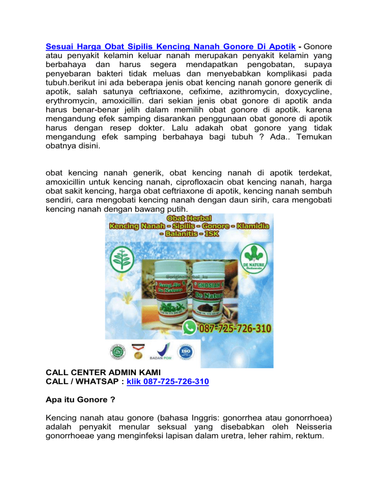 Sesuai Harga Obat Sipilis Kencing Nanah Gonore Di Apotik - Gonore atau penyakit kelamin keluar nanah merupakan penyakit kelamin yang berbahaya dan harus segera mendapatkan pengobatan, supaya penyebaran bakteri tidak meluas dan menyebabkan komplikasi pada tubuh.berikut ini ada beberapa jenis obat kencing nanah gonore generik di apotik, salah satunya ceftriaxone, cefixime, azithromycin, doxycycline, erythromycin, amoxicillin. dari sekian jenis obat gonore di apotik anda harus benar-benar jelih dalam memilih obat gonore di apotik. karena mengandung efek samping disarankan penggunaan obat gonore di apotik harus dengan resep dokter. Lalu adakah obat gonore yang tidak mengandung efek samping berbahaya bagi tubuh ? Ada.. Temukan obatnya disini. obat kencing nanah generik, obat kencing nanah di apotik terdekat, amoxicillin untuk kencing nanah, ciprofloxacin obat kencing nanah, harga obat sakit kencing, harga obat ceftriaxone di apotik, kencing nanah sembuh sendiri, cara mengobati kencing nanah dengan daun sirih, cara mengobati kencing nanah dengan bawang putih. CALL CENTER ADMIN KAMI CALL / WHATSAP : klik 087-725-726-310 Apa itu Gonore ? Kencing nanah atau gonore (bahasa Inggris: gonorrhea atau gonorrhoea) adalah penyakit menular seksual yang disebabkan oleh Neisseria gonorrhoeae yang menginfeksi lapisan dalam uretra, leher rahim, rektum. Gonore atau penyakit kencing nanah ialah penyakit infeksi bakteri menular seksual yang, jika tidak diobati, dapat menyebabkan infertilitas, Pemeriksaan rutin dapat membantu mendeteksi tanda-tanda keberadaan infeksi gonore meskipun tidak ada gejala. untuk Gejala gonore berupa nyeri buang air kecil, kelamin keluar nanah atau cairan putih, testis bengkak, sakit dan keluar cairan abnormal dari penis atau vagina. Pria mengalami nyeri di testis, sedangkan wanita mengalami nyeri di perut bagian bawah. Pada beberapa kasus, gonore tidak memiliki gejala. Untuk itu waspada penyakit gonore !! jangan melakukan hubungan seksual sembarang, orang yang aktif seksual dengan banyak pasangan sangat beresiko tertular penyakit gonore. Berikut ini beberapa gejala penyakit menular seksual sesuai jenis penyakitnya: Gejala Penyakit Menular Seksual Gejala yang dapat muncul akibat penyakit menular seksual akan berbeda-beda tergantung jenis penyakitnya, namun umumnya berupa: => Muncul benjolan, luka, atau lepuhan di sekitar penis, vagina, anus, atau mulut. => Vagina atau penis terasa gatal dan terbakar. => Nyeri ketika buang air kecil atau berhubungan intim. => Keluar cairan dari penis (kencing nanah) atau vagina (keputihan). => Nyeri perut bagian bawah. => Demam dan menggigil. obat sipilis => Muncul pembengkakan kelenjar getah bening atau benjolan di selangkangan. => Muncul ruam kulit di badan, tangan, atau kaki. => Kulit penis kering, ruam, dan kemerahan. => Selain beberapa gejala di atas, wanita juga bisa merasakan gejala lain, yaitu perdarahan di luar masa menstruasi dan muncul bau tidak sedap dari vagina. Ini juga merupakan salah satu tanda gejala penyakit kelamin wanita. Sementara pada pria, gejala lain penyakit menular seksual yang dapat dialami adalah nyeri, sperma berdarah, atau pembengkakan pada testis. Jenis Dan Nama Penyakit Yang Menular Seksual Penyakit menular seksual dapat disebabkan oleh infeksi bakteri, virus, jamur, dan parasit. Berikut ini adalah macam-macam penyakit menular seksual: 1. Sifilis Sifilis disebabkan oleh bakteri Treponema pallidum. Penyakit yang juga dikenal dengan sebutan “raja singa” ini menimbulkan luka pada alat kelamin atau mulut. Melalui luka inilah penularan akan terjadi. 2. Gonore Gonore, yang dikenal juga dengan kencing nanah, disebabkan oleh bakteri Neisseria gonorrhoeae. Penyakit ini menyebabkan keluarnya cairan dari penis atau vagina dan rasa nyeri ketika buang air kecil. Bakteri penyebab gonore juga dapat menimbulkan infeksi di bagian tubuh lain, jika terjadi kontak dengan sperma atau cairan vagina. pencegahan dan pengobatan sifilis 3. Human papillomavirus (HPV) Infeksi menular seksual ini disebabkan oleh virus dengan nama yang sama, yaitu HPV. Virus HPV dapat menyebabkan kutil kelamin hingga kanker serviks pada perempuan. Gejala kanker serviks stadium awal sering kali tidak khas bahkan tak bergejala. Penularan HPV terjadi melalui kontak langsung atau melakukan hubungan seksual dengan penderita. 4. Infeksi HIV Infeksi HIV disebabkan oleh human immunodeficiency virus yang menyerang sistem kekebalan tubuh. Penyebaran virus ini dapat terjadi melalui hubungan seks tanpa kondom, berbagi penggunaan alat suntik, transfusi darah, atau saat persalinan. 5. Chlamydia Penyakit infeksi menular seksual ini disebabkan oleh bakteri Chlamydia trachomatis. Pada wanita, chlamydia menyerang leher rahim. Sedangkan pada pria, menyerang saluran keluar urine di penis. Penularan dapat terjadi dari luka pada area kelamin. obat sipilis sekunder 6. Trikomoniasis Penyakt menular seksual ini disebabkan oleh parasit Trichomonas vaginalis. Penyakit trikomoniasis bisa menimbulkan keputihan pada wanita atau malah tidak menimbulkan gejala, sehingga sering kali seseorang secara tidak sadar menularkan penyakit ini ke pasangan seksualnya. 7. Hepatitis B dan hepatitis C Penyakit ini disebabkan oleh virus hepatitis, dan dapat mengakibatkan gangguan hati kronis hingga kanker hati. Virus ini ditemukan dalam darah atau cairan tubuh penderita. Selain melalui hubungan seksual, virus ini bisa menular melalui jarum suntik yang dipakai bersama dan transplantasi organ. 8. Tinea cruris Infeksi menular seksual yang disebabkan oleh jamur ini menyerang kulit di sekitar alat kelamin, paha bagian dalam, dan bokong. Tinea cruris ditandai dengan ruam merah yang terasa gatal pada kulit yang terinfeksi. Penularannya adalah melalui kontak langsung dengan penderita atau menyentuh benda yang telah terinfeksi. 9. Herpes genital Herpes genital disebabkan oleh infeksi virus. Virus ini bersifat tidak aktif atau bersembunyi di dalam tubuh tanpa menyebabkan gejala. Penyebarannya terjadi melalui kontak langs
