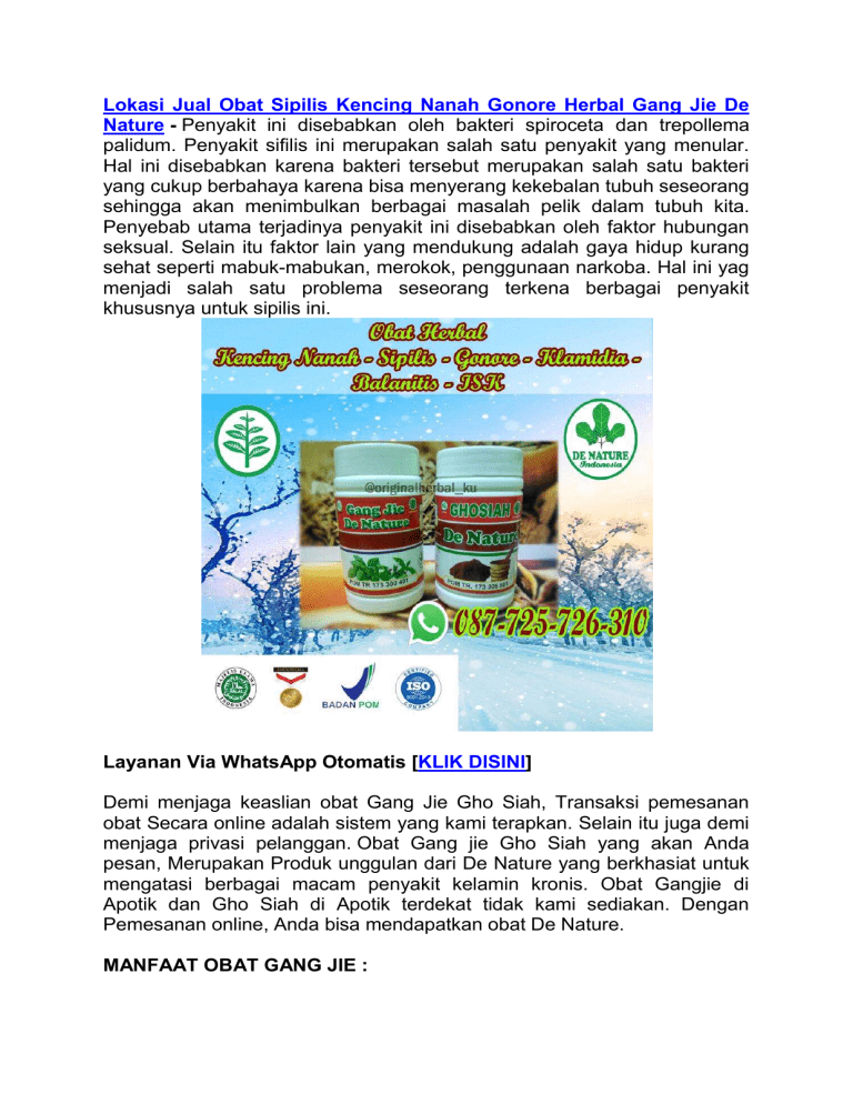 Lokasi Jual Obat Sipilis Kencing Nanah Gonore Herbal Gang Jie De Nature - Penyakit ini disebabkan oleh bakteri spiroceta dan trepollema palidum. Penyakit sifilis ini merupakan salah satu penyakit yang menular. Hal ini disebabkan karena bakteri tersebut merupakan salah satu bakteri yang cukup berbahaya karena bisa menyerang kekebalan tubuh seseorang sehingga akan menimbulkan berbagai masalah pelik dalam tubuh kita. Penyebab utama terjadinya penyakit ini disebabkan oleh faktor hubungan seksual. Selain itu faktor lain yang mendukung adalah gaya hidup kurang sehat seperti mabuk-mabukan, merokok, penggunaan narkoba. Hal ini yag menjadi salah satu problema seseorang terkena berbagai penyakit khususnya untuk sipilis ini. Layanan Via WhatsApp Otomatis [KLIK DISINI] Demi menjaga keaslian obat Gang Jie Gho Siah, Transaksi pemesanan obat Secara online adalah sistem yang kami terapkan. Selain itu juga demi menjaga privasi pelanggan. Obat Gang jie Gho Siah yang akan Anda pesan, Merupakan Produk unggulan dari De Nature yang berkhasiat untuk mengatasi berbagai macam penyakit kelamin kronis. Obat Gangjie di Apotik dan Gho Siah di Apotik terdekat tidak kami sediakan. Dengan Pemesanan online, Anda bisa mendapatkan obat De Nature. MANFAAT OBAT GANG JIE : Obat Gang Jie Gho Siah dari De Nature memiliki banyak sekali keampuhan. Khususnya untuk penyakit yang sedang Anda derita saat ini. Berikut Ini Khasiat utama Obat Gang Jie: => Obat sipilis => Obat Kencing Nanah => Obat Gonore => Obat Kutil Kelamin => Keputihan Abnormal => Obat Klamedia => Obat Infeksi Saluan Kemih KHASIAT OBAT GANG JIE : 1. Antibiotik alami yang aman Gang jie berkhasiat sebagai anti biotik paling aman. Sebagai anti bakteri dan anti fungsi. Produk ini sangat sempurna untuk pengobata sipilis dan untuk antibodi terhadap virus gonore. Dan terbukti sangat mujarab untuk membunuh akar dari penyakit sipilis. 2. Anti Bakteri Gho siah sangat berkhasiat untuk infeksi lanjutan dari virus sipilis yang sudah menyebar kejaringan tubuh. Sangat baik untuk sipilis karena cepat membunuh bakteri yang terus berkembang dalam tubuh. Gho siah sebagai pereda rasa sakit karena kencing nanah. Dancepat membersihkan kotoran/nanah dan mempercepat masa penyembuhan. 3. Menghilangkan Gejala penyakit Ketika terserang penyakit sipilis ayau penyakit kelamin akan menimbulkan gejala penyakit yang lainya. Gang jie dan gho siah akan menangkal semua gejala tersebut. Karen sifat dari obat De Nature menjaga tubuh tetap prima. 4. Regeneresi Sel Khasiat obat herbal gang jie dan gho siah adalah sangat cepat meregenerasi sel tubuh yang rusak, membantu imunitas tubuh supaya cepat stabil kembali. Sangat baik untuk mempercepat masa pemulihan kondisi badan yang rusak karena sipilis. Sedangkan untuk khasiat Paket lengkap De Nature sebagai berikut: Khasiat obat Gang Jie, Gho Siah, Pipeca, Kapsul Bersih Darah dan Salep plus : Kapsul Gang Jie -> Sangat bagus untuk memulihkan stamina, memperbaiki jaringan sel pada bagian uretic dan menjaga kesehatan tubuh. Kapsul Gho Shiah -> Sangat bagus untuk anti virus, mengobati infeksi pada saluran kencing dan menjaga kesehatan tubuh. Kapsul Pipeca -> atau disebut juga kapsul sirih merah untuk mengobati radang pada kelamin yang diakibatkan infeksi jamur, virus dan bakteri. Daun sirih merah berfungsi sebagai antioksidan sekaligus antiseptik alami yang dapat mencegah dan melawan virus dan jamur penyebab infeksi kelamin. Kapsul Bersih Darah -> berkhasiat menormalkan tekanan darah, menghancurkan kolesterol, membersihkan darah dan meregenerasi sel-sel darah merah, mengobati penyakit kulit dan gatal. Salep Plus -> Sebagai salep anti radang dan mengobati luka akibat infeksi pada kelamin. Layanan Via WhatsApp Otomatis [KLIK DISINI] KOMPOSISI OBAT GANG JIE : Komposisi obat Gang Jie. Obat Gang Jie dan Gho Siah merupakan produk eksklusif dari De Nature Indonesia. Kedua produk sudah resmi terdaftar di BPOM, Gang Jie POM.TR 173 300 491 dan Gho Siah POM.TR 173 305 881. Kandungan dalam Obat Gang Jie : Orthosiphon Stamineus Folium, Imperatae cylindrica rhozoma, Andrographis paniculata folium. Dan Gho Siah mengandung Lumbricus rubellus. Harga ASLI Obat Sipilis De Nature : Paket Obat Gang jie dan Ghosiah di Apotik Online De Nature dikenal karena sangat terjangkau, Berikut harga paket obat gang jie De Nature : 1. Paket Obat Sipilis, Kencing nanah, Gonore Paket Utama : 1 Botol Obat Gang Jie 1 Botol Obat Gho Siah Harga : Rp. 295.000,Paket Ampuh: 1 Botol Obat Gang Jie 1 Botol Obat Gho Siah 1 Botol Obat Pipeca 1 Botol Obat Bersih Darah Harga : Rp. 550.000,2. Paket Obat Kutil Kelamin Paket Ampuh: 1 Botol Obat Gang Jie 1 Botol Obat Gho Siah 1 Botol Obat Pipeca 1 Botol Obat Bersih Darah 1 Botol Salep Dji De Nature 1 Botol Anpiloma Harga : Rp. 950.000,ATURAN PAKAI OBAT : Aturan Pakai Obat Gang Jie De Nature Sangat Mudah. Cara Minum Obat Gang Jie dan Gho Siah tidak akan membuat Anda kerepotan lagi. Berikut aturan pakainya. Obat Gang Jie di Konsumsi 2 kapsul sekali konsumsi Dikonsumsi 1 jam Sebelum makan Gunakan air hangat untuk konsumsinya De Nature Indonesia menciptakan obat gang memang untuk Anda. Mengatasi berbagai macam penyakit kelamin. Silahkan Lakukan pemesanan Hanya di disini. Karena obat gang Jie De Nature tidak dijual di Toko, Agen, Cabang Atau Apotik dimanapun. Anda dapat Mendapatkan obat gang jie dan Gho Siah ASLI dari sistem online Hanya DISINI. Hubungi kami dan Dapatkan Paket Obatnya sekarang juga.