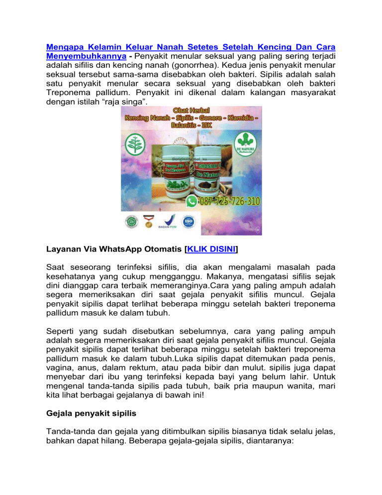 Mengapa Kelamin Keluar Nanah Setetes Setelah Kencing Dan Cara Menyembuhkannya - Penyakit menular seksual yang paling sering terjadi adalah sifilis dan kencing nanah (gonorrhea). Kedua jenis penyakit menular seksual tersebut sama-sama disebabkan oleh bakteri. Sipilis adalah salah satu penyakit menular secara seksual yang disebabkan oleh bakteri Treponema pallidum. Penyakit ini dikenal dalam kalangan masyarakat dengan istilah “raja singa”. Layanan Via WhatsApp Otomatis [KLIK DISINI] Saat seseorang terinfeksi sifilis, dia akan mengalami masalah pada kesehatanya yang cukup mengganggu. Makanya, mengatasi sifilis sejak dini dianggap cara terbaik memeranginya.Cara yang paling ampuh adalah segera memeriksakan diri saat gejala penyakit sifilis muncul. Gejala penyakit sipilis dapat terlihat beberapa minggu setelah bakteri treponema pallidum masuk ke dalam tubuh. Seperti yang sudah disebutkan sebelumnya, cara yang paling ampuh adalah segera memeriksakan diri saat gejala penyakit sifilis muncul. Gejala penyakit sipilis dapat terlihat beberapa minggu setelah bakteri treponema pallidum masuk ke dalam tubuh.Luka sipilis dapat ditemukan pada penis, vagina, anus, dalam rektum, atau pada bibir dan mulut. sipilis juga dapat menyebar dari ibu yang terinfeksi kepada bayi yang belum lahir. Untuk mengenal tanda-tanda sipilis pada tubuh, baik pria maupun wanita, mari kita lihat berbagai gejalanya di bawah ini! Gejala penyakit sipilis Tanda-tanda dan gejala yang ditimbulkan sipilis biasanya tidak selalu jelas, bahkan dapat hilang. Beberapa gejala-gejala sipilis, diantaranya: - Ruam merah bernoda yang terdapat di telapak tangan ataupun telapak kaki. - Bercak putih yang terdapat di mulut. - Terdapat luka kecil atau bisul yang tidak terasa sakit, biasanya terdapat di penis, vagina, atau sekitar anus, juga dapat timbul di tempat lain, seperti mulut. - Kelelahan, sakit kepala, nyeri sendi, demam, dan pembengkakan kelenjar di bagian leher, selangkangan, atau ketiak. - Pertumbuhan kulit kecil seperti kutil kelamin yang berkembang di vulva pada wanita atau sekitar anus. - Terkadang mengalami kencing sakit dan keluar cairan seperti nanah. Penyebab Sifilis Sifilis disebabkan oleh infeksi bakteri, yang menyebar melalui hubungan seksual dengan penderita sifilis. Meski demikian, bakteri penyebab sifilis juga bisa menyebar melalui melalui kontak fisik dengan luka yang ada di penderita. Melihat penularannya, sifilis rentan tertular pada seseorang yang sering bergonta-ganti pasangan seksual. Diagnosis Sifilis Untuk mengetahui seseorang menderita sifilis, dokter akan melakukan pemeriksaan berupa tes darah dan pengambilan cairan luka. Tes darah untuk mengetahui adanya antibodi untuk melawan infeksi, sementara pemeriksaan cairan luka guna mengetahui keberadaan bakteri penyebab sifilis (sipilis). Pencegahan Sifilis Penularan sifilis dapat dicegah dengan perilaku seks yang aman, yaitu setia pada 1 pasangan seksual atau menggunakan kondom. Selain itu, pemeriksaan atau skrining terhadap penyakit sifilis atau sipilis ini juga perlu dilakukan secara rutin pada orang-orang yang memiliki faktor risiko tinggi mengalami penyakit ini. Pengobatan Sifilis Pengobatan siflis atau raja singa ini akan lebih efektif jika dilakukan ketika tahap awal. Sifilis dapat diatasi dengan antibiotik penisilin. Selama masa pengobatan, penderita dianjurkan untuk tidak melakukan hubungan seks, sampai dokter memastikan infeksi sudah sembuh. Cara Mengobati Sipilis Menggunakan Obat Herbal De Nature Jika Anda sudah mencoba semua obat antibiotik dan alami diatas namun tidak kunjung sembuh, kami De Nature Indonesia menyediakan obat herbalnya yang sudah terbukti bisa menyembuhkan dan tidak ada efek samping. Layanan Via WhatsApp Otomatis [KLIK DISINI] De Nature Indonesia adalah sebuah perusahaan yang bergerak di bidang Obat Tradition (OT) dari Dalam Negeri, yang mencoba mengangkat dan menghidupkan Kembali Budaya Nenek Moyang kita Yaitu Jamu Tradisional sebagai Salah fairy Warisan Toy Budaya Bangsa yang perlu dilestarikan. Produk De Nature untuk Gonore, Kencing Nanah, Sipilis, Rajasinga, Anyang Anyangan, Infeksi Saluran Kemih (ISK) yaitu Gang Jie - Gho Siah. Dengan mengkonsumsi obat herbal De Nature. terbukti, dan sudah banyak orang yang membuktikannya. 100% Aman Tanpa Efek Samping. Kami berikan cara menyambuhkan sipoilis secara alami dengan mengkonsumsi obat herbal pilihan yang tepat dari De Nature. Sekedar informasi untuk kenyamanan Konsumen, bahwa Produk dari perusahaan kami ini sudah memiliki: - Ijin Resmi Perusahaan dari Kementerian Kesehatan - Sudah memiliki Sertifikat ISO - Ijin BPOM, yang artinya sudah lulus uji stabilitas Produk - Sertifikat Halal MUI, sehingga kehalalannya bisa dipertanggung jawabkan - Apoteker Yang berpengalaman - Sudah melewati Proses Sortir Bahan Baku, Guna Menjaga Mutu Produk - Proses Produksi Sesuai Alur CPOTB (Cara Pembuatan Obat Tradisional Yang Baik Dan Benar) Keuntungan Berbelanja Produk Herbal De Nature Anda tidak perlu ke dokter atau apotik - seperti kebanyakan infeksi menular seksual, banyak pasien penyakit kencing nanah yang merasa malu dan enggan untuk berobat ke dokter atau mencari nama obat kencing nanah resep dokter di apotik karena penyakit ini dianggap aib oleh masyarakat. Banyak stigma negatif yang muncul akibat menderita penyakit ini. Dengan membeli secara online, anda bisa terbebas dari rasa malu, cukup dengan menggunakan handphone, Anda bisa konsultasi atau pesan langsung melalui layanan konsumen kamitanpa perlu merasa malu atau segan lagi. Tidak perlu disuntik / Operasi - Dengan menggunakan obat herbal alami kencing nanah kencing nanah Giang Jie dan Gho Siah, anda tidak perlu mendapatkan suntikan, suntikan yang bagi beberapa orang sangat menakutkan serta bisa menimbulkan alergi. Selain itu obat tradisional ini tidak akan memiliki efek samping seperti kebanyakan nama obat kencing nanah resep dokter di apotik. Proses penyembuhan yang cepat dan efektif - Proses recovery dan penyembuhan penyakit kencing nanah ini akan be