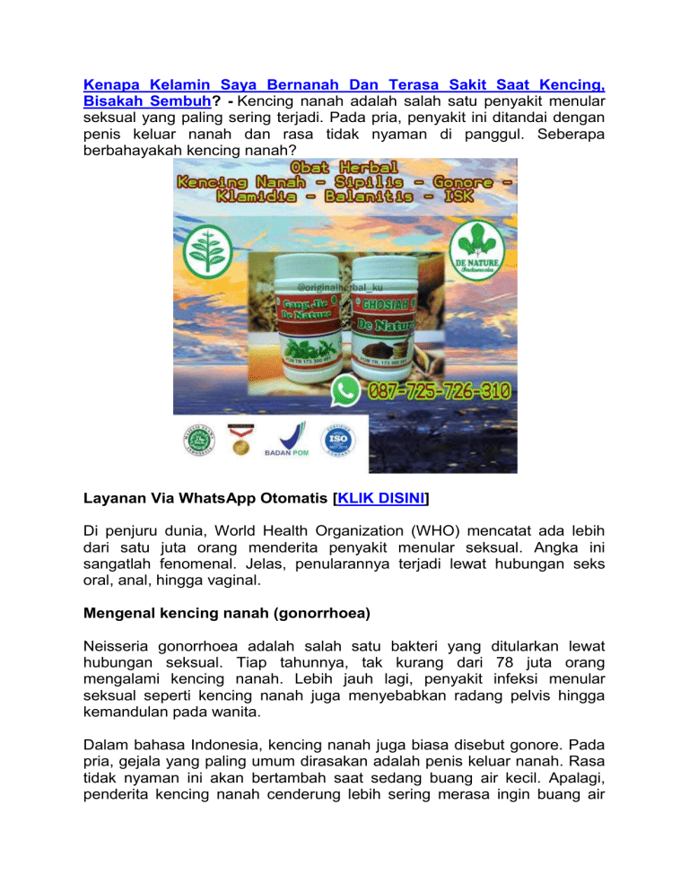 Kenapa Kelamin Saya Bernanah Dan Terasa Sakit Saat Kencing, Bisakah Sembuh? - Kencing nanah adalah salah satu penyakit menular seksual yang paling sering terjadi. Pada pria, penyakit ini ditandai dengan penis keluar nanah dan rasa tidak nyaman di panggul. Seberapa berbahayakah kencing nanah? Layanan Via WhatsApp Otomatis [KLIK DISINI] Di penjuru dunia, World Health Organization (WHO) mencatat ada lebih dari satu juta orang menderita penyakit menular seksual. Angka ini sangatlah fenomenal. Jelas, penularannya terjadi lewat hubungan seks oral, anal, hingga vaginal. Mengenal kencing nanah (gonorrhoea) Neisseria gonorrhoea adalah salah satu bakteri yang ditularkan lewat hubungan seksual. Tiap tahunnya, tak kurang dari 78 juta orang mengalami kencing nanah. Lebih jauh lagi, penyakit infeksi menular seksual seperti kencing nanah juga menyebabkan radang pelvis hingga kemandulan pada wanita. Dalam bahasa Indonesia, kencing nanah juga biasa disebut gonore. Pada pria, gejala yang paling umum dirasakan adalah penis keluar nanah. Rasa tidak nyaman ini akan bertambah saat sedang buang air kecil. Apalagi, penderita kencing nanah cenderung lebih sering merasa ingin buang air kecil. Ketika seseorang mengalami penis keluar nanah, dokter biasanya akan merunut aktivitas seksual yang dilakukannya. Kemudian, sampel cairannya akan diperiksa di laboratorium. Penyebab kencing nanah Meskipun terkesan horor, kencing nanah adalah penyakit yang bisa disembuhkan. Namun sebelumnya, sangat penting untuk tahu penyebab kencing nanah. Seperti yang disebutkan di atas, infeksi terjadi lewat hubungan seksual. Entah itu anal, oral, atau vaginal. Bahkan tanpa ejakulasi sekalipun, seorang pria bisa terinfeksi gonorrhoea. Bagi pria yang aktif secara seksual, untuk menghindari penis keluar nanah karena gonorrhoea disarankan melakukan seks yang terproteksi. Gunakan kondom dengan tepat. Tak lupa, periksakan diri secara berkala. Selain penis keluar nanah, apa saja gejala kencing nanah pada pria? Gejala kencing nanah antara pria dan wanita bisa berbeda. Gejala akan lebih terasa pada pria, di antaranya: => Sensasi terbakar saat buang air kecil => Penis keluar nanah berwarna kuning, hijau, atau putih => Frekuensi buang air kecil lebih sering => Demam => Rasa gatal dan tidak nyaman pada dubur => Lebih sensitif pada cahaya => Sendi terasa nyeri => Kelenjar getah bening di leher membengkak Gejala-gejala di atas tidak serta-merta terasa. Biasanya, penderita baru akan merasakan gejala di atas, termasuk penis keluar nanah, setelah terinfeksi selama beberapa hari. Cegah penis keluar nanah dengan seks aman Tidak ada pria yang ingin mengalami penis keluar nanah akibat gonorrhoea. Itu sebabnya, langkah terbaik adalah melakukan aktivitas seksual dengan aman. Pertama, pastikan pasangan tidak menderita penyakit infeksi menular seksual apapun. Kedua, gunakan kondom sebagai pelindung saat berhubungan seksual. Ketiga, bekali diri dan pasangan dengan pengetahuan seksual yang memadai. Bakteri gonorrhoea bisa disembuhkan lewat antibiotik. Selama pengobatan, sebaiknya penderita juga tidak melakukan hubungan seksual. Di kemudian hari, orang-orang yang pernah mengalami kencing nanah juga perlu memeriksakan kondisi mereka secara berkala. Dengan ini, Anda dapat terhindar dari penis keluar nanah akibat gonore. Cara Mengobati Gejala Kencing Bernanah/Gonore dengan tepat? Jika Anda terlanjur kena gonore bagaimana cara mengobatinya ? Bagaimana cara mengobati kencing nanah dengan cepat dan tuntas ? Bagaimana berobat yang mudah tanpa perlu malu untuk ke dokter ? Jawabannya : semua bisa, asal Anda memilih produk yang tepat. De Nature Indonesia adalah sebuah perusahaan yang bergerak di bidang Obat Tradisional (OT) dari dalam Negeri, yang mencoba mengangkat dan menghidupkan kembali Budaya Nenek Moyang kita Yaitu Jamu Tradisional sebagai salah satu warisan leluhur budaya bangsa yang perlu dilestarikan. Layanan Via WhatsApp Otomatis [KLIK DISINI] Sekedar informasi untuk kenyamanan Konsumen, bahwa Produk dari perusahaan kami ini sudah memiliki: 1. Ijin Resmi Perusahaan dari Kementrian Kesehatan 2. Ijin BPOM, yang artinya sudah lulus uji stabilitas Produk 3. Sertifikat Halal MUI, sehingga kehalalannya bisa dipertanggungjawabkan 4. Apoteker Yang berpengalaman 5. Sudah melewati Proses Sortir Bahan Baku, Guna Menjaga Mutu Produk 6. Proses Produksi Sesuai Alur CPOTB (Cara Pembuatan Obat Tradisional Yang Baik Dan Benar). - Isi 1 Paket Ada 2 Kapsul, Gang jie Dan Gho siah - Perbotol Isi 50 Kapsul Minum - Aturan Diminum 2 Kapsul Sekali, Minum 3 Kali Sehari Sudah banyak pasien kami yang tersembuhkan, Atas ijin Alloh, pengalaman sebagian besar konsumen kami mereka sudah bisa merasakan khasiat obat gonore kami dalam waktu 3-4 hari, bahkan banyak yang sudah sembuh dalam waktu tersebut. Silahkan Hubungi kami untuk konsultasi dan pemesanan obat gonore KELEBIHAN OBAT HERBAL 1. Tidak menimbulkan efek samping Obat herbal berasal dari tumbuhan yang telah tersedia di alam ini. Pengolahan obat herbal dilakukan secara alami, tradisional, tanpa campuran bahan kimia atau sintetik. Oleh karena itu, obat-obatan herbal tidak memiliki efek samping dan aman digunakan. 2. Bebas racun obat herbal bersifat bebas racun. Dengan pemakaian yang tepat obat herbal aman dikonsumsi oleh siapa pun. Bahkan, obat herbal dapat dijadikan sebagai peluruh racun (detoks) di dalam tubuh. 3. Mudah diproduksi Obat herbal dihasilkan dengan pengolahan sederhana berbagai bagian tumbuhan, seperti akar, daun, buah, biji, bunga, kulit kayu, dan lain-lain. Pengolahan obat herbal tidak membutuhkan alat dan teknologi modern. Biasanya obat herbal diolah dengan cara direbus, ditumbuk, atau dicampur sesama bahan herbal dengan komposisi tertentu. 4. Menghilangkan sumber penyakit Obat herbal bekerja secara menyeluruh (holistic). Selain menyembuhkan gejala penyakitnya , obat herbal bekerja sampai ke sumber penyakitnya. Dengan demikian obat herbal meningkatkan sistem kekebalan tubuh sebagai cara untuk melawan penyakit. 5. Multi khasiat 