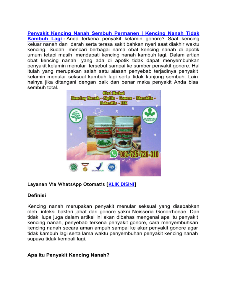 Penyakit Kencing Nanah Sembuh Permanen | Kencing Nanah Tidak Kambuh Lagi - Anda terkena penyakit kelamin gonore? Saat kencing keluar nanah dan darah serta terasa sakit bahkan nyeri saat diakhir waktu kencing. Sudah mencari berbagai nama obat kencing nanah di apotik umum tetapi masih mendapati kencing nanah kambuh lagi. Dalam artian obat kencing nanah yang ada di apotik tidak dapat menyembuhkan penyakit kelamin menular tersebut sampai ke sumber penyakit gonore. Hal itulah yang merupakan salah satu alasan penyebab terjadinya penyakit kelamin menular seksual kambuh lagi serta tidak kunjung sembuh. Lain halnya jika ditangani dengan baik dan benar maka penyakit Anda bisa sembuh total. Layanan Via WhatsApp Otomatis [KLIK DISINI] Definisi Kencing nanah merupakan penyakit menular seksual yang disebabkan oleh infeksi bakteri jahat dari gonore yakni Neisseria Gonorrhoeae. Dan tidak lupa juga dalam artikel ini akan dibahas mengenai apa itu penyakit kencing nanah, penyebab terkena penyakit gonore, cara menyembuhkan kencing nanah secara aman ampuh sampai ke akar penyakit gonore agar tidak kambuh lagi serta lama waktu penyembuhan penyakit kencing nanah supaya tidak kembali lagi. Apa Itu Penyakit Kencing Nanah? Sekilas info tentang penyakit gonore atau kencing nanah menurut pandangan dari Dokter. Merupakan salah satu penyakit menular seksual umum (PMS) yang terjadi pada pria maupun wanita. Umumnya tertular saat melakukan hubungan seksual tanpa menggunakan alat kontrasepsi ke penderita yang sedang mengidap penyakit menular seksual tersebut. Sedangkan menurut pandangan islam, ialah salah satu penyakit kotor yang terjadi pada pria maupun wanita yang dimana di bagian kemaluannya mengeluarkan nanah serta merasa nyeri di saluran kencingnya. Lalu apakah kencing nanah akan membatalkan wudhlu? Banyak dari jumhur (mayoritas) ulama berpendapat apabila pada saluran kencing keluar nanah pada pria dan wanita, maka hal itu tidak membatalkan wudlu. Tetapi masih termasuk kedalam najis (sesuatu yang menjijikan), agar lebih aman dalam melakukan ibadah, sebaiknya dibersihkan terlebih dahulu. Seandainya masih keluar secara terus menerus diharuskan menutup kemaluannya agar najis tersebut tidak berceceran dan tidak mengotori badan. Apa Penyebab dari Gonore? Tidak bisa dipungkiri lagi faktor utama dari penyakit menular seksual itu sendiri ialah karena disebabkan oleh infeksi bakteri neisseria gonorrhoeae. Infeksi dari bakteri gonore ini jika tidak segera ditangani dengan obat terbaik yang ampuh dalam menyembuhkan penyakit kelamin. Hal itu hanya akan dapat memicu terjadinya kencing nanah kambuh lagi dan mengakibatkan komplikasi berupa kemandulan atau infertilitas. Satu hal yang perlu diketahui dari bahaya penyakit kelamin kencing nanah yang disebabkan oleh infeksi bakteri gonore ini ialah penyebarannya yang tidak hanya diam di satu area tubuh saja. Pada pria, efek penyebaran kencing nanah mulai dari saluran kencing (uretra) menuju ke biji kemaluan (testis), epidermis (lapisan jaringan), kemudian menyerang proses pembentukan sperma Sedangkan pada wanita, efek penyebaran penyakit gonore bisa dari serviks (laher rahim) menuju uterus (rahim), tuba falopi (saluran telur), dan ovarium (indung telur). Area lain yang terinfeksi seperti dubur, mata, tenggorokan serta menyebabkan randang panggul. Untuk nama obat herbal kencing sakit keluar nanah pada wanita yang aman bisa dilihat disini. Fakta yang dikemukakan oleh organisasai kesehatan dunia (WHO) bahwa lebih dari 1 juta setiap harinya di seluruh dunia terkena penyakit menular seksual umum (PMS) yang disebakan oleh infeksi dari bakteri gonorrhea tersebut. Berikut Penyebab Seseorang Terkena Penyakit Kencing Nanah, jika: Pernah Mengalami Kencing Nanah Sebelumya Baik pria maupun wanita yang sudah pernah mengalami kencing nanah sebelumnya, sudah tidak diragukan lagi jika ia berisiko terkena penyakit gonorrhea. Apabila tidak ditangani dengan obat terbaik yang ada di apotik, yang ampuh dalam menuntaskan penyakit kelamin menular seksual ini. Hal itu tentu akan siasia saja dan hanya akan memicu terjadinya resiko kencing nanah dapat kambuh lagi bagi penderita sebelumnya. Tertular Infeksi Gonore Seseorang yang tertular infeksi dari materi bakteri neisseria gonorrhoeae juga dapat mudah mengakibatkan pria maupun wanita mengidap penyakit merugikan gonorrhea tersebut. Cara penularan gonore sendiri, bisa di sebabkan sewaktu Anda disentuh oleh penderita kencing nanah ataupun ketidak sengajaan Anda menyentuh bagian kulit yang telah terinfeksi gonore. Seks Bebas Dan yang terkahir faktor yang sering dialami seseorang bisa terkena penyakit kelamin menular seksual ini ialah karena seks bebas. Yang dimana pada saat melakukan hubungan seksual ke lawan jenis tidak mengutamakan keamanan terhadap kesehatanya, yaitu tanpa menggunakan alat pengaman konstrasepsi (kondom). Tanpa pengunaan kondom akan sangat berisiko sekali mengidap penyakit gonore. Kenapa Kencing Nanah Kambuh Lagi Bagi Anda yang sebelumnya sudah mencari berbagai nama obat kencing keluar nanah dan darah di apotik umum berserta dengan harga obat kencing nanah di apotik k24 jika masih kambuh lagi. Hal itu disebabkan lantaran bakteri dari Neisseria Gonorrhoeae kini semakin kebal terhadap obat kencing nanah yang ada di apotik, jadi tidak heran apabila penyakit gonore yang Anda alami masih sukar kambuh. Fakta tersebut, dikemukakan oleh Badan Pencegahan dan Penaggulangan Penyakit Amerika Atau The US Center For Disease Control dan Prevention (CDC) menyatakan bahwa bakteri penyebab infeksi yang disebabkan oleh Neisseia Gonorrhoeae kini semakin kebal terhadap obat kencing nanah yang ada di apotik (antibiotik). Pengobatan Gonore Ampuh Tidak Kambuh Lagi Lantas bagaimana cara mengobati kencing nanah yang aman serta ampuh dalam membasmi gonore secara tuntas sampai ke sumber penyakit dan tidak kambuh lagi? Resep atau cara menyembuhkan penyakit kelamin menular merugikan tersebut, Anda bisa menggunakan obat herbal Gang Jie Gho Siah dari De Nature Asli Indonesia. Te