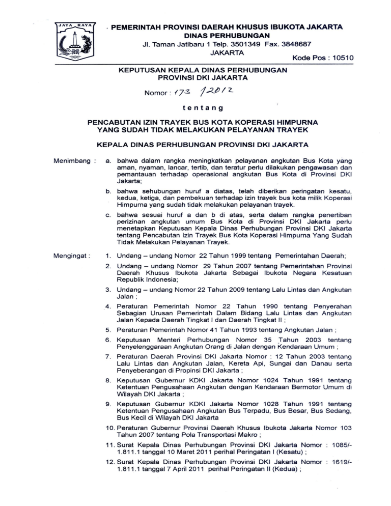 , PEMERINTAH PROVINSI DAERAH KHUSUS IBUKOTA JAKARTA DINAS PERHUBUNGAN JI. Taman Jatibaru 1 Telp. 3501349 Fax. 3848687 JAKARTA Kode Pos: 10510 KEPUTUSAN KEPALA OINAS PERHUBUNGAN PROVI~SI OKI JAKARTA Nomor: 17-3 1» /2.. tentang PENCABUTAN IZIN TRAYEK BUS KOTA KOPERASI HIMPURNA YANG SUOAH TIDAK MELAKUKAN PELAYANAN TRAYEK KEPALA OINAS PERHUBUNGAN PROVINSI OKI JAKARTA Menimbang a. bahwa dalam rangka meningkatkan pelayanan angkutan Bus Kota yang aman, nyaman, lancar, tertib, dan teratur perlu dilakukan pengawasan dan pemantauan terhadap operasional angkutan Bus Kota di Provinsi DKI Jakarta; b. bahwa sehubungan huruf a diatas, telah diberikan peringatan kesatu, kedua, ketiga, dan pembekuan terhadap izin trayek bus kota milik Koperasi Himpurna yang sudah tidak melakukan pelayanan trayek. c. bahwa sesuai huruf a dan b di atas, serta dalam rangka penertiban perizinan angkutan umum Bus Kota di Provinsi DKI Jakarta perlu menetapkan Keputusan Kepala Dinas Perhubungan Provinsi DKI Jakarta tentang Pencabutan Izin Trayek Bus Kota Koperasi Himpurna Yang Sudah Tidak Melakukan Pelayanan Trayek. Mengingat : 1. Undang - undang Nomor 22 Tahun 1999 tentang Pemerintahan Daerah; 2. Undang - undang Nomor 29 Tahun 2007 tentang Pemerintahan Provinsi Daerah Khusus Ibukota Jakarta Sebagai Ibukota Negara Kesatuan Republik Indonesia; 3. Undang - undang Nomor 22 Tahun 2009 tentang Lalu Lintas dan Angkutan Jalan; 4. Peraturan Pemerintah Nomor 22 Tahun 1990 tentang Penyerahan Sebagian Urusan Pemerir.tah Dalam Bidang Lalu Lintas dan Angkutan Jalan Kepada Daerah Tingkat I dan Daerah Tingkat II ; 5. Peraturan Pemerintah Nomor 41 Tahun 1993 tentang Angkutan Jalan ; 6. Keputusan Menteri Perhubungan Nomor 35 Tahun 2003 tentang Penyelenggaraan Angkutan Orang di Jalan dengan t<endaraan Umum ; 7. Peraturan Daerah Provinsi DKI Jakarta Nomor : 12 Tahun 2003 tentang Lalu Lintas dan Angkutan Jalan, Kereta Api, Sungai dan Danau serta Penyeberangan di Propinsi DKI Jakarta; 8. Keputusan Gubernur KDKI Jakarta Nomor 1024 Tahun 1991 tentang Ketentuan Pengusahaan Angkutan dengan Kendaraan Bermotor Umum di Wilayah DKI Jakarta; 9. Keputusan Gubernur KDKI Jakarta Nomor 1028 Tahun 1991 tentang Ketentuan Pengusahaan Angkutan Bus Terpadu, Bus Besar, Bus Sedang, Bus Kecil di Wilayah DKI Jakarta 10. Peraturan Gubernur Provinsi Daerah Khusus Ibukota Jakarta Nomor 103 Tahun 2007 tentang Pola Transportasi Makro ; 11. Surat Kepala Dinas Perhubungan Provinsi DKI Jakarta Nomor : 1085/1.811.1 tanggal 10 Maret 2011 perihal Peringatan I (Kesatu) ; 12. Surat Kepala Dinas Perhubungan Provinsi DKI Jakarta Nomor : 1619/1.811.1 tanggal 7 April 2011 perihal Peringatan II (Kedua) ; 13. Surat Kepala Oinas Perhubungan Provinsi OKI Jakarta Nomor : 2392/1.811.1 tanggal 18 Mei 2011 perihal Peringatan "I (Ketiga); 14. Surat Keputusan Kepala Oinas Perhubungan Provinsi OKI Jakarta Nomor : 383 Tahun 2011 tanggal 20 September 2011 tentang Pembekuan terhadap Trayek - Trayek Bus Kota Yang Tidak Oilayani. MEMUTUSKAN Menetapkan : PERTAMA Mencabut izin trayek kendaraan Bus Kota yang tercantum dalam daftar lampiran keputusan ini KEOUA Kepala Bidang Angkutan Oarat Oinas Perhubungan Provinsi OKI Jakarta, Kepala Bidang Pengendalian dan Operasional Oinas Perhubungan Provinsi OKI Jakarta, Kepala Suku Oinas Perhubungan Kota Administrasi Jakarta Pusat, Timur, Utara, Barat dan Selatan serta Kepala UP. Terminal Angkutan Jalan Oinas Perhubungan Provinsi OKI Jakarta untuk mengawasi pelaksanaan keputusan ini. KETIGA keputusan ini berlaku sejak tanggal ditetapkan dengan ketentuan apabila terjadi kekeliruan di dalam penetapannya dikemudian hari akan diadakan perbaikan sebagaimana mestinya. Oitetapkan di Padatanggal : J a k art a : dl-o #1:::'-// Tembusan: 1. Gubernur Provo OKI Jakarta. 2. Sekretaris Oaerah Provo OKI Jakarta. 3. Oeputi Gubernur Bidang Industri, Perdagangan dan Transportasi Provo OKI Jakarta. 4. Asisten Pembangunan dan Lingkungan Hidup Sekda Provo OKI Jakarta. 5. Asisten Perekonomian dan Administrasi Sekda Provo OKI Jakarta. 6. Oirektur Lalu Lintas Polda Metro Jaya. 7. Inspektur Provo OKI Jakarta. 8. Kepala Badan Pengelola Keuangan Oaerah Provo OKI Jakarta. 9. Kepala Biro Prasarana dan Sarana Kota Setda Provo OKI Jakarta. 10. Kepala Biro Perekonomian Setda Provo OKI Jakarta. . Wakil Kepala Oinas Perhubungan Provo OKI Jakarta. iJ Kabid. Informasi Publik Oinas Komunikasi, Informatika dan Kehumasan Provo OKI Jakarta. 13. Kabid. Pengendalian Dan Operasional Oishub. ProVo OKI Jakarta. 14. Ka. Bidang Angkutan Oarat Oishub. Provo OKI Jakarta. 15. Ka. Sudin Perhubungan Kota Administrasi Jakarta Pusat, Timur, Utara, Barat dan Selatan. 16. Ka. UP Terminal Angkutan Jalan Oishub. Provo OKI Jakarta. 17. Ka. UP PKB Oishub Provo OKI Jakarta. 18. Ketua OPO Organda Provinsi OKI Jakarta. 19. Ketua OPU Bus Kota Organda OKI Jakarta. 20. Perusahaan Bus/Koperasi yang bersangkutan. ~/2 Lampiran : Surat Kepala ~i",s Perhubungan Provinsi OKI Jakarta d /'2N?..Tan gg al:"ll Nomor: ,5U;/2- 17 NO 1 1 2 3 4 5 6 7 8 9 10 11 12 13 14 15 16 /.7J6etL DAFTAR KENDARAAN BUS KOTA YANG IZINNYA DICABUT KOPERASI HIMPURNA NO NO NAMA PEMILIK TRAYEK KENDARAAN TRAYEK 3 2 4 ·5 HIMPURNA HIMPURNA HIMPURNA HIMPURNA HIMPURNA HIMPURNA HIMPURNA HIMPURNA HIMPURNA HIMPURNA HIMPURNA HIMPURNA B B B B B B B B B B B B 7300 7305 7307 7308 7309 7311 7314 7315 7318 7337 7338 7348 BK BK BK BK BK BK BK BK BK BK BK BK P64 P64 P64 P64 P64 P64 P64 P64 P64 P64 P64 P64 KOPERASI HIMPURNA KOPERASI HIMPURNA KOPERASI HIMPURNA B B B 7323 7331 7346 BK BK BK P72 P72 P72 18 19 20 21 22 23 24 25 26 27 28 29 30 31 32 33 34 35 36 37 38 39 40 41 42 43 44 45 46 47 48 49 50 51 52 53 KOPERASI KOPERASI KOPERASI KOPERASI KOPERASI KOPERASI KOPERASI KOPERASI KOPERASI KOPERASI KOPERASI KOPERASI KOPERASI KOPERASI KOPERASI KOPERASI KOPERASI KOPERASI KOPERASI KOPERASI KOPERASI KOPERASI HIMPURNA HIMPURNA HIMPURNA HIMPURNA HIMPURNA HIMPURNA HIMPURNA HIMPURNA HIMPURNA HIMPURNA HIMPURNA HIMPURNA HIMPURNA HIMPURNA HIMPURNA HIMPURNA HIMPURNA HIMPURNA HIMPURNA HIMPURNA HIMP