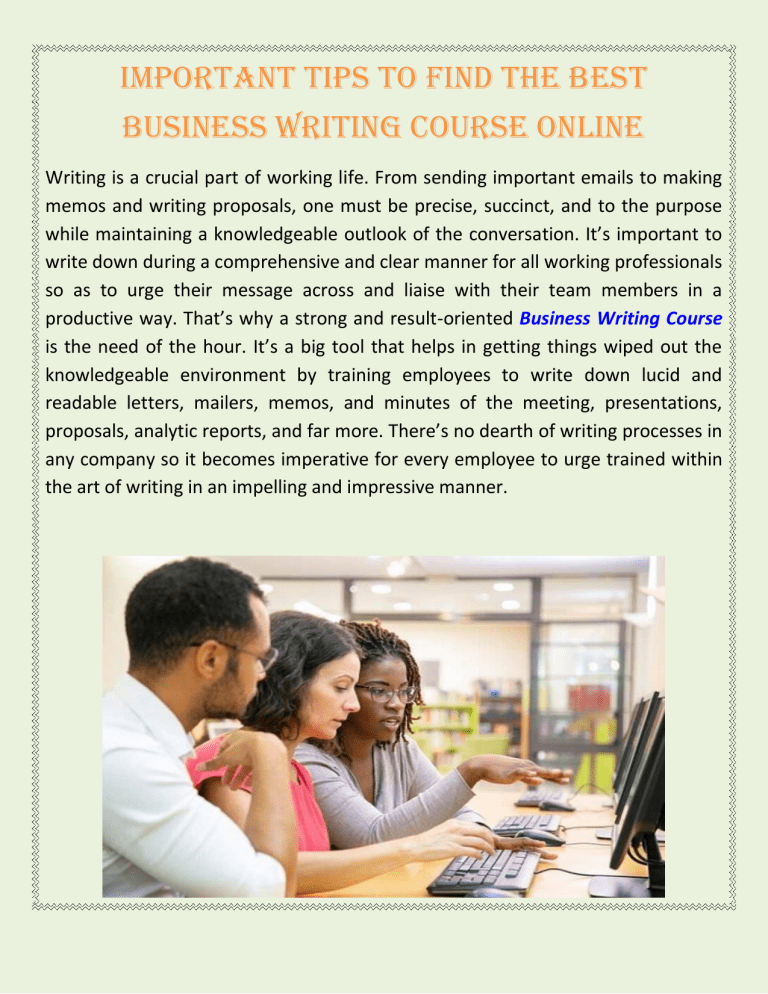 Important Tips To Find The Best Business Writing Course Online Writing is a crucial part of working life. From sending important emails to making memos and writing proposals, one must be precise, succinct, and to the purpose while maintaining a knowledgeable outlook of the conversation. It’s important to write down during a comprehensive and clear manner for all working professionals so as to urge their message across and liaise with their team members in a productive way. That’s why a strong and result-oriented Business Writing Course is the need of the hour. It’s a big tool that helps in getting things wiped out the knowledgeable environment by training employees to write down lucid and readable letters, mailers, memos, and minutes of the meeting, presentations, proposals, analytic reports, and far more. There’s no dearth of writing processes in any company so it becomes imperative for every employee to urge trained within the art of writing in an impelling and impressive manner. These days there are various tool kits available on the market that has instructional design courses crafted to enhance the writing ability and skills of people. This training is gaining momentum as most of the managers across domains are becoming caught up by the pressure of deadlines and ineffective communication. Here are a couple of reasons why you ought to take up a Plain English Online Courses. An impressive and clearly English written content is more professional and credible. It creates a positive image of the author and helps him/her gain respect among peers and therefore the top management. It becomes easy to place your thoughts, opinions, and concepts across. You’ll communicate in an efficient manner and gain acceptance of your ideas. In case, you present equivalent plans during a shoddily written content, nobody will understand the meaning and would ignore it altogether. It gives you the facility to write down readable and comprehensive businessrelated content that doesn't confuse or frustrate the readers. It teaches you're employed ethics as you get to understand about the right use of language in several situations. You get to understand the protocols to be followed while writing emails to clients and business partners. On the opposite hand, a badly written mail can offend a partner or make a client shy away from the corporate. You do not have to believe others to urge your work checked for grammar mistakes. This protects time and causes you to self-sufficient and more confident.