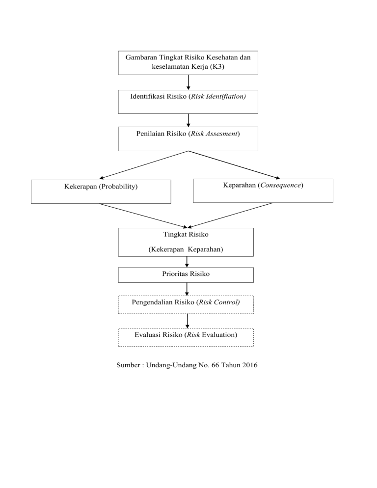 Gambaran Tingkat Risiko Kesehatan dan keselamatan Kerja (K3) Identifikasi Risiko (Risk Identifiation) Penilaian Risiko (Risk Assesment) Keparahan (Consequence) Kekerapan (Probability) Tingkat Risiko (Kekerapan Keparahan) Prioritas Risiko Pengendalian Risiko (Risk Control) Evaluasi Risiko (Risk Evaluation) Sumber : Undang-Undang No. 66 Tahun 2016