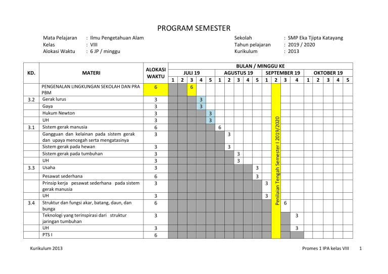 PROGRAM SEMESTER KD. 3.2 3.1 3.3 3.4 : Ilmu Pengetahuan Alam : VIII : 6 JP / minggu MATERI Sekolah Tahun pelajaran Kurikulum ALOKASI WAKTU PENGENALAN LINGKUNGAN SEKOLAH DAN PRA PBM Gerak lurus Gaya Hukum Newton UH Sistem gerak manusia Gangguan dan kelainan pada sistem gerak dan upaya mencegah serta mengatasinya Sistem gerak pada hewan Sistem gerak pada tumbuhan UH Usaha 6 Pesawat sederhana Prinsip kerja pesawat sederhana pada sistem gerak manusia UH Struktur dan fungsi akar, batang, daun, dan bunga Teknologi yang terinspirasi dari struktur jaringan tumbuhan UH PTS I 6 3 Kurikulum 2013 3 3 3 3 6 3 3 3 3 3 3 6 1 JULI 19 2 3 4 6 5 : SMP Eka Tjipta Katayang : 2019 / 2020 : 2013 BULAN / MINGGU KE AGUSTUS 19 SEPTEMBER 19 1 2 3 4 5 1 2 3 4 OKTOBER 19 1 2 3 4 5 3 3 3 3 6 3 3 3 3 3 3 3 3 Penilaian Tengah Semester I 2019/2020 P Mata Pelajaran Kelas Alokasi Waktu 6 3 3 3 6 3 Promes 1 IPA kelas VIII 1 3.6 3.7 Nutrisi Struktur dan fungsi sistem pencernaan manusia Gangguan pada sistem pencernaan dan upaya untuk mencegah atau menanggulanginya UH Zat Aditif Jenis Zat Adiktif UH Darah Jantung dan pembuluh darah Gangguan dan kelainan pada sistem peredaran darah dan upaya untuk mencegah serta menanggulanginya UH PAS I JUMLAH JAM DALAM 1 SEMESTER = 3 6 3 3 6 3 3 3 3 3 1 OKTOBER 19 2 3 4 5 3 3 3 3 3 3 3 3 3 3 3 3 3 6 3 JANUARI 20 1 2 3 4 Liburan Semester I 2019/2020 3.5 MATERI BULAN / MINGGU KE NOPEMBER 19 DESEMBER 19 1 2 3 4 1 2 3 4 Penilaian Akhir Semester I 2019/2020 p Perbaikan , Assesment ETF, Rewarding Day, Pembagian Raport PAS I 2019/2020 KD. ALOKASI WAKTU 114 Mengetahui, Kepala SMP Eka Tjipta Katayang Waka Kurikulum Katayang, 6 Juli 2019 Guru Mata Pelajaran DANANG YUDIANTO WIJAYA,S.Pd NIK. 14038 WAHYU WIBOWO,S.Pd NIK. 17121 APRIANDI,S.Pd NIK. 14002 Kurikulum 2013 Promes 1 IPA kelas VIII 2
