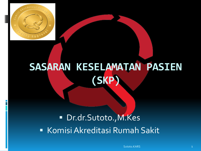 SASARAN KESELAMATAN PASIEN (SKP) Dr.dr.Sutoto.,M.Kes Komisi Akreditasi Rumah Sakit Sutoto.KARS 1 Curiculum vitae: DR.Dr.Sutoto.,M.Kes JABATAN SEKARANG: Ketua KARS (Komisi Akreditasi Rumah Sakit ) Th 2011-2014 Ketua umum PERSI (Perhimpunan Rumah Sakit Seluruh Indonesia) Th 2009-2012/ 2012-2015 Dewan Pembina MKEK (Majelis Kehormatan Etika Kedokteran) IDI Pusat 2009-2012/2012-2015 Dewan Pembina AIPNI (Asosiasi Institusi Pendidikan Ners Indonesia) Anggota Komite Keselamatan Pasien Rumah Sakit Kementerian Kesehatan R.I Dewan Pengawas RS Mata Cicendo,Pusat Mata Nasional PENDIDIKAN: SI Fakultas Kedokteran Univ Diponegoro 2. SII Magister Manajemen RS Univ. Gajahmada 3. S III Manajemen Pendidikan Universitas Negeri Jakarta (Cumlaude) 1. PENGALAMAN KERJA Staf Pengajar Pascasarjana MMR UGM, UMY, UHAMKA Surveyor Komisi Akreditasi Rumah Sakit (KARS) sejak 1998 Kepala Puskesmas Purwojati, Banyumas, Jawa Tengah, tahun 1978-1979 Kepala Puskesmas Jatilawang, Banyumas,jawa Tengah., tahun 1979-1992 Direktur RSUD Banyumas Jawa Tengah 1992-2001 Direktur Utama RSUP Fatmawati Jakarta 2001 - 2005 Direktur Utama RS Kanker Dharmais Jakarta 2005-2010 Sesditjen/Plt Dirjen Bina Pelayanan Medis KEMENKES R.I(Sutoto.KARS Feb-Sept 2010) 2 ENAM SASARAN KESELAMATAN PASIEN Sasaran I : Ketepatan identifikasi pasien Sasaran II: Peningkatan komunikasi yang efektif Sasaran III: Peningkatan keamanan obat yang perlu diwaspadai (high-alert) Sasaran lV: Kepastian tepat-lokasi, tepat-prosedur, tepat-pasien operasi Sasaran V: Pengurangan risiko infeksi terkait pelayanan kesehatan Sasaran VI: Pengurangan risiko pasien jatuh Sutoto.KARS 3 SASARAN KESELAMATAN PASIEN (SKP) GAMBARAN UMUM SKP syarat mayor dalam akreditasi KARS Maksud dari SKP: mendorong perbaikan spesifik dalam keselamatan pasien SKP : menyoroti bagian-bagian yang bermasalah dalam Yankes Perbaikan Disain sistem yang baik: memberikan pelayanan kesehatan yang aman dan bermutu tinggi, difokuskan pada solusi-solusi sistem yang menyeluruh. Sutoto.KARS 4 SASARAN I : KETEPATAN IDENTIFIKASI PASIEN Rumah sakit mengembangkan suatu pendekatan untuk memperbaiki / meningkatkan ketelitian identifikasi pasien. Sutoto.KARS 6 SALAH SPERMA Sutoto.KARS 7 Maksud dan Tujuan SKP I Keliru mengidentifikasi pasien : 1. Terjadi hampir di semua aspek diagnosis dan pengobatan 2. Dalam keadaan : 1. 2. 3. 4. 5. pasien masih dibius pindah tempat tidur pindah kamar pindah lokasi di dalam rumah sakit pasien memiliki cacat indra Tujuan sasaran ini dua hal: 1. mengidentifikasi dengan benar 2. mencocokkan layanan dengan individu tersebut. Sutoto.KARS 8 CARA IDENTIFIKASI PASIEN Kebijakan dan/atau prosedur, dua cara untuk mengidentifikasi pasien: menggunakan gelang identitas pasien , identifikasi dua diantara tiga identitas nama pasien nomor rekam medis atau tanggal lahir dilarang identifikasi dg nomor kamar pasien atau lokasi Proses kolaboratif digunakan untuk mengembangkan kebijakan dan/atau prosedur agar dapat memastikan semua kemungkinan situasi dapat diidentifikasi contoh: pasien koma tanpa identitas, pasien jiwa dll Sutoto.KARS 9 GELANG PASIEN • Biru: Laki Laki • Pink: Perempuan • Merah: Alergi • Kuning: Risiko Jatuh Sutoto.KARS 10 SAAT PEMASANGAN GELANG OLEH PETUGAS Jelaskan manfaat gelang pasien Jelaskan bahaya untuk pasien yang menolak, melepas, menutupi gelang .dll Minta pasien utuk mengingatkan petugas bila akan melakukan tindakan atau memberi obat memberikan pengobatan tidak menkonfirmasi nama dan mengecek ke gelang Sutoto.KARS 11 PETUGAS HARUS MELAKUKAN IDENTIFIKASI PASIEN SAAT: pemberian obat pemberian darah / produk darah pengambilan darah dan spesimen lain untuk pemeriksaan klinis Sebelum memberikan pengobatan Sebelum memberikan tindakan Sutoto.KARS 12 Elemen Penilaian SKP.I. 1. Pasien diidentifikasi menggunakan dua identitas 2. 3. 4. 5. pasien, tidak boleh menggunakan nomor kamar atau lokasi pasien Pasien diidentifikasi sebelum pemberian obat, darah, atau produk darah. Pasien diidentifikasi sebelum mengambil darah dan spesimen lain untuk pemeriksaan klinis Pasien diidentifikasi sebelum pemberian pengobatan dan tindakan / prosedur Kebijakan dan prosedur mengarahkan pelaksanaan identifikasi yang konsisten pada semua situasi dan lokasi Sutoto.KARS 13 SASARAN II : PENINGKATAN KOMUNIKASI YANG EFEKTIF Rumah sakit mengembangkan pendekatan untuk meningkatkan efektivitas komunikasi antar para pemberi layanan. Sutoto.KARS 14 Maksud dan Tujuan SKP II Komunikasi efektif akan mengurangi kesalahan dan menghasilkan peningkatan Keselamatan Pasien : Komunikasi efektif 1. 2. 3. 4. 5. tepat waktu akurat lengkap jelas dipahami oleh pihak-pihak terkait Bentuk Komunikasi: Elektronik Lisan tertulis Sutoto.KARS 15 Komunikasi yang mudah terjadi kesalahan Terjadi pada saat: Perintah diberikan secara lisan Perintah diberikan melalui telpon Saat pelaporan kembali hasil pemeriksaan kritis. Sutoto.KARS 16 Perintah Lisan/Lewat Telepon 1. Tulis Lengkap 2. Baca Ulang- Eja untuk NORUM/LASA 3. Konfirmasilis an dan tanda tangan ISI PERINTAH NAMA LENGKAP DAN TANDA TANGAN PEMBERI PERINTAH NAMA LENGKAP DAN TANDA TANGAN PENERIMA PERINTAH TANGGAL DAN JAM Sutoto.KARS 17 CONTOH FORMULIR CATATAN LENGKAP PERINTAH LISAN/MELALUI TELEPON/PELAPORAN HASIL PEMERIKSAAN KRITIS NO TGL/ JAM ISI PERINTAH PENERIMA PERINTAH (TANDA TANGAN) PEMBERI PERINTAH (TANDA TANGAN) Sutoto.KARS KETERANGAN 18 Sutoto.KARS 19 Elemen Penilaian SKP.II. 1. Perintah lengkap secara lisan dan yang melalui telepon atau hasil pemeriksaan dituliskan secara lengkap oleh penerima perintah 2. Perintah lengkap lisan dan telpon atau hasil pemeriksaan dibacakan kembali secara lengkap oleh penerima perintah. 3. Perintah atau hasil pemeriksaan dikonfirmasi oleh pemberi perintah atau yang menyampaikan hasil pemeriksaan 4. Kebijakan dan prosedur mengarahkan pelaksanaan verifikasi keakuratan komunikasi lisan atau melalui telepon secara konsisten Sutoto.KARS 21 SASARAN III : PENINGKATAN KEAMANAN OBAT YANG PERLU DIWASPADAI (HIGH-ALERT) Rumah sakit mengembangkan suatu pendekatan 
