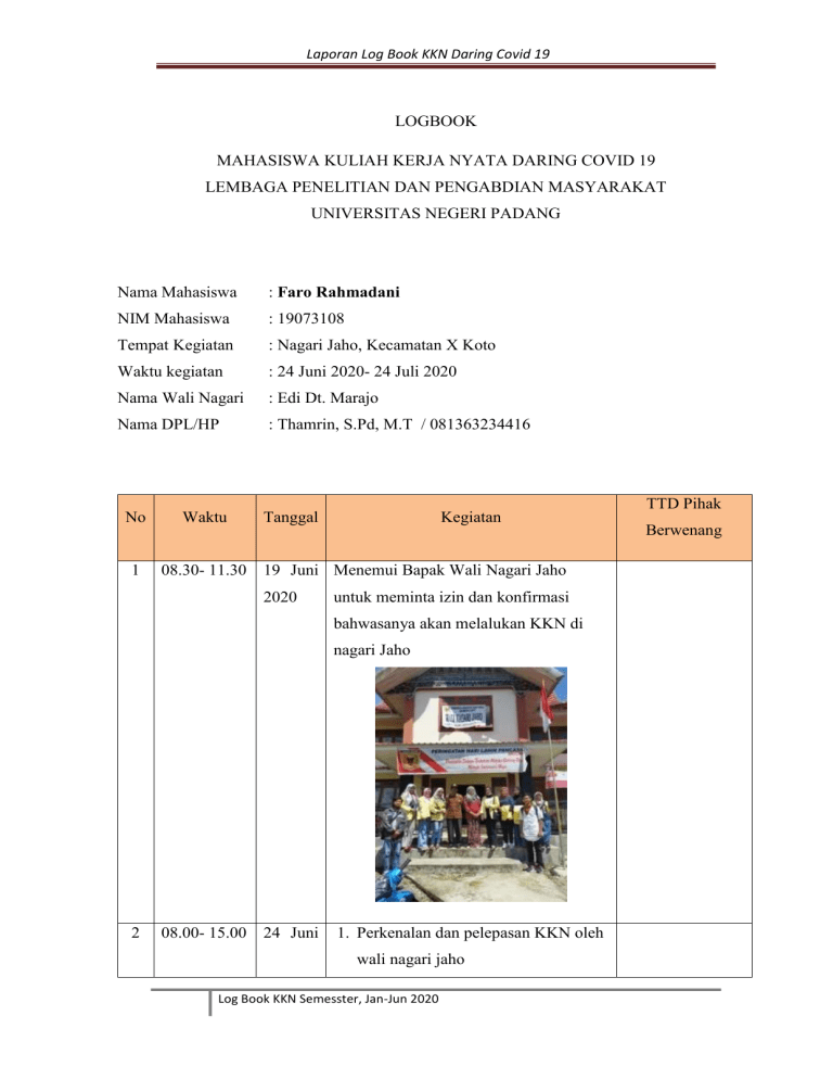 Laporan Log Book KKN Daring Covid 19 LOGBOOK MAHASISWA KULIAH KERJA NYATA DARING COVID 19 LEMBAGA PENELITIAN DAN PENGABDIAN MASYARAKAT UNIVERSITAS NEGERI PADANG Nama Mahasiswa : Faro Rahmadani NIM Mahasiswa : 19073108 Tempat Kegiatan : Nagari Jaho, Kecamatan X Koto Waktu kegiatan : 24 Juni 2020- 24 Juli 2020 Nama Wali Nagari : Edi Dt. Marajo Nama DPL/HP : Thamrin, S.Pd, M.T / 081363234416 No Waktu 1 08.30- 11.30 Tanggal Kegiatan 19 Juni Menemui Bapak Wali Nagari Jaho 2020 untuk meminta izin dan konfirmasi bahwasanya akan melalukan KKN di nagari Jaho 2 08.00- 15.00 24 Juni 1. Perkenalan dan pelepasan KKN oleh wali nagari jaho Log Book KKN Semesster, Jan-Jun 2020 TTD Pihak Berwenang Laporan Log Book KKN Daring Covid 19 2020 2. Pembahasan proker terkait covid oleh kelompok bersama wali nagari 3. Survei pembuatan jalan dari sawah gadang-guguak mangek, yaitu proker dari wali nagari 3 08.00- 16.00 25 Juni 1. Pembuatan desinfektan 2020 2. Penyemprotan desinfektan di mesjid Nurul Falah jaho 3. Penyemprotan desinfektan di surau gadang 4. Penyemprotan desinfektan di musholla Al Hidayah 5. Penyemprotan desinfektan di musholla Al Umar 6. Penyemprotan desinfektan di kantor wali nagari 7. Penyemprotan desinfektan di warung-warung di nagari jaho Log Book KKN Semesster, Jan-Jun 2020 Laporan Log Book KKN Daring Covid 19 4 08.00- 17.30 26 Juni 1. Pembersihan musholla Al Hidayah 2020 2. Diskusi bersama mengenai kegiatan sosialisasi covid-19 yang akan dilaksanakan 5 08.00– 29 Juni 1. Persiapan sosialisasi Covid- 19 bersama remaja mesjis nagari Jaho Log Book KKN Semesster, Jan-Jun 2020 Laporan Log Book KKN Daring Covid 19 15.30 2020 (pembuatan sabun cuci tangan, pengecekan suhu remaja masjid yang akan sosialisasi, cuci tangan sesuai anjuran yang telah dibuat) 2. Sosialisasi bersama remaja masjid Nagari Jaho mengenai Covid-19 3. Diskusi Bersama Remaja masjid terkait dengan Proker yang akan diadakan bersama Remaja masjid nagari Jaho 6 08.30– 30 Juni Gotong royong bersama masyarakat dan 15.30 2020 remaja masjid nagari Jaho Log Book KKN Semesster, Jan-Jun 2020 Laporan Log Book KKN Daring Covid 19 7 09.00- 16.00 04 juli 2020 8 08.00- 16.00 06 Juli 2020 1. Pembahasan program kerja lanjutan bersama kelompok 1. Meminta data UMKM nagari Jaho sekaligus meminta izin kepada wali nagara Jaho untuk observasi dan mewawancari UMKM yang ada di nagari Jaho 2. Observasi dan wawancara UMKM nagari Jaho 3. Merancang desain wastafel yang akan di berikan kepada Nagari Jaho bersama tim KKN Nagari Jaho 9 08.00- 16.00 07 Juli 2020 1. Membagikan sembako masyarakat nagari jaho Log Book KKN Semesster, Jan-Jun 2020 kepada Laporan Log Book KKN Daring Covid 19 10 11 08.00- 17.00 07.00- 17.30 08 Juli Melanjutkan observasi dan wawancara 2020 UMKM nagari jaho 09 Juli 1. Membantu kegiatan posyandu anak 2020 dan lansia di Nagari Jaho 2. Meminta sampel garam kepada masyarakat nagari Jaho untuk di cek kadar yodium 3. Mencek kadar yodium pada garam yang dipakai oleh masyarakat nagari Jaho Log Book KKN Semesster, Jan-Jun 2020 Laporan Log Book KKN Daring Covid 19 12 08.00- 17.00 10 Juli 2020 1. Membantu pesantren pimpinan untuk pondok membersihkan asrama pesantren 2. Konsultasi dengan wali nagari Jaho terkait program kerja yang akan dilaksanakan 3. Diskusi dengan nagari Jaho Log Book KKN Semesster, Jan-Jun 2020 remaja masjid Laporan Log Book KKN Daring Covid 19 13 08.30- 16.00 11 Juli 2020 14 09.00- 15.00 1. Lanjutan observasi UMKM yang ada di Nagari Jaho 12 Juli Membahas proker lanjutan bersama 2020 kelompok KKN dan remaja masjid nagari Jaho Log Book KKN Semesster, Jan-Jun 2020 Laporan Log Book KKN Daring Covid 19 15 08.00- 18.00 13 Juli 1. Membeli bahan untuk pembuatan masker yang akan dibagikan kepada masyarakat Nagari Jaho 2. Pembersihan surau gadang dalam rangka penyambutan ketua PKK kabupaten 3. Evaluasi dan diskusi dengan kelompok mengenai program kerja lanjutan 16 08.00 – 14 Juli 18.00 2020 1. Persiapan bahan untuk pembuatan masker 2. Pembuatan masker yang akan dibagikan kepada masyarakat nagari Jaho 3. Evaluasi dan diskusi dengan kelompok mengenai program kerja lanjutan 17 08.00- 18.00 15 Juli 1. Lanjutan pembuatan masker 2020 2. Mengajar di TPA/ TPSA Nurul Furqan 3. Evaluasi dan diskusi dengan kelompok mengenai program kerja Log Book KKN Semesster, Jan-Jun 2020 Laporan Log Book KKN Daring Covid 19 lanjutan 18 08.00- 18.00 16 Juli 2020 1. Pembagian BLT kepada masyarakat nagari Jaho 2. Mengajar di TPA/ TPSA Nurul Furqan 3. Evaluasi dan diskusi dengan kelompok mengenai program kerja lanjutan Log Book KKN Semesster, Jan-Jun 2020 Laporan Log Book KKN Daring Covid 19 19 08.00- 18.00 17 Juli 1. Lanjutan pembuatan masker 2020 2. Evaluasi dan diskusi dengan kelompok bersama remaja masjid nagari Jaho mengenai program kerja lanjutan 20 1. 08.00- 18 Juli 12.00 2020 2. 13.00- 1. Pembuatan video bagaimana seharusnya transaksi saat pandemik 2. Persiapan agenda musyawarah dan 16.00 temu ramah bersama remaja masjid dan pemuda nagari Jaho serta pembimbing KKN 3. 20.00- 3. Musyawarah 23.00 sekaligus evaluasi kegiatan KKN nagari Jaho bersama remaja masjid dan pemuda nagari Jaho serta pembimbing KKN 21 07.00- 11.00 19 Juli 2020 1. Senam dan musyawarah bersama PKK nagari Jaho Log Book KKN Semesster, Jan-Jun 2020 Laporan Log Book KKN Daring Covid 19 22 09.30- 11.00 20 Juli 2020 1. Konsutasi dengan serta Wali musyawarah Nagari terkait dengan program kerja lanjutan yang akan di jalankan bersama kelompok selanjutnya 13.30- 16.00 2. Evaluasi mengenai program kerja yang akan di jalankan selanjutnya 09.00- 14.00 21 Juli 2020 1. Melanjutkan pembuatan masker yang akan di bagikan secara gratis kepada masyarakat sekitar Nagari Jaho 23 08.00- 14.00 22 Juli 2020 1. Penyelesaian masker yang akan dibagikan kepada masyarakat 2. Pembagian masker kepada masyarakat sekitar nagari Jaho Log Book KKN Semesster, Jan-Jun 2020 Laporan Log Book KKN Daring Covid 19 Nagari Jaho, 27 Juli 2020 Mengetahui, Wali Nagari Jaho Mahasiswa Edi Dt. Marajo Faro Rahmadani Nim : 19073108 Log Book 