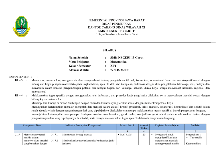 PEMERINTAH PROVINSI JAWA BARAT DINAS PENDIDIKAN KANTOR CABANG DINAS WILAYAH XI SMK NEGERI 13 GARUT Jl. Raya Cisandaan – Pamulihan – Garut SILABUS Nama Sekolah Mata Pelajaran Kelas / Semester Alokasi Waktu KOMPETENSI INTI KI – 3 : KI – 4 : SMK NEGERI 13 Garut Matematika XI/1 72 x 45 Menit : Memahami, menerapkan, menganalisis dan mengevaluasi tentang pengetahuan faktual, konseptual, operasional dasar dan metakognitif sesuai dengan bidang dan lingkup kajian matematika pada tingkat teknis, spesifik, detil dan kompleks, berkenaan dengan ilmu pengetahuan, teknologi, seni, budaya, dan humaniora dalam konteks pengembangan potensi diri sebagai bagian dari keluarga, sekolah, dunia kerja, warga masyarakat nasional, regional, dan internasional Melaksanakan tugas spesifik dengan menggunakan alat, informasi, dan prosedur kerja yang lazim dilakukan serta memecahkan masalah sesuai dengan bidang kajian matematika Menampilkan kinerja di bawah bimbingan dengan mutu dan kuantitas yang terukur sesuai dengan standar kompetensi kerja. Menunjukkan keterampilan menalar, mengolah dan menyaji secara efektif, kreatif, produktif, kritis, mandiri, kolaboratif, komunikatif dan solutif dalam ranah abstrak terkait dengan pengembangan dari yang dipelajarinya disekolah serta mampu melaksanakan tugas spesifik di bawah pengawasan langsung menunjukkan keterampilan mempersepsi, kesiapan, meniru, membiasakan, gerak mahir, menjadikan gerak alami dalam ranah konkret terkait dengan pengembangan dari yang dipelajarinya di sekolah, serta mampu melaksanakan tugas spesifik di bawah pengawasan langsung Kompetensi Dsar 3.15 : : : : 1 Menerapkan operasi matriks dalam menyelesaikan masalah yang berkaitan dengan Indikator Pencapaian Kompetensi 3.15.1 3.15.2 2 Menentukan konsep matriks Menjelaskan karakteristik matriks berdasarkan jenisjenisnya Materi Pokok 3 MATRIKS Alokasi Waktu 4 20 Kegiatan Pembelajaran 5 Mengamati untuk mengidentifikasi dan merumuskan masalah tentang operasi matriks Penilaian 6 Pengetahuan : Tes tertulis Keterampilan: matriks 4.15 3.16 Menyelesaikan masalah yang berkaitan dengan matriks Menentukan nilai determinan, invers dan tranpos pada ordo 2 x 2 dan nilai determinan dan tranpos pada ordo 3x3 3.15.3 Menentukan transpos matriks. 3.15.4 Mengoperasikan kesamaan matriks 3.15.5 Mengoprasikan operasi matriks 4.15.1 Menerapkan permasalahan matriks dalam kehidupan sehari-hari 4.15.2 Menyelesaikan permasalahan yang berkaitan dengan matriks 4.15.3 Mempresentasikan konsep matriks sesuai dengan tugas yang diberikan 3.16.1 Menentukan nilai determinan matriks ordo 2x2 3.16.2 Menentukan invers dan transpose matriks ordo 2x2 3.16.3 Menentukan minor, kofaktor dan adjoin dari matriks ordo 3x3 3.16.4 Menentukan nilai determinan dan transpose matriks ordo 3x3 4.16 Menyelesaikanmasal ah yang berkaitan dengan determinan, invers dan transpose pada ordo 2 x 2 serta nilai determinan Dan tranpos pada ordo 3x3 4.16.1 Menerapkan konsep/prinsip dan strategi pemecahan masalah yang relevan yang berkaitan dengan determinan, invers dan transpose matriks ordo 2x2 maupun 3x3 3.17 Menentukan nilai besaran vektor pada dimensi dua 3.17.1 Menentukan arah vektor pada dimensi dua 3.17.2 Menentukan besaran suatu vektor pada dimensi dua vektor dalam menyelesaikan masalah yang berkaitan dengan matriks Mengumpulkan data tentang operasi matriks dalam menyelesaikan masalah yang berkaitan dengan matriks Mengolah data tentang operasi matriks dalam menyelesaikan masalah yang berkaitan dengan matriks Mengomunikasikan tentang operasi matriks dalam menyelesaikan masalah yang berkaitan dengan matriks Observasi Diskusi Penugasan Mengamati untuk mengidentifikasi dan merumuskan masalah tentang nilai besaran vektor pada dimensi dua Pengetahuan : Tes tertulis Keterampilan: Observasi 4.17 3.18 4.18 3.19 4.19 3.20 3.17.3 Menentukan operasi vektor pada dimensi dua Menyelesaikan masalah yang berkaitan dengan nilai besaran vektor pada dimensi dua 4.17.1 Menyajikan vektor pada dimensi dua 4.17.2 Menghitung besaran vektor pada dimensi dua Menentukan nilai besaran vektor pada dimensi tiga 3.18.1 Menentukan arah vektor pada dimensi tiga 3.18.2 Menentukan besaran suatu vektor pada dimensi tiga Menyelesaikan masalah yang berkaitan dengan nilai besaran vektor pada dimensi tiga Menentukan nilai variable pada persamaan dan fungsi kuadrat Menyelesaikan masalah yang berkaitan dengan persamaan dan fungsi kuadrat Menganalisis operasi komposisi dan operasi invers pada fungsi 3.18.3 Menentukan operasi vektor pada dimensi tiga 4.18.1 Menyajikan vektor pada dimensi tiga 4.18.2 Menghitung besaran vektor pada dimensi tiga 3.19.1 menentukan akar-akar persamaan kuadrat. 3.19.2 menentukan jumlah dan hasil kali akar-akar persamaan kuadrat. 3.19.3 menentukan persamaan kuadrat baru jika akarakarnya diketahui. 3.19.4 menentukan fungsi kuadrat 4.19.1 menghitung akar-akar persamaan kuadrat dengan pemfaktoran, melengkapkan kuadrat sempurna atau rumus ABC. 4.19.2 menggambar grafik fungsi kuadrat 3.20.1 Menentukan operasi aljabar pada fungsi 3.20.2 Menjelaskan konsep invers pada fungsi berdasarkan sifat-sifatnya vektor Fungsi Kuadrat Fungsi komposisi dan invers 14 Mengumpulkan data tentang nilai besaran vektor pada dimensi dua Mengolah data tentang nilai besaran vektor pada dimensi dua Mengomunikasikan tentang nilai besaran vektor pada dimensi dua Mengamati untuk mengidentifikasi dan merumuskan masalah tentang vektor pada dimensi tiga l Mengumpulkan data tentang vektor pada dimensi tiga Mengolah data tentang vektor pada dimensi tiga Mengomunikasikan tentang vektor pada dimensi tiga Mengamati untuk mengidentifikasi dan merumuskan masalah tentang persamaan dan fungsi kuadrat Mengumpulkan data tentang persamaan dan fungsi kuadrat Mengolah data tentang persamaan dan fungsi kuadrat variabel Mengomunikasikan tentang persamaan dan fungsi kuadrat Mengamati untuk mengidentifikasi dan merumuskan masalah tentang barisan dan deret Diskusi Penugasan Pengetahuan : Tes tertulis Keterampilan: Observasi Diskusi Penug