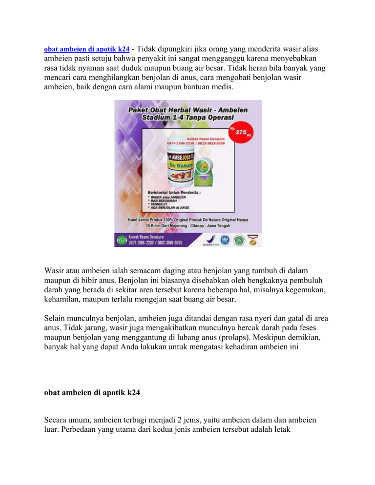 obat ambeien di apotik k24 - Tidak dipungkiri jika orang yang menderita wasir alias ambeien pasti setuju bahwa penyakit ini sangat mengganggu karena menyebabkan rasa tidak nyaman saat duduk maupun buang air besar. Tidak heran bila banyak yang mencari cara menghilangkan benjolan di anus, cara mengobati benjolan wasir ambeien, baik dengan cara alami maupun bantuan medis. Wasir atau ambeien ialah semacam daging atau benjolan yang tumbuh di dalam maupun di bibir anus. Benjolan ini biasanya disebabkan oleh bengkaknya pembuluh darah yang berada di sekitar area tersebut karena beberapa hal, misalnya kegemukan, kehamilan, maupun terlalu mengejan saat buang air besar. Selain munculnya benjolan, ambeien juga ditandai dengan rasa nyeri dan gatal di area anus. Tidak jarang, wasir juga mengakibatkan munculnya bercak darah pada feses maupun benjolan yang menggantung di lubang anus (prolaps). Meskipun demikian, banyak hal yang dapat Anda lakukan untuk mengatasi kehadiran ambeien ini obat ambeien di apotik k24 Secara umum, ambeien terbagi menjadi 2 jenis, yaitu ambeien dalam dan ambeien luar. Perbedaan yang utama dari kedua jenis ambeien tersebut adalah letak terbentuknya ambeien. Apa saja ciri-cirinya? Mari simak ulasan berikut. JENIS AMBEIEN DAN CIRI CIRINYA Ambeien terjadi ketika pembuluh darah di usus besar bagian akhir (rektum) dan dubur atau anus membengkak. Berdasarkan lokasi dan gejala yang ditimbulkan, ambeien terbagi menjadi 2 jenis, yaitu: Ambeien dalam (internal hemorrhoid) Disebut demikian karena pembengkakan yang terjadi berada di dalam anus, tepatnya di liang rektum. Ambeien internal jauh di dalam rektum dan tidak terlihat dari luar. Umumnya, ambeien dalam tidak menimbulkan keluhan sakit karena di liang rektum tidak banyak terdapat saraf. Seringkali, tanda pertama bahwa wasir internal hadir adalah pendarahan dubur. Gejala ambeien dalam yang lain adalah gatal dan nyeri pada anus. Gejala ini biasanya baru muncul ketika ambeien dalam menjadi semakin besar. Mengejan kadang-kadang dapat mendorong wasir internal sehingga menjorok melalui anus. Ini disebut ambeien yang menonjol atau prolaps dan bisa terasa sakit. Ambeien luar (external hemorrhoid) Pada jenis ambeien ini, lokasi pembengkakannya berada di luar rektum atau lebih tepatnya di sekitar lubang anus. Orang yang mengalami ambeien luar dapat mengeluhkan beberapa gejala, seperti: Rasa perih dan panas di sekitar anus. Gatal pada anus. Adanya benjolan atau pembengkakan di sekitar anus. BAB berdarah. Dari gejalanya, ambeien luar terasa lebih nyeri dan sering kali membuat penderitanya merasa tidak nyaman. Hal ini karena pembuluh darah yang mengalami pembengkakan berada di bawah kulit sekitar anus, di mana ada lebih banyak saraf di area tersebut. obat ambeien di apotik k24 CIRI CIRI AMBEIEN ATAU WASIR SECARA UMUM Secara umum, ciri-ciri yang sering dialami penderita adalah perdarahan saat sedang buang air besar. Perdarahan ini bisa berupa bercak darah pada feses atau tetesan darah yang mengalir dari dubur. Selain itu, ada beberapa ciri lain yang bisa dideteksi, di antaranya: 1. Rasa Mengganjal Saat Buang Air Besar Sering kali kita merasa ada sesuatu yang membuat proses buang air besar tertahan. Akibatnya kita akan mengejan dan berusaha mengeluarkan feses dari dubur. Dalam beberapa kasus, mengejan justru akan membuat pembuluh vena pecah dan menimbulkan benjolan (ambeien). Namun, apabila sejak awal penyebab BAB tertahan adalah benjolan tersebut, maka proses mengejan justru akan memperparah ambeien atau wasir yang sudah dimiliki. Jika dibiarkan lama kelamaan akan timbul perdarahan. 2. Rasa Tidak Nyaman pada Anus Selain perdarahan dan gatal, penderita ambeien atau wasir biasanya akan memiliki benjolan di lubang anus. Nah, benjolan inilah yang sering kali menimbulkan rasa tidak nyaman. Ketika merasa tidak nyaman, penderita akan mengalami kesulitan saat harus duduk atau jongkok dalam waktu yang lama. 3. Prolaps Prolaps merupakan keluarnya bagian ambeien atau wasir dari lubang anus. Muncul benjolan keluar dari anus setelah buang air besar. Benjolan dapat masuk sendiri atau harus didorong terlebih dahulu. Jadi, jika saat meraba bagian dubur, Anda mendapati daging yang menonjol berwarna merah muda (lebih terang) dari area sekitarnya dan terasa perih atau bahkan mengeluarkan darah, bisa dipastikan Anda menderita penyakit ambeien atau wasir. 4. Anemia Skunder Wajah pucat, tubuh mudah lemas dan sulit berkonsensentrasi. Gejala ini biasanya muncul bila telah terjadi komplikasi anemia akibat perdarahan yang berlebihan. Perdarahan pada dubur akibat ambeien tentu saja akan membuat penderita mengalami kukurangan darah. Hal ini sering kali menjadi pemicu penyakit lain, salah satunya anemia sekunder. Apabila hal ini yang Anda alami, bisa saja penyebabnya adalah ambeien atau wasir. 5. Infeksi di Daerah Dubur Luka pada ambeien akibat perdarahan akan membuat kuman mudah masuk ke dalam tubuh, hal ini akan menimbulkan infeksi. Jika anus terasa sakit dan perih setiap buang air besar, bisa jadi Anda memiliki ambeien atau wasir. Tingkatan Stadium Wasir Atau sakit Ambeien Wasir stadium 1 : Wasir jenis ini biasanya tidak sampai prolaps. Rasanya hanya kurang nyaman saat BAB. Ambeien stadium 2 : Bagian anus sudah bisa diraba ada benjolan, namun biasanya benjolan bisa masuk dengan sendirinya dan kadang ada rasa panas serta gatal. Wasir stadium 3 : Benjolan pada anus sudah besar dan susah masuk lagi harus dibantu dengan jari. Ambeien stadium 4 : Benjolan wasie sudah besar sekali dan sulit untuk dimasukan lagi meskipun dengan bantuan tangan, selain itu juga menjadi sering pendarahan. Cara menghilangkan benjolan ambeien dengan bantuan medis Dokter akan memprioritaskan penanganan tanpa operasi, namun bila wasir Anda sudah sangat parah atau amat mengganggu, bukan tidak mungkin Anda akan diminta menjalani prosedur pembedahan. Cara menghilangkan benjolan ambeien tanpa operasi adalah: Rubber band litigation, yakni dengan mengikat ujung benjolan yang menempel ke kulit dengan tujuan memat