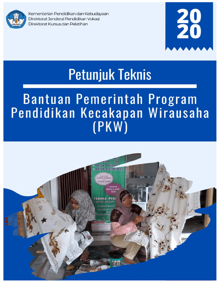 KEMENTERIAN PENDIDIKAN DAN KEBUDAYAAN DIREKTORAT JENDERAL PENDIDIKAN VOKASI Jalan Jenderal Sudirman, Gedung E Lantai III, Senayan, Jakarta 10270 Telepon (021) 5725061, Faksimile 5725484, Tromol Pos 1303 Laman: www.paud-dikmas.kemdikbud.go.id PERATURAN DIREKTUR JENDERAL PENDIDIKAN VOKASI NOMOR……. TAHUN 2020 TENTANG PETUNJUK TEKNIS BANTUAN PEMERINTAH PROGRAM PENDIDIKAN KECAKAPAN WIRAUSAHA TAHUN 2020 DENGAN RAHMAT TUHAN YANG MAHA ESA DIREKTUR JENDERAL PENDIDIKAN VOKASI, Menimbang : bahwa untuk melaksanakan ketentuan Pasal 5, Pasal 11 ayat (2), Pasal 15 ayat (1), dan Pasal 17 ayat (7) Peraturan Menteri Pendidikan dan Kebudayaan Nomor 32 tahun 2019 tentang Pedoman Umum Penyaluran Bantuan Pemerintah di Lingkungan Kementerian Pendidikan dan Kebudayaan, perlu menetapkan Peraturan Direktur Jenderal Pendidikan Vokasi tentang Petunjuk Teknis Bantuan Pemerintah Program Pendidikan Kecakapan Wirausaha Tahun 2020; Mengingat : 1. Undang-Undang Nomor 20 Tahun 2003 tentang Sistem Pendidikan Nasional (Lembaran Negara Republik Indonesia Tahun 2003 Nomor 78, Tambahan Lembaran Negara Republik Indonesia Nomor 4301); 2. Peraturan Pemerintah Nomor 48 Tahun 2005 tentang Pendanaan Pendidikan (Lembaran Negara Republik Indonesia Tahun 2008 Nomor 91, Tambahan Lembaran Negara Republik Indonesia Nomor 4864); 3. Peraturan Pemerintah Nomor 31 Tahun 2006 tentang Sistem Pelatihan Kerja Nasional (Lembaran Negara Republik Indonesia Tahun 2006 Nomor 67, Tambahan Lembaran Negara Republik Indonesia Nomor 4637); 4. Peraturan Pemerintah Nomor 17 Tahun 2010 tentang Pengelolaan dan Penyelenggaraan Pendidikan (Lembaran Negara Republik Indonesia Tahun 2010 Nomor 23, Tambahan Lembaran Negara Republik Indonesia Nomor 5105) sebagaimana telah diubah dengan Peraturan Pemerintah Nomor 66 Tahun 2010 tentang Perubahan atas Peraturan Pemerintah Nomor 17 Tahun 2010 tentang Pengelolaan dan Penyelenggaraan Pendidikan (Lembaran Negara Republik Indonesia Tahun 2010 Nomor 112, Tambahan Lembaran Negara Republik Indonesia Nomor 5157); 5. Peraturan Presiden Nomor 8 Tahun 2012 tentang Kerangka Kualifikasi Nasional Indonesia (Lembaran Negara Republik Indonesia Tahun 2012 Nomor 24); 6. Peraturan Presiden Nomor 82 Tahun 2019 tentang Kementerian Pendidikan dan Kebudayaan (LembaranNegara Republik Indonesia Tahun 2019 Nomor 242); 7. Instruksi Presiden Nomor 6 Tahun 2009 tentang Pengembangan Ekonomi Kreatif; 8. Peraturan Menteri Pendidikan Nasional Nomor 70 Tahun 2008 Tentang Uji Kompetensi Bagi Peserta Didik Kursus dan Pelatihan dari Satuan Pendidikan Nonformal Atau Warga Masyarakat Yang Belajar Mandiri; 9. Peraturan Menteri Keuangan Nomor 168/PMK.05/2015 tentang Mekanisme Pelaksanaan Anggaran Bantuan Pemerintah pada Kementerian Negara/Lembaga (Berita Negara Republik Indonesia Tahun 2015 Nomor 1340) sebagimana telah diubah dengan Peraturan Menteri Keuangan Nomor 173/PMK.05/2016 tentang Perubahan atas Peraturan 168/PMK.05/2015 Anggaran Bantuan Menteri tentang Keuangan Mekanisme Pemerintah pada Nomor Pelaksanaan Kementerian Negara/Lembaga (Berita Negara Republik Indonesia Tahun 2016 Nomor 1745); 10. Peraturan Menteri Pendidikan dan Kebudayaan Nomor 32 Tahun 2019 tentang Pedoman Umum Penyaluran Bantuan Pemerintah di Lingkungan Kementerian Pendidikan dan Kebudayaan (Berita Negara Republik Indonesia Tahun 2019 Nomor 1167); 11. Peraturan Menteri Pendidikan dan Kebudayaan Nomor 45 Tahun 2019 tentang Organisasi dan Tata Kerja Kementerian Pendidikan dan Kebudayaan (Berita Negara Republik Indonesia Tahun 2019 Nomor 1673) sebagaimana telah diubah dengan Peraturan Menteri Pendidikan dan Kebudayaan Nomor 9 Tahun 2020 Tentang Perubahan Atas Peraturan Menteri Pendidikan dan Kebudayaan Nomor 45 Tahun 2019 Tentang Organisasi dan Tata Kerja Kementerian Pendidikan dan Kebudayaan (Berita Negara Republik Indonesia Tahun 2020 Nomor 124); 12. Peraturan Menteri Pendidikan dan Kebudayaan Nomor 46 Tahun 2019 tentang Rincian Tugas Unit Kerja di Lingkungan Kementerian Pendidikan dan Kebudayaan (Berita Negara Republik Indonesia Tahun 2019 Nomor 1728) sebagaimana telah diubah dengan Peraturan Menteri Pendidikan dan Kebudayaan Nomor 17 Tahun 2020 tentang Perubahan atas Peraturan Menteri Pendidikan dan Kebudayaan Nomor 46 Tahun 2019 tentang Rincian Tugas Unit Kerja di Lingkungan Kementerian Pendidikan dan Kebudayaan (Berita Negara Republik Indonesia Tahun 2020 Nomor 269); MEMUTUSKAN: Menetapkan : PERATURAN DIREKTUR JENDERAL PENDIDIKAN VOKASI TENTANG PETUNJUK TEKNIS BANTUAN PEMERINTAH PROGRAM PENDIDIKAN KECAKAPAN WIRAUSAHA TAHUN 2020. Pasal 1 Petunjuk Teknis Bantuan Pemerintah Program Pendidikan Kecakapan Wirausaha Tahun 2020 selanjutnya disebut Bantuan Program PKW Tahun 2020 sebagaimana tercantum dalam Lampiran yang merupakan bagian tidak terpisahkan dari Peraturan Direktur Jenderal Pendidikan Vokasi Pasal 2 Peraturan Direktur Jenderal ini mulai berlaku pada tanggal ditetapkan. Ditetapkan di Jakarta pada tanggal DIREKTUR JENDERAL, WIKAN SAKARINTO Telah diperiksa dan disetujui oleh: Pengendali sub bidang Hukum Tanggal Koordinator bidang Hukum, Tatalaksana, dan Kepegawaian Tanggal Direktur/ Kuasa Pengguna Anggaran Direktorat Kursus dan Pelatihan Tanggal Sekretaris Ditjen Pendidikan Vokasi Tanggal LAMPIRAN I PERATURAN DIREKTUR JENDERAL PENDIDIKAN VOKASI NOMOR…… TAHUN 2020 TENTANG PETUNJUK TEKNIS BANTUAN PEMERINTAH PROGRAM PENDIDIKAN KECAKAPAN WIRAUSAHA TAHUN 2020 BAB I PENDAHULUAN A. Latar Belakang Beberapa dasar pemikiran yang melatarbelakangi Direktorat Kursus dan Pelatihan, Direktorat Jenderal Pendidikan Vokasi, Kementerian Pendidikan dan Kebudayaan memberikan dana bantuan pemerintah melalui Program Pendidikan Kecakapan Wirausaha (PKW), yaitu: 1. Mayoritas tenaga kerja (58,77%/72,8 juta) memiliki tingkat pendidikan rendah (lulusan SMP/sederajat kebawah) tanpa keterampilan yang dibutuhkan pasar tenaga kerja (BPS, 2019). 2. Sistem pendidikan dan pelatihan vokasi saat ini belum menghasilkan lulusan yang memadai dan memenuhi syarat untuk melakukan pekerjaan dengan keterampilan tinggi. 
