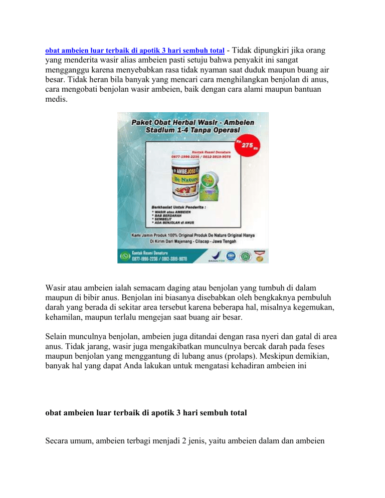 obat ambeien luar terbaik di apotik 3 hari sembuh total - Tidak dipungkiri jika orang yang menderita wasir alias ambeien pasti setuju bahwa penyakit ini sangat mengganggu karena menyebabkan rasa tidak nyaman saat duduk maupun buang air besar. Tidak heran bila banyak yang mencari cara menghilangkan benjolan di anus, cara mengobati benjolan wasir ambeien, baik dengan cara alami maupun bantuan medis. Wasir atau ambeien ialah semacam daging atau benjolan yang tumbuh di dalam maupun di bibir anus. Benjolan ini biasanya disebabkan oleh bengkaknya pembuluh darah yang berada di sekitar area tersebut karena beberapa hal, misalnya kegemukan, kehamilan, maupun terlalu mengejan saat buang air besar. Selain munculnya benjolan, ambeien juga ditandai dengan rasa nyeri dan gatal di area anus. Tidak jarang, wasir juga mengakibatkan munculnya bercak darah pada feses maupun benjolan yang menggantung di lubang anus (prolaps). Meskipun demikian, banyak hal yang dapat Anda lakukan untuk mengatasi kehadiran ambeien ini obat ambeien luar terbaik di apotik 3 hari sembuh total Secara umum, ambeien terbagi menjadi 2 jenis, yaitu ambeien dalam dan ambeien luar. Perbedaan yang utama dari kedua jenis ambeien tersebut adalah letak terbentuknya ambeien. Apa saja ciri-cirinya? Mari simak ulasan berikut. JENIS AMBEIEN DAN CIRI CIRINYA Ambeien terjadi ketika pembuluh darah di usus besar bagian akhir (rektum) dan dubur atau anus membengkak. Berdasarkan lokasi dan gejala yang ditimbulkan, ambeien terbagi menjadi 2 jenis, yaitu: Ambeien dalam (internal hemorrhoid) Disebut demikian karena pembengkakan yang terjadi berada di dalam anus, tepatnya di liang rektum. Ambeien internal jauh di dalam rektum dan tidak terlihat dari luar. Umumnya, ambeien dalam tidak menimbulkan keluhan sakit karena di liang rektum tidak banyak terdapat saraf. Seringkali, tanda pertama bahwa wasir internal hadir adalah pendarahan dubur. Gejala ambeien dalam yang lain adalah gatal dan nyeri pada anus. Gejala ini biasanya baru muncul ketika ambeien dalam menjadi semakin besar. Mengejan kadang-kadang dapat mendorong wasir internal sehingga menjorok melalui anus. Ini disebut ambeien yang menonjol atau prolaps dan bisa terasa sakit. Ambeien luar (external hemorrhoid) Pada jenis ambeien ini, lokasi pembengkakannya berada di luar rektum atau lebih tepatnya di sekitar lubang anus. Orang yang mengalami ambeien luar dapat mengeluhkan beberapa gejala, seperti: Rasa perih dan panas di sekitar anus. Gatal pada anus. Adanya benjolan atau pembengkakan di sekitar anus. BAB berdarah. Dari gejalanya, ambeien luar terasa lebih nyeri dan sering kali membuat penderitanya merasa tidak nyaman. Hal ini karena pembuluh darah yang mengalami pembengkakan berada di bawah kulit sekitar anus, di mana ada lebih banyak saraf di area tersebut. obat ambeien luar terbaik di apotik 3 hari sembuh total CIRI CIRI AMBEIEN ATAU WASIR SECARA UMUM Secara umum, ciri-ciri yang sering dialami penderita adalah perdarahan saat sedang buang air besar. Perdarahan ini bisa berupa bercak darah pada feses atau tetesan darah yang mengalir dari dubur. Selain itu, ada beberapa ciri lain yang bisa dideteksi, di antaranya: 1. Rasa Mengganjal Saat Buang Air Besar Sering kali kita merasa ada sesuatu yang membuat proses buang air besar tertahan. Akibatnya kita akan mengejan dan berusaha mengeluarkan feses dari dubur. Dalam beberapa kasus, mengejan justru akan membuat pembuluh vena pecah dan menimbulkan benjolan (ambeien). Namun, apabila sejak awal penyebab BAB tertahan adalah benjolan tersebut, maka proses mengejan justru akan memperparah ambeien atau wasir yang sudah dimiliki. Jika dibiarkan lama kelamaan akan timbul perdarahan. 2. Rasa Tidak Nyaman pada Anus Selain perdarahan dan gatal, penderita ambeien atau wasir biasanya akan memiliki benjolan di lubang anus. Nah, benjolan inilah yang sering kali menimbulkan rasa tidak nyaman. Ketika merasa tidak nyaman, penderita akan mengalami kesulitan saat harus duduk atau jongkok dalam waktu yang lama. 3. Prolaps Prolaps merupakan keluarnya bagian ambeien atau wasir dari lubang anus. Muncul benjolan keluar dari anus setelah buang air besar. Benjolan dapat masuk sendiri atau harus didorong terlebih dahulu. Jadi, jika saat meraba bagian dubur, Anda mendapati daging yang menonjol berwarna merah muda (lebih terang) dari area sekitarnya dan terasa perih atau bahkan mengeluarkan darah, bisa dipastikan Anda menderita penyakit ambeien atau wasir. 4. Anemia Skunder Wajah pucat, tubuh mudah lemas dan sulit berkonsensentrasi. Gejala ini biasanya muncul bila telah terjadi komplikasi anemia akibat perdarahan yang berlebihan. Perdarahan pada dubur akibat ambeien tentu saja akan membuat penderita mengalami kukurangan darah. Hal ini sering kali menjadi pemicu penyakit lain, salah satunya anemia sekunder. Apabila hal ini yang Anda alami, bisa saja penyebabnya adalah ambeien atau wasir. 5. Infeksi di Daerah Dubur Luka pada ambeien akibat perdarahan akan membuat kuman mudah masuk ke dalam tubuh, hal ini akan menimbulkan infeksi. Jika anus terasa sakit dan perih setiap buang air besar, bisa jadi Anda memiliki ambeien atau wasir. Tingkatan Stadium Wasir Atau sakit Ambeien Wasir stadium 1 : Wasir jenis ini biasanya tidak sampai prolaps. Rasanya hanya kurang nyaman saat BAB. Ambeien stadium 2 : Bagian anus sudah bisa diraba ada benjolan, namun biasanya benjolan bisa masuk dengan sendirinya dan kadang ada rasa panas serta gatal. Wasir stadium 3 : Benjolan pada anus sudah besar dan susah masuk lagi harus dibantu dengan jari. Ambeien stadium 4 : Benjolan wasie sudah besar sekali dan sulit untuk dimasukan lagi meskipun dengan bantuan tangan, selain itu juga menjadi sering pendarahan. Cara menghilangkan benjolan ambeien dengan bantuan medis Dokter akan memprioritaskan penanganan tanpa operasi, namun bila wasir Anda sudah sangat parah atau amat mengganggu, bukan tidak mungkin Anda akan diminta menjalani prosedur pembedahan. Cara menghilangkan benjolan ambeien tanpa operasi adalah: Rubber band liti