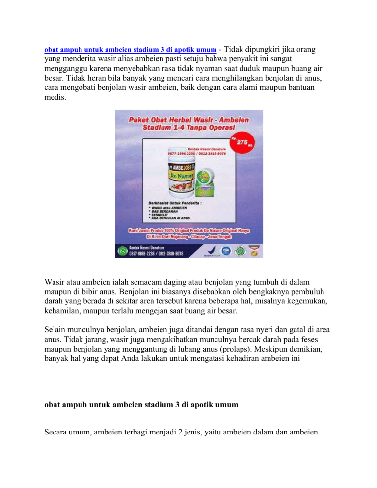 obat ampuh untuk ambeien stadium 3 di apotik umum - Tidak dipungkiri jika orang yang menderita wasir alias ambeien pasti setuju bahwa penyakit ini sangat mengganggu karena menyebabkan rasa tidak nyaman saat duduk maupun buang air besar. Tidak heran bila banyak yang mencari cara menghilangkan benjolan di anus, cara mengobati benjolan wasir ambeien, baik dengan cara alami maupun bantuan medis. Wasir atau ambeien ialah semacam daging atau benjolan yang tumbuh di dalam maupun di bibir anus. Benjolan ini biasanya disebabkan oleh bengkaknya pembuluh darah yang berada di sekitar area tersebut karena beberapa hal, misalnya kegemukan, kehamilan, maupun terlalu mengejan saat buang air besar. Selain munculnya benjolan, ambeien juga ditandai dengan rasa nyeri dan gatal di area anus. Tidak jarang, wasir juga mengakibatkan munculnya bercak darah pada feses maupun benjolan yang menggantung di lubang anus (prolaps). Meskipun demikian, banyak hal yang dapat Anda lakukan untuk mengatasi kehadiran ambeien ini obat ampuh untuk ambeien stadium 3 di apotik umum Secara umum, ambeien terbagi menjadi 2 jenis, yaitu ambeien dalam dan ambeien luar. Perbedaan yang utama dari kedua jenis ambeien tersebut adalah letak terbentuknya ambeien. Apa saja ciri-cirinya? Mari simak ulasan berikut. JENIS AMBEIEN DAN CIRI CIRINYA Ambeien terjadi ketika pembuluh darah di usus besar bagian akhir (rektum) dan dubur atau anus membengkak. Berdasarkan lokasi dan gejala yang ditimbulkan, ambeien terbagi menjadi 2 jenis, yaitu: Ambeien dalam (internal hemorrhoid) Disebut demikian karena pembengkakan yang terjadi berada di dalam anus, tepatnya di liang rektum. Ambeien internal jauh di dalam rektum dan tidak terlihat dari luar. Umumnya, ambeien dalam tidak menimbulkan keluhan sakit karena di liang rektum tidak banyak terdapat saraf. Seringkali, tanda pertama bahwa wasir internal hadir adalah pendarahan dubur. Gejala ambeien dalam yang lain adalah gatal dan nyeri pada anus. Gejala ini biasanya baru muncul ketika ambeien dalam menjadi semakin besar. Mengejan kadang-kadang dapat mendorong wasir internal sehingga menjorok melalui anus. Ini disebut ambeien yang menonjol atau prolaps dan bisa terasa sakit. Ambeien luar (external hemorrhoid) Pada jenis ambeien ini, lokasi pembengkakannya berada di luar rektum atau lebih tepatnya di sekitar lubang anus. Orang yang mengalami ambeien luar dapat mengeluhkan beberapa gejala, seperti: Rasa perih dan panas di sekitar anus. Gatal pada anus. Adanya benjolan atau pembengkakan di sekitar anus. BAB berdarah. Dari gejalanya, ambeien luar terasa lebih nyeri dan sering kali membuat penderitanya merasa tidak nyaman. Hal ini karena pembuluh darah yang mengalami pembengkakan berada di bawah kulit sekitar anus, di mana ada lebih banyak saraf di area tersebut. obat ampuh untuk ambeien stadium 3 di apotik umum CIRI CIRI AMBEIEN ATAU WASIR SECARA UMUM Secara umum, ciri-ciri yang sering dialami penderita adalah perdarahan saat sedang buang air besar. Perdarahan ini bisa berupa bercak darah pada feses atau tetesan darah yang mengalir dari dubur. Selain itu, ada beberapa ciri lain yang bisa dideteksi, di antaranya: 1. Rasa Mengganjal Saat Buang Air Besar Sering kali kita merasa ada sesuatu yang membuat proses buang air besar tertahan. Akibatnya kita akan mengejan dan berusaha mengeluarkan feses dari dubur. Dalam beberapa kasus, mengejan justru akan membuat pembuluh vena pecah dan menimbulkan benjolan (ambeien). Namun, apabila sejak awal penyebab BAB tertahan adalah benjolan tersebut, maka proses mengejan justru akan memperparah ambeien atau wasir yang sudah dimiliki. Jika dibiarkan lama kelamaan akan timbul perdarahan. 2. Rasa Tidak Nyaman pada Anus Selain perdarahan dan gatal, penderita ambeien atau wasir biasanya akan memiliki benjolan di lubang anus. Nah, benjolan inilah yang sering kali menimbulkan rasa tidak nyaman. Ketika merasa tidak nyaman, penderita akan mengalami kesulitan saat harus duduk atau jongkok dalam waktu yang lama. 3. Prolaps Prolaps merupakan keluarnya bagian ambeien atau wasir dari lubang anus. Muncul benjolan keluar dari anus setelah buang air besar. Benjolan dapat masuk sendiri atau harus didorong terlebih dahulu. Jadi, jika saat meraba bagian dubur, Anda mendapati daging yang menonjol berwarna merah muda (lebih terang) dari area sekitarnya dan terasa perih atau bahkan mengeluarkan darah, bisa dipastikan Anda menderita penyakit ambeien atau wasir. 4. Anemia Skunder Wajah pucat, tubuh mudah lemas dan sulit berkonsensentrasi. Gejala ini biasanya muncul bila telah terjadi komplikasi anemia akibat perdarahan yang berlebihan. Perdarahan pada dubur akibat ambeien tentu saja akan membuat penderita mengalami kukurangan darah. Hal ini sering kali menjadi pemicu penyakit lain, salah satunya anemia sekunder. Apabila hal ini yang Anda alami, bisa saja penyebabnya adalah ambeien atau wasir. 5. Infeksi di Daerah Dubur Luka pada ambeien akibat perdarahan akan membuat kuman mudah masuk ke dalam tubuh, hal ini akan menimbulkan infeksi. Jika anus terasa sakit dan perih setiap buang air besar, bisa jadi Anda memiliki ambeien atau wasir. Tingkatan Stadium Wasir Atau sakit Ambeien Wasir stadium 1 : Wasir jenis ini biasanya tidak sampai prolaps. Rasanya hanya kurang nyaman saat BAB. Ambeien stadium 2 : Bagian anus sudah bisa diraba ada benjolan, namun biasanya benjolan bisa masuk dengan sendirinya dan kadang ada rasa panas serta gatal. Wasir stadium 3 : Benjolan pada anus sudah besar dan susah masuk lagi harus dibantu dengan jari. Ambeien stadium 4 : Benjolan wasie sudah besar sekali dan sulit untuk dimasukan lagi meskipun dengan bantuan tangan, selain itu juga menjadi sering pendarahan. Cara menghilangkan benjolan ambeien dengan bantuan medis Dokter akan memprioritaskan penanganan tanpa operasi, namun bila wasir Anda sudah sangat parah atau amat mengganggu, bukan tidak mungkin Anda akan diminta menjalani prosedur pembedahan. Cara menghilangkan benjolan ambeien tanpa operasi adalah: Rubber band litigation, yakni deng