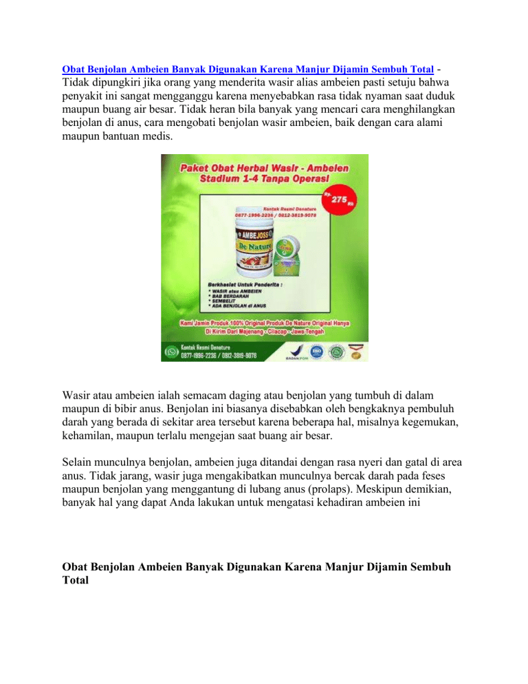 Obat Benjolan Ambeien Banyak Digunakan Karena Manjur Dijamin Sembuh Total - Tidak dipungkiri jika orang yang menderita wasir alias ambeien pasti setuju bahwa penyakit ini sangat mengganggu karena menyebabkan rasa tidak nyaman saat duduk maupun buang air besar. Tidak heran bila banyak yang mencari cara menghilangkan benjolan di anus, cara mengobati benjolan wasir ambeien, baik dengan cara alami maupun bantuan medis. Wasir atau ambeien ialah semacam daging atau benjolan yang tumbuh di dalam maupun di bibir anus. Benjolan ini biasanya disebabkan oleh bengkaknya pembuluh darah yang berada di sekitar area tersebut karena beberapa hal, misalnya kegemukan, kehamilan, maupun terlalu mengejan saat buang air besar. Selain munculnya benjolan, ambeien juga ditandai dengan rasa nyeri dan gatal di area anus. Tidak jarang, wasir juga mengakibatkan munculnya bercak darah pada feses maupun benjolan yang menggantung di lubang anus (prolaps). Meskipun demikian, banyak hal yang dapat Anda lakukan untuk mengatasi kehadiran ambeien ini Obat Benjolan Ambeien Banyak Digunakan Karena Manjur Dijamin Sembuh Total Secara umum, ambeien terbagi menjadi 2 jenis, yaitu ambeien dalam dan ambeien luar. Perbedaan yang utama dari kedua jenis ambeien tersebut adalah letak terbentuknya ambeien. Apa saja ciri-cirinya? Mari simak ulasan berikut. JENIS AMBEIEN DAN CIRI CIRINYA Ambeien terjadi ketika pembuluh darah di usus besar bagian akhir (rektum) dan dubur atau anus membengkak. Berdasarkan lokasi dan gejala yang ditimbulkan, ambeien terbagi menjadi 2 jenis, yaitu: Ambeien dalam (internal hemorrhoid) Disebut demikian karena pembengkakan yang terjadi berada di dalam anus, tepatnya di liang rektum. Ambeien internal jauh di dalam rektum dan tidak terlihat dari luar. Umumnya, ambeien dalam tidak menimbulkan keluhan sakit karena di liang rektum tidak banyak terdapat saraf. Seringkali, tanda pertama bahwa wasir internal hadir adalah pendarahan dubur. Gejala ambeien dalam yang lain adalah gatal dan nyeri pada anus. Gejala ini biasanya baru muncul ketika ambeien dalam menjadi semakin besar. Mengejan kadang-kadang dapat mendorong wasir internal sehingga menjorok melalui anus. Ini disebut ambeien yang menonjol atau prolaps dan bisa terasa sakit. Ambeien luar (external hemorrhoid) Pada jenis ambeien ini, lokasi pembengkakannya berada di luar rektum atau lebih tepatnya di sekitar lubang anus. Orang yang mengalami ambeien luar dapat mengeluhkan beberapa gejala, seperti: Rasa perih dan panas di sekitar anus. Gatal pada anus. Adanya benjolan atau pembengkakan di sekitar anus. BAB berdarah. Dari gejalanya, ambeien luar terasa lebih nyeri dan sering kali membuat penderitanya merasa tidak nyaman. Hal ini karena pembuluh darah yang mengalami pembengkakan berada di bawah kulit sekitar anus, di mana ada lebih banyak saraf di area tersebut. Obat Benjolan Ambeien Banyak Digunakan Karena Manjur Dijamin Sembuh Total CIRI CIRI AMBEIEN ATAU WASIR SECARA UMUM Secara umum, ciri-ciri yang sering dialami penderita adalah perdarahan saat sedang buang air besar. Perdarahan ini bisa berupa bercak darah pada feses atau tetesan darah yang mengalir dari dubur. Selain itu, ada beberapa ciri lain yang bisa dideteksi, di antaranya: 1. Rasa Mengganjal Saat Buang Air Besar Sering kali kita merasa ada sesuatu yang membuat proses buang air besar tertahan. Akibatnya kita akan mengejan dan berusaha mengeluarkan feses dari dubur. Dalam beberapa kasus, mengejan justru akan membuat pembuluh vena pecah dan menimbulkan benjolan (ambeien). Namun, apabila sejak awal penyebab BAB tertahan adalah benjolan tersebut, maka proses mengejan justru akan memperparah ambeien atau wasir yang sudah dimiliki. Jika dibiarkan lama kelamaan akan timbul perdarahan. 2. Rasa Tidak Nyaman pada Anus Selain perdarahan dan gatal, penderita ambeien atau wasir biasanya akan memiliki benjolan di lubang anus. Nah, benjolan inilah yang sering kali menimbulkan rasa tidak nyaman. Ketika merasa tidak nyaman, penderita akan mengalami kesulitan saat harus duduk atau jongkok dalam waktu yang lama. 3. Prolaps Prolaps merupakan keluarnya bagian ambeien atau wasir dari lubang anus. Muncul benjolan keluar dari anus setelah buang air besar. Benjolan dapat masuk sendiri atau harus didorong terlebih dahulu. Jadi, jika saat meraba bagian dubur, Anda mendapati daging yang menonjol berwarna merah muda (lebih terang) dari area sekitarnya dan terasa perih atau bahkan mengeluarkan darah, bisa dipastikan Anda menderita penyakit ambeien atau wasir. 4. Anemia Skunder Wajah pucat, tubuh mudah lemas dan sulit berkonsensentrasi. Gejala ini biasanya muncul bila telah terjadi komplikasi anemia akibat perdarahan yang berlebihan. Perdarahan pada dubur akibat ambeien tentu saja akan membuat penderita mengalami kukurangan darah. Hal ini sering kali menjadi pemicu penyakit lain, salah satunya anemia sekunder. Apabila hal ini yang Anda alami, bisa saja penyebabnya adalah ambeien atau wasir. 5. Infeksi di Daerah Dubur Luka pada ambeien akibat perdarahan akan membuat kuman mudah masuk ke dalam tubuh, hal ini akan menimbulkan infeksi. Jika anus terasa sakit dan perih setiap buang air besar, bisa jadi Anda memiliki ambeien atau wasir. Tingkatan Stadium Wasir Atau sakit Ambeien Wasir stadium 1 : Wasir jenis ini biasanya tidak sampai prolaps. Rasanya hanya kurang nyaman saat BAB. Ambeien stadium 2 : Bagian anus sudah bisa diraba ada benjolan, namun biasanya benjolan bisa masuk dengan sendirinya dan kadang ada rasa panas serta gatal. Wasir stadium 3 : Benjolan pada anus sudah besar dan susah masuk lagi harus dibantu dengan jari. Ambeien stadium 4 : Benjolan wasie sudah besar sekali dan sulit untuk dimasukan lagi meskipun dengan bantuan tangan, selain itu juga menjadi sering pendarahan. Cara menghilangkan benjolan ambeien dengan bantuan medis Dokter akan memprioritaskan penanganan tanpa operasi, namun bila wasir Anda sudah sangat parah atau amat mengganggu, bukan tidak mungkin Anda akan diminta menjalani prosedur pembedahan. Cara menghilangkan b