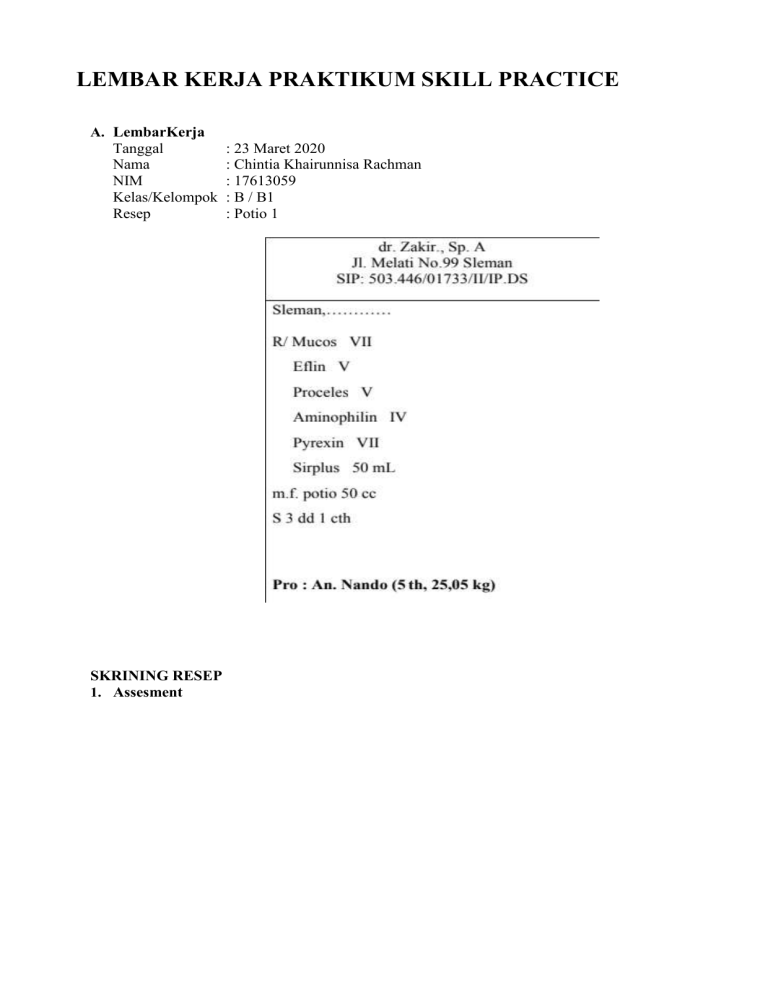 LEMBAR KERJA PRAKTIKUM SKILL PRACTICE A. LembarKerja Tanggal Nama NIM Kelas/Kelompok Resep SKRINING RESEP 1. Assesment : 23 Maret 2020 : Chintia Khairunnisa Rachman : 17613059 : B / B1 : Potio 1 a. Administratif No 1. 2. 3. 4. 5. 6. 7. 8. 9. 10. 11. 12. 13. 14. Uraian Nama dokter SIP dokter Alamat dokter Tanggal penulisan resep Paraf/tanda tangan dokter Nama pasien Alamat pasien Umur pasien Jenis kelamin Berat Badan Nama obat Kekutan obat Jumlah obat Aturan pakai Pada resep Ada Tidak * * * * * * * * * Kesimpulan : Resep tersebut lengkap/tidak lengkap. Resep tidak lengkap karena: Tidak ada tanggal penulisan resep , paraf/tanda tangan dokter , alamat pasien , jenis kelamin dan kekuatan obat. Catatan pengatasan hal tersebut: Dokter perlu melengkapi resep dengan mengisi tanggal, paraf/ tanda tangan dan kekuatan obat. Serta dapat mengisi alamat dan jenis kelamin pasien dengan cara menanyakan langsung kepada pasien. a. Kesesuaian Farmasetis 1. Mucos No Kriteria 1. Bentuk sedian 2. Stabilitas obat 3. Inkompatibiltas 4. Cara pemberian 5. Jumlah dan aturan pakai Permasalahan Tablet Tidak dicantumkan dalam resep Oral 2-3 x sehari 1/2 tablet Pengatasan Dokter menuliskan bentuk sediaan pada resep No 1. 2. Eflin Kriteria Bentuk sedian 2. Stabilitas obat 3. Inkompatibiltas 4. Cara pemberian 5. Jumlah dan aturan pakai 3. Proceles No Kriteria 1. Bentuk sedian 2. Stabilitas obat 3. Inkompatibiltas 4. Cara pemberian 5. Jumlah dan aturan pakai 4. Aminophilin No Kriteria 1. Bentuk sedian 2. Stabilitas obat 3. Inkompatibiltas 4. Cara pemberian 5. Jumlah dan aturan pakai No 1. 5. Phyrexin Kriteria Bentuk sedian 2. Stabilitas obat 3. Inkompatibiltas Permasalahan Tablet Tidak dicantumkan dalam resep Pengatasan Dokter menuliskan bentuk sediaan pada resep Oral 3 x 1 hari 1 tablet Permasalahan Tablet Tidak dicantumkan dalam resep Pengatasan Dokter menuliskan bentuk sediaan pada resep Oral 3 x 1 hari 1/2 tablet Permasalahan Tablet Tidak dicantumkan dalam resep Pengatasan Dokter menuliskan bentuk sediaan pada resep Oral 1 mg / Kg BB per jam Permasalahan Tablet Tidak dicantumkan dalam resep Pengatasan Dokter menuliskan bentuk sediaan pada resep 4. Cara pemberian 5. Jumlah dan aturan pakai 6. Sirplus No Kriteria 1. Bentuk sedian 2. Stabilitas obat 3. Inkompatibiltas 4. Cara pemberian 5. Jumlah dan aturan pakai Oral 1/2 - 1 tablet 3 - 4 x sehari Permasalahan Sirup Tidak dicantumkan dalam resep Pengatasan Dokter menuliskan bentuk sediaan pada resep Oral 50-100 mL b. Kesesuaian Klinis No Nama Obat Dosis resep Dosis literatur Kesimpulan Rekomendasi dosis 1. Mucos 21 mg/ hari 30 mg 7,5 - 15 mg Overdose IV 2. Eflin 30 mg / hari 10 mg / hari Overdose III 3. Proceles 1 mg / Kg BB 1 mg / KgBB Dosis sudah sesuai 4. Aminophilin 80 mg / Kg BB 1 mg / KgBB Overdose 5. Pyrexin 350 mg / hari 250 - 500 mg Dosis sudah sesuai 6. Sirplus 50 mL 50 mL Dosis sudah sesuai II Pehitungan & penimbangan bahan : Compatibilitas dan stabilitas : Instruksi Pengerjaan : 1. Alat dan bahan disiapkan. 2. Kalibrasi botol terlebih dahulu. 3. Disetarakan timbangan. 4. Ditimbang masing-masing bahan. 5. Digerus berdasarkan obat yang terkecil 6. Dilarutkan semua bahan obat dengan sebagian Aquadest sebanyak 10 ml di dalam beaker glass, aduk ad larut. bilas beaker glass 7. Ditambahkan Sirplus 50mL sebagai pemanis. 8. Ditambahkan Aquadest ad tanda botol kalibrasi 60 ml ke dalam botol. 9. Dikocok perlahan, beri etiket dan label, lalu serahkan. Label Informasi/Etiket : Container use (penyimpanan) : Dalam wadah tertutup rapat dan tempat yang sejuk. Packaging and storage requirements : Botol kaca berwarna gelap.