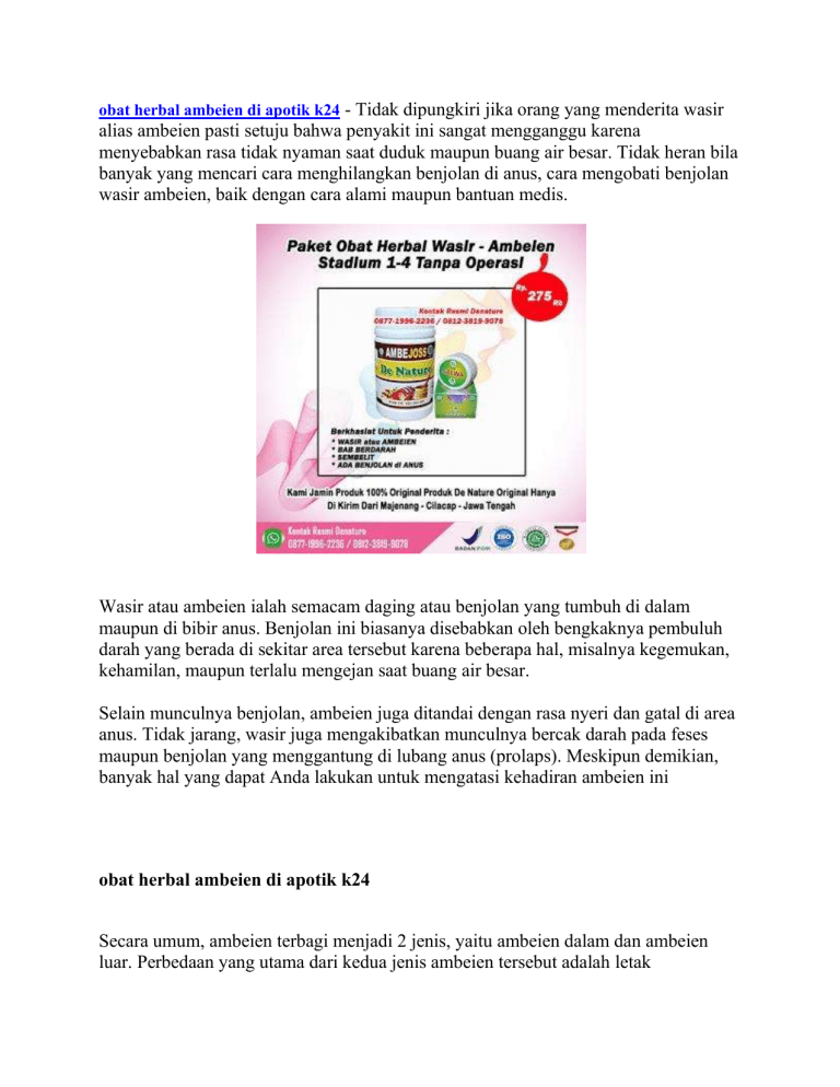 obat herbal ambeien di apotik k24 - Tidak dipungkiri jika orang yang menderita wasir alias ambeien pasti setuju bahwa penyakit ini sangat mengganggu karena menyebabkan rasa tidak nyaman saat duduk maupun buang air besar. Tidak heran bila banyak yang mencari cara menghilangkan benjolan di anus, cara mengobati benjolan wasir ambeien, baik dengan cara alami maupun bantuan medis. Wasir atau ambeien ialah semacam daging atau benjolan yang tumbuh di dalam maupun di bibir anus. Benjolan ini biasanya disebabkan oleh bengkaknya pembuluh darah yang berada di sekitar area tersebut karena beberapa hal, misalnya kegemukan, kehamilan, maupun terlalu mengejan saat buang air besar. Selain munculnya benjolan, ambeien juga ditandai dengan rasa nyeri dan gatal di area anus. Tidak jarang, wasir juga mengakibatkan munculnya bercak darah pada feses maupun benjolan yang menggantung di lubang anus (prolaps). Meskipun demikian, banyak hal yang dapat Anda lakukan untuk mengatasi kehadiran ambeien ini obat herbal ambeien di apotik k24 Secara umum, ambeien terbagi menjadi 2 jenis, yaitu ambeien dalam dan ambeien luar. Perbedaan yang utama dari kedua jenis ambeien tersebut adalah letak terbentuknya ambeien. Apa saja ciri-cirinya? Mari simak ulasan berikut. JENIS AMBEIEN DAN CIRI CIRINYA Ambeien terjadi ketika pembuluh darah di usus besar bagian akhir (rektum) dan dubur atau anus membengkak. Berdasarkan lokasi dan gejala yang ditimbulkan, ambeien terbagi menjadi 2 jenis, yaitu: Ambeien dalam (internal hemorrhoid) Disebut demikian karena pembengkakan yang terjadi berada di dalam anus, tepatnya di liang rektum. Ambeien internal jauh di dalam rektum dan tidak terlihat dari luar. Umumnya, ambeien dalam tidak menimbulkan keluhan sakit karena di liang rektum tidak banyak terdapat saraf. Seringkali, tanda pertama bahwa wasir internal hadir adalah pendarahan dubur. Gejala ambeien dalam yang lain adalah gatal dan nyeri pada anus. Gejala ini biasanya baru muncul ketika ambeien dalam menjadi semakin besar. Mengejan kadang-kadang dapat mendorong wasir internal sehingga menjorok melalui anus. Ini disebut ambeien yang menonjol atau prolaps dan bisa terasa sakit. Ambeien luar (external hemorrhoid) Pada jenis ambeien ini, lokasi pembengkakannya berada di luar rektum atau lebih tepatnya di sekitar lubang anus. Orang yang mengalami ambeien luar dapat mengeluhkan beberapa gejala, seperti: Rasa perih dan panas di sekitar anus. Gatal pada anus. Adanya benjolan atau pembengkakan di sekitar anus. BAB berdarah. Dari gejalanya, ambeien luar terasa lebih nyeri dan sering kali membuat penderitanya merasa tidak nyaman. Hal ini karena pembuluh darah yang mengalami pembengkakan berada di bawah kulit sekitar anus, di mana ada lebih banyak saraf di area tersebut. obat herbal ambeien di apotik k24 CIRI CIRI AMBEIEN ATAU WASIR SECARA UMUM Secara umum, ciri-ciri yang sering dialami penderita adalah perdarahan saat sedang buang air besar. Perdarahan ini bisa berupa bercak darah pada feses atau tetesan darah yang mengalir dari dubur. Selain itu, ada beberapa ciri lain yang bisa dideteksi, di antaranya: 1. Rasa Mengganjal Saat Buang Air Besar Sering kali kita merasa ada sesuatu yang membuat proses buang air besar tertahan. Akibatnya kita akan mengejan dan berusaha mengeluarkan feses dari dubur. Dalam beberapa kasus, mengejan justru akan membuat pembuluh vena pecah dan menimbulkan benjolan (ambeien). Namun, apabila sejak awal penyebab BAB tertahan adalah benjolan tersebut, maka proses mengejan justru akan memperparah ambeien atau wasir yang sudah dimiliki. Jika dibiarkan lama kelamaan akan timbul perdarahan. 2. Rasa Tidak Nyaman pada Anus Selain perdarahan dan gatal, penderita ambeien atau wasir biasanya akan memiliki benjolan di lubang anus. Nah, benjolan inilah yang sering kali menimbulkan rasa tidak nyaman. Ketika merasa tidak nyaman, penderita akan mengalami kesulitan saat harus duduk atau jongkok dalam waktu yang lama. 3. Prolaps Prolaps merupakan keluarnya bagian ambeien atau wasir dari lubang anus. Muncul benjolan keluar dari anus setelah buang air besar. Benjolan dapat masuk sendiri atau harus didorong terlebih dahulu. Jadi, jika saat meraba bagian dubur, Anda mendapati daging yang menonjol berwarna merah muda (lebih terang) dari area sekitarnya dan terasa perih atau bahkan mengeluarkan darah, bisa dipastikan Anda menderita penyakit ambeien atau wasir. 4. Anemia Skunder Wajah pucat, tubuh mudah lemas dan sulit berkonsensentrasi. Gejala ini biasanya muncul bila telah terjadi komplikasi anemia akibat perdarahan yang berlebihan. Perdarahan pada dubur akibat ambeien tentu saja akan membuat penderita mengalami kukurangan darah. Hal ini sering kali menjadi pemicu penyakit lain, salah satunya anemia sekunder. Apabila hal ini yang Anda alami, bisa saja penyebabnya adalah ambeien atau wasir. 5. Infeksi di Daerah Dubur Luka pada ambeien akibat perdarahan akan membuat kuman mudah masuk ke dalam tubuh, hal ini akan menimbulkan infeksi. Jika anus terasa sakit dan perih setiap buang air besar, bisa jadi Anda memiliki ambeien atau wasir. Tingkatan Stadium Wasir Atau sakit Ambeien Wasir stadium 1 : Wasir jenis ini biasanya tidak sampai prolaps. Rasanya hanya kurang nyaman saat BAB. Ambeien stadium 2 : Bagian anus sudah bisa diraba ada benjolan, namun biasanya benjolan bisa masuk dengan sendirinya dan kadang ada rasa panas serta gatal. Wasir stadium 3 : Benjolan pada anus sudah besar dan susah masuk lagi harus dibantu dengan jari. Ambeien stadium 4 : Benjolan wasie sudah besar sekali dan sulit untuk dimasukan lagi meskipun dengan bantuan tangan, selain itu juga menjadi sering pendarahan. Cara menghilangkan benjolan ambeien dengan bantuan medis Dokter akan memprioritaskan penanganan tanpa operasi, namun bila wasir Anda sudah sangat parah atau amat mengganggu, bukan tidak mungkin Anda akan diminta menjalani prosedur pembedahan. Cara menghilangkan benjolan ambeien tanpa operasi adalah: Rubber band litigation, yakni dengan mengikat ujung benjolan yang menempel ke kuli