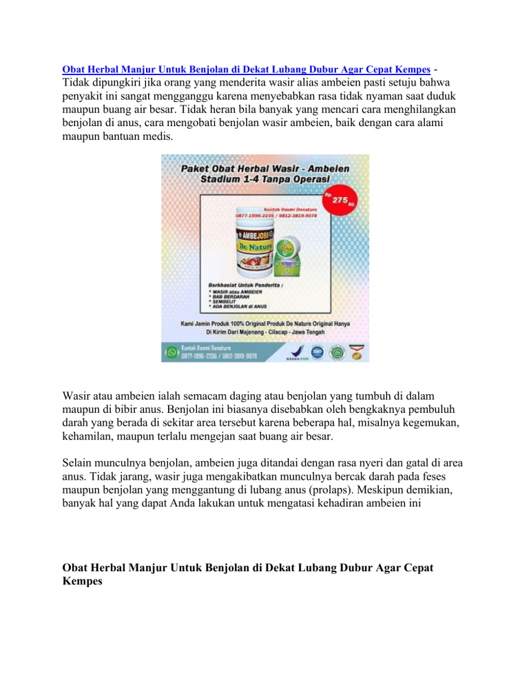 Obat Herbal Manjur Untuk Benjolan di Dekat Lubang Dubur Agar Cepat Kempes - Tidak dipungkiri jika orang yang menderita wasir alias ambeien pasti setuju bahwa penyakit ini sangat mengganggu karena menyebabkan rasa tidak nyaman saat duduk maupun buang air besar. Tidak heran bila banyak yang mencari cara menghilangkan benjolan di anus, cara mengobati benjolan wasir ambeien, baik dengan cara alami maupun bantuan medis. Wasir atau ambeien ialah semacam daging atau benjolan yang tumbuh di dalam maupun di bibir anus. Benjolan ini biasanya disebabkan oleh bengkaknya pembuluh darah yang berada di sekitar area tersebut karena beberapa hal, misalnya kegemukan, kehamilan, maupun terlalu mengejan saat buang air besar. Selain munculnya benjolan, ambeien juga ditandai dengan rasa nyeri dan gatal di area anus. Tidak jarang, wasir juga mengakibatkan munculnya bercak darah pada feses maupun benjolan yang menggantung di lubang anus (prolaps). Meskipun demikian, banyak hal yang dapat Anda lakukan untuk mengatasi kehadiran ambeien ini Obat Herbal Manjur Untuk Benjolan di Dekat Lubang Dubur Agar Cepat Kempes Secara umum, ambeien terbagi menjadi 2 jenis, yaitu ambeien dalam dan ambeien luar. Perbedaan yang utama dari kedua jenis ambeien tersebut adalah letak terbentuknya ambeien. Apa saja ciri-cirinya? Mari simak ulasan berikut. JENIS AMBEIEN DAN CIRI CIRINYA Ambeien terjadi ketika pembuluh darah di usus besar bagian akhir (rektum) dan dubur atau anus membengkak. Berdasarkan lokasi dan gejala yang ditimbulkan, ambeien terbagi menjadi 2 jenis, yaitu: Ambeien dalam (internal hemorrhoid) Disebut demikian karena pembengkakan yang terjadi berada di dalam anus, tepatnya di liang rektum. Ambeien internal jauh di dalam rektum dan tidak terlihat dari luar. Umumnya, ambeien dalam tidak menimbulkan keluhan sakit karena di liang rektum tidak banyak terdapat saraf. Seringkali, tanda pertama bahwa wasir internal hadir adalah pendarahan dubur. Gejala ambeien dalam yang lain adalah gatal dan nyeri pada anus. Gejala ini biasanya baru muncul ketika ambeien dalam menjadi semakin besar. Mengejan kadang-kadang dapat mendorong wasir internal sehingga menjorok melalui anus. Ini disebut ambeien yang menonjol atau prolaps dan bisa terasa sakit. Ambeien luar (external hemorrhoid) Pada jenis ambeien ini, lokasi pembengkakannya berada di luar rektum atau lebih tepatnya di sekitar lubang anus. Orang yang mengalami ambeien luar dapat mengeluhkan beberapa gejala, seperti: Rasa perih dan panas di sekitar anus. Gatal pada anus. Adanya benjolan atau pembengkakan di sekitar anus. BAB berdarah. Dari gejalanya, ambeien luar terasa lebih nyeri dan sering kali membuat penderitanya merasa tidak nyaman. Hal ini karena pembuluh darah yang mengalami pembengkakan berada di bawah kulit sekitar anus, di mana ada lebih banyak saraf di area tersebut. Obat Herbal Manjur Untuk Benjolan di Dekat Lubang Dubur Agar Cepat Kempes CIRI CIRI AMBEIEN ATAU WASIR SECARA UMUM Secara umum, ciri-ciri yang sering dialami penderita adalah perdarahan saat sedang buang air besar. Perdarahan ini bisa berupa bercak darah pada feses atau tetesan darah yang mengalir dari dubur. Selain itu, ada beberapa ciri lain yang bisa dideteksi, di antaranya: 1. Rasa Mengganjal Saat Buang Air Besar Sering kali kita merasa ada sesuatu yang membuat proses buang air besar tertahan. Akibatnya kita akan mengejan dan berusaha mengeluarkan feses dari dubur. Dalam beberapa kasus, mengejan justru akan membuat pembuluh vena pecah dan menimbulkan benjolan (ambeien). Namun, apabila sejak awal penyebab BAB tertahan adalah benjolan tersebut, maka proses mengejan justru akan memperparah ambeien atau wasir yang sudah dimiliki. Jika dibiarkan lama kelamaan akan timbul perdarahan. 2. Rasa Tidak Nyaman pada Anus Selain perdarahan dan gatal, penderita ambeien atau wasir biasanya akan memiliki benjolan di lubang anus. Nah, benjolan inilah yang sering kali menimbulkan rasa tidak nyaman. Ketika merasa tidak nyaman, penderita akan mengalami kesulitan saat harus duduk atau jongkok dalam waktu yang lama. 3. Prolaps Prolaps merupakan keluarnya bagian ambeien atau wasir dari lubang anus. Muncul benjolan keluar dari anus setelah buang air besar. Benjolan dapat masuk sendiri atau harus didorong terlebih dahulu. Jadi, jika saat meraba bagian dubur, Anda mendapati daging yang menonjol berwarna merah muda (lebih terang) dari area sekitarnya dan terasa perih atau bahkan mengeluarkan darah, bisa dipastikan Anda menderita penyakit ambeien atau wasir. 4. Anemia Skunder Wajah pucat, tubuh mudah lemas dan sulit berkonsensentrasi. Gejala ini biasanya muncul bila telah terjadi komplikasi anemia akibat perdarahan yang berlebihan. Perdarahan pada dubur akibat ambeien tentu saja akan membuat penderita mengalami kukurangan darah. Hal ini sering kali menjadi pemicu penyakit lain, salah satunya anemia sekunder. Apabila hal ini yang Anda alami, bisa saja penyebabnya adalah ambeien atau wasir. 5. Infeksi di Daerah Dubur Luka pada ambeien akibat perdarahan akan membuat kuman mudah masuk ke dalam tubuh, hal ini akan menimbulkan infeksi. Jika anus terasa sakit dan perih setiap buang air besar, bisa jadi Anda memiliki ambeien atau wasir. Tingkatan Stadium Wasir Atau sakit Ambeien Wasir stadium 1 : Wasir jenis ini biasanya tidak sampai prolaps. Rasanya hanya kurang nyaman saat BAB. Ambeien stadium 2 : Bagian anus sudah bisa diraba ada benjolan, namun biasanya benjolan bisa masuk dengan sendirinya dan kadang ada rasa panas serta gatal. Wasir stadium 3 : Benjolan pada anus sudah besar dan susah masuk lagi harus dibantu dengan jari. Ambeien stadium 4 : Benjolan wasie sudah besar sekali dan sulit untuk dimasukan lagi meskipun dengan bantuan tangan, selain itu juga menjadi sering pendarahan. Cara menghilangkan benjolan ambeien dengan bantuan medis Dokter akan memprioritaskan penanganan tanpa operasi, namun bila wasir Anda sudah sangat parah atau amat mengganggu, bukan tidak mungkin Anda akan diminta menjalani prosedur pembedahan. Cara menghilangkan b