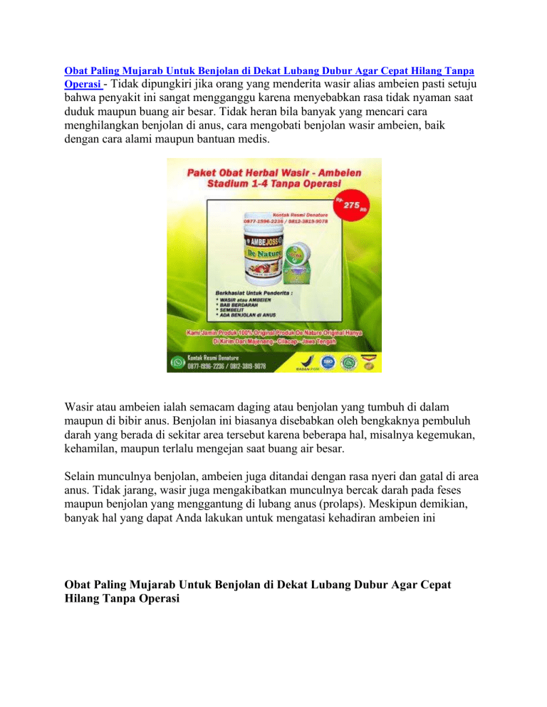 Obat Paling Mujarab Untuk Benjolan di Dekat Lubang Dubur Agar Cepat Hilang Tanpa Operasi - Tidak dipungkiri jika orang yang menderita wasir alias ambeien pasti setuju bahwa penyakit ini sangat mengganggu karena menyebabkan rasa tidak nyaman saat duduk maupun buang air besar. Tidak heran bila banyak yang mencari cara menghilangkan benjolan di anus, cara mengobati benjolan wasir ambeien, baik dengan cara alami maupun bantuan medis. Wasir atau ambeien ialah semacam daging atau benjolan yang tumbuh di dalam maupun di bibir anus. Benjolan ini biasanya disebabkan oleh bengkaknya pembuluh darah yang berada di sekitar area tersebut karena beberapa hal, misalnya kegemukan, kehamilan, maupun terlalu mengejan saat buang air besar. Selain munculnya benjolan, ambeien juga ditandai dengan rasa nyeri dan gatal di area anus. Tidak jarang, wasir juga mengakibatkan munculnya bercak darah pada feses maupun benjolan yang menggantung di lubang anus (prolaps). Meskipun demikian, banyak hal yang dapat Anda lakukan untuk mengatasi kehadiran ambeien ini Obat Paling Mujarab Untuk Benjolan di Dekat Lubang Dubur Agar Cepat Hilang Tanpa Operasi Secara umum, ambeien terbagi menjadi 2 jenis, yaitu ambeien dalam dan ambeien luar. Perbedaan yang utama dari kedua jenis ambeien tersebut adalah letak terbentuknya ambeien. Apa saja ciri-cirinya? Mari simak ulasan berikut. JENIS AMBEIEN DAN CIRI CIRINYA Ambeien terjadi ketika pembuluh darah di usus besar bagian akhir (rektum) dan dubur atau anus membengkak. Berdasarkan lokasi dan gejala yang ditimbulkan, ambeien terbagi menjadi 2 jenis, yaitu: Ambeien dalam (internal hemorrhoid) Disebut demikian karena pembengkakan yang terjadi berada di dalam anus, tepatnya di liang rektum. Ambeien internal jauh di dalam rektum dan tidak terlihat dari luar. Umumnya, ambeien dalam tidak menimbulkan keluhan sakit karena di liang rektum tidak banyak terdapat saraf. Seringkali, tanda pertama bahwa wasir internal hadir adalah pendarahan dubur. Gejala ambeien dalam yang lain adalah gatal dan nyeri pada anus. Gejala ini biasanya baru muncul ketika ambeien dalam menjadi semakin besar. Mengejan kadang-kadang dapat mendorong wasir internal sehingga menjorok melalui anus. Ini disebut ambeien yang menonjol atau prolaps dan bisa terasa sakit. Ambeien luar (external hemorrhoid) Pada jenis ambeien ini, lokasi pembengkakannya berada di luar rektum atau lebih tepatnya di sekitar lubang anus. Orang yang mengalami ambeien luar dapat mengeluhkan beberapa gejala, seperti: Rasa perih dan panas di sekitar anus. Gatal pada anus. Adanya benjolan atau pembengkakan di sekitar anus. BAB berdarah. Dari gejalanya, ambeien luar terasa lebih nyeri dan sering kali membuat penderitanya merasa tidak nyaman. Hal ini karena pembuluh darah yang mengalami pembengkakan berada di bawah kulit sekitar anus, di mana ada lebih banyak saraf di area tersebut. Obat Paling Mujarab Untuk Benjolan di Dekat Lubang Dubur Agar Cepat Hilang Tanpa Operasi CIRI CIRI AMBEIEN ATAU WASIR SECARA UMUM Secara umum, ciri-ciri yang sering dialami penderita adalah perdarahan saat sedang buang air besar. Perdarahan ini bisa berupa bercak darah pada feses atau tetesan darah yang mengalir dari dubur. Selain itu, ada beberapa ciri lain yang bisa dideteksi, di antaranya: 1. Rasa Mengganjal Saat Buang Air Besar Sering kali kita merasa ada sesuatu yang membuat proses buang air besar tertahan. Akibatnya kita akan mengejan dan berusaha mengeluarkan feses dari dubur. Dalam beberapa kasus, mengejan justru akan membuat pembuluh vena pecah dan menimbulkan benjolan (ambeien). Namun, apabila sejak awal penyebab BAB tertahan adalah benjolan tersebut, maka proses mengejan justru akan memperparah ambeien atau wasir yang sudah dimiliki. Jika dibiarkan lama kelamaan akan timbul perdarahan. 2. Rasa Tidak Nyaman pada Anus Selain perdarahan dan gatal, penderita ambeien atau wasir biasanya akan memiliki benjolan di lubang anus. Nah, benjolan inilah yang sering kali menimbulkan rasa tidak nyaman. Ketika merasa tidak nyaman, penderita akan mengalami kesulitan saat harus duduk atau jongkok dalam waktu yang lama. 3. Prolaps Prolaps merupakan keluarnya bagian ambeien atau wasir dari lubang anus. Muncul benjolan keluar dari anus setelah buang air besar. Benjolan dapat masuk sendiri atau harus didorong terlebih dahulu. Jadi, jika saat meraba bagian dubur, Anda mendapati daging yang menonjol berwarna merah muda (lebih terang) dari area sekitarnya dan terasa perih atau bahkan mengeluarkan darah, bisa dipastikan Anda menderita penyakit ambeien atau wasir. 4. Anemia Skunder Wajah pucat, tubuh mudah lemas dan sulit berkonsensentrasi. Gejala ini biasanya muncul bila telah terjadi komplikasi anemia akibat perdarahan yang berlebihan. Perdarahan pada dubur akibat ambeien tentu saja akan membuat penderita mengalami kukurangan darah. Hal ini sering kali menjadi pemicu penyakit lain, salah satunya anemia sekunder. Apabila hal ini yang Anda alami, bisa saja penyebabnya adalah ambeien atau wasir. 5. Infeksi di Daerah Dubur Luka pada ambeien akibat perdarahan akan membuat kuman mudah masuk ke dalam tubuh, hal ini akan menimbulkan infeksi. Jika anus terasa sakit dan perih setiap buang air besar, bisa jadi Anda memiliki ambeien atau wasir. Tingkatan Stadium Wasir Atau sakit Ambeien Wasir stadium 1 : Wasir jenis ini biasanya tidak sampai prolaps. Rasanya hanya kurang nyaman saat BAB. Ambeien stadium 2 : Bagian anus sudah bisa diraba ada benjolan, namun biasanya benjolan bisa masuk dengan sendirinya dan kadang ada rasa panas serta gatal. Wasir stadium 3 : Benjolan pada anus sudah besar dan susah masuk lagi harus dibantu dengan jari. Ambeien stadium 4 : Benjolan wasie sudah besar sekali dan sulit untuk dimasukan lagi meskipun dengan bantuan tangan, selain itu juga menjadi sering pendarahan. Cara menghilangkan benjolan ambeien dengan bantuan medis Dokter akan memprioritaskan penanganan tanpa operasi, namun bila wasir Anda sudah sangat parah atau amat mengganggu, bukan tidak mungkin Anda akan diminta menjal