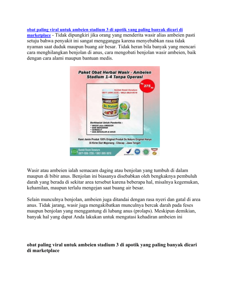 obat paling viral untuk ambeien stadium 3 di apotik yang paling banyak dicari di marketplace - Tidak dipungkiri jika orang yang menderita wasir alias ambeien pasti setuju bahwa penyakit ini sangat mengganggu karena menyebabkan rasa tidak nyaman saat duduk maupun buang air besar. Tidak heran bila banyak yang mencari cara menghilangkan benjolan di anus, cara mengobati benjolan wasir ambeien, baik dengan cara alami maupun bantuan medis. Wasir atau ambeien ialah semacam daging atau benjolan yang tumbuh di dalam maupun di bibir anus. Benjolan ini biasanya disebabkan oleh bengkaknya pembuluh darah yang berada di sekitar area tersebut karena beberapa hal, misalnya kegemukan, kehamilan, maupun terlalu mengejan saat buang air besar. Selain munculnya benjolan, ambeien juga ditandai dengan rasa nyeri dan gatal di area anus. Tidak jarang, wasir juga mengakibatkan munculnya bercak darah pada feses maupun benjolan yang menggantung di lubang anus (prolaps). Meskipun demikian, banyak hal yang dapat Anda lakukan untuk mengatasi kehadiran ambeien ini obat paling viral untuk ambeien stadium 3 di apotik yang paling banyak dicari di marketplace Secara umum, ambeien terbagi menjadi 2 jenis, yaitu ambeien dalam dan ambeien luar. Perbedaan yang utama dari kedua jenis ambeien tersebut adalah letak terbentuknya ambeien. Apa saja ciri-cirinya? Mari simak ulasan berikut. JENIS AMBEIEN DAN CIRI CIRINYA Ambeien terjadi ketika pembuluh darah di usus besar bagian akhir (rektum) dan dubur atau anus membengkak. Berdasarkan lokasi dan gejala yang ditimbulkan, ambeien terbagi menjadi 2 jenis, yaitu: Ambeien dalam (internal hemorrhoid) Disebut demikian karena pembengkakan yang terjadi berada di dalam anus, tepatnya di liang rektum. Ambeien internal jauh di dalam rektum dan tidak terlihat dari luar. Umumnya, ambeien dalam tidak menimbulkan keluhan sakit karena di liang rektum tidak banyak terdapat saraf. Seringkali, tanda pertama bahwa wasir internal hadir adalah pendarahan dubur. Gejala ambeien dalam yang lain adalah gatal dan nyeri pada anus. Gejala ini biasanya baru muncul ketika ambeien dalam menjadi semakin besar. Mengejan kadang-kadang dapat mendorong wasir internal sehingga menjorok melalui anus. Ini disebut ambeien yang menonjol atau prolaps dan bisa terasa sakit. Ambeien luar (external hemorrhoid) Pada jenis ambeien ini, lokasi pembengkakannya berada di luar rektum atau lebih tepatnya di sekitar lubang anus. Orang yang mengalami ambeien luar dapat mengeluhkan beberapa gejala, seperti: Rasa perih dan panas di sekitar anus. Gatal pada anus. Adanya benjolan atau pembengkakan di sekitar anus. BAB berdarah. Dari gejalanya, ambeien luar terasa lebih nyeri dan sering kali membuat penderitanya merasa tidak nyaman. Hal ini karena pembuluh darah yang mengalami pembengkakan berada di bawah kulit sekitar anus, di mana ada lebih banyak saraf di area tersebut. obat paling viral untuk ambeien stadium 3 di apotik yang paling banyak dicari di marketplace CIRI CIRI AMBEIEN ATAU WASIR SECARA UMUM Secara umum, ciri-ciri yang sering dialami penderita adalah perdarahan saat sedang buang air besar. Perdarahan ini bisa berupa bercak darah pada feses atau tetesan darah yang mengalir dari dubur. Selain itu, ada beberapa ciri lain yang bisa dideteksi, di antaranya: 1. Rasa Mengganjal Saat Buang Air Besar Sering kali kita merasa ada sesuatu yang membuat proses buang air besar tertahan. Akibatnya kita akan mengejan dan berusaha mengeluarkan feses dari dubur. Dalam beberapa kasus, mengejan justru akan membuat pembuluh vena pecah dan menimbulkan benjolan (ambeien). Namun, apabila sejak awal penyebab BAB tertahan adalah benjolan tersebut, maka proses mengejan justru akan memperparah ambeien atau wasir yang sudah dimiliki. Jika dibiarkan lama kelamaan akan timbul perdarahan. 2. Rasa Tidak Nyaman pada Anus Selain perdarahan dan gatal, penderita ambeien atau wasir biasanya akan memiliki benjolan di lubang anus. Nah, benjolan inilah yang sering kali menimbulkan rasa tidak nyaman. Ketika merasa tidak nyaman, penderita akan mengalami kesulitan saat harus duduk atau jongkok dalam waktu yang lama. 3. Prolaps Prolaps merupakan keluarnya bagian ambeien atau wasir dari lubang anus. Muncul benjolan keluar dari anus setelah buang air besar. Benjolan dapat masuk sendiri atau harus didorong terlebih dahulu. Jadi, jika saat meraba bagian dubur, Anda mendapati daging yang menonjol berwarna merah muda (lebih terang) dari area sekitarnya dan terasa perih atau bahkan mengeluarkan darah, bisa dipastikan Anda menderita penyakit ambeien atau wasir. 4. Anemia Skunder Wajah pucat, tubuh mudah lemas dan sulit berkonsensentrasi. Gejala ini biasanya muncul bila telah terjadi komplikasi anemia akibat perdarahan yang berlebihan. Perdarahan pada dubur akibat ambeien tentu saja akan membuat penderita mengalami kukurangan darah. Hal ini sering kali menjadi pemicu penyakit lain, salah satunya anemia sekunder. Apabila hal ini yang Anda alami, bisa saja penyebabnya adalah ambeien atau wasir. 5. Infeksi di Daerah Dubur Luka pada ambeien akibat perdarahan akan membuat kuman mudah masuk ke dalam tubuh, hal ini akan menimbulkan infeksi. Jika anus terasa sakit dan perih setiap buang air besar, bisa jadi Anda memiliki ambeien atau wasir. Tingkatan Stadium Wasir Atau sakit Ambeien Wasir stadium 1 : Wasir jenis ini biasanya tidak sampai prolaps. Rasanya hanya kurang nyaman saat BAB. Ambeien stadium 2 : Bagian anus sudah bisa diraba ada benjolan, namun biasanya benjolan bisa masuk dengan sendirinya dan kadang ada rasa panas serta gatal. Wasir stadium 3 : Benjolan pada anus sudah besar dan susah masuk lagi harus dibantu dengan jari. Ambeien stadium 4 : Benjolan wasie sudah besar sekali dan sulit untuk dimasukan lagi meskipun dengan bantuan tangan, selain itu juga menjadi sering pendarahan. Cara menghilangkan benjolan ambeien dengan bantuan medis Dokter akan memprioritaskan penanganan tanpa operasi, namun bila wasir Anda sudah sangat parah atau amat mengganggu, bukan tidak mungkin Anda akan di