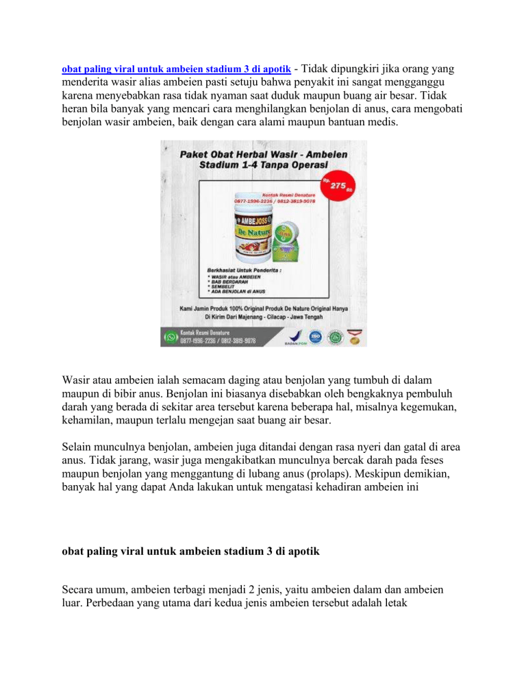 obat paling viral untuk ambeien stadium 3 di apotik - Tidak dipungkiri jika orang yang menderita wasir alias ambeien pasti setuju bahwa penyakit ini sangat mengganggu karena menyebabkan rasa tidak nyaman saat duduk maupun buang air besar. Tidak heran bila banyak yang mencari cara menghilangkan benjolan di anus, cara mengobati benjolan wasir ambeien, baik dengan cara alami maupun bantuan medis. Wasir atau ambeien ialah semacam daging atau benjolan yang tumbuh di dalam maupun di bibir anus. Benjolan ini biasanya disebabkan oleh bengkaknya pembuluh darah yang berada di sekitar area tersebut karena beberapa hal, misalnya kegemukan, kehamilan, maupun terlalu mengejan saat buang air besar. Selain munculnya benjolan, ambeien juga ditandai dengan rasa nyeri dan gatal di area anus. Tidak jarang, wasir juga mengakibatkan munculnya bercak darah pada feses maupun benjolan yang menggantung di lubang anus (prolaps). Meskipun demikian, banyak hal yang dapat Anda lakukan untuk mengatasi kehadiran ambeien ini obat paling viral untuk ambeien stadium 3 di apotik Secara umum, ambeien terbagi menjadi 2 jenis, yaitu ambeien dalam dan ambeien luar. Perbedaan yang utama dari kedua jenis ambeien tersebut adalah letak terbentuknya ambeien. Apa saja ciri-cirinya? Mari simak ulasan berikut. JENIS AMBEIEN DAN CIRI CIRINYA Ambeien terjadi ketika pembuluh darah di usus besar bagian akhir (rektum) dan dubur atau anus membengkak. Berdasarkan lokasi dan gejala yang ditimbulkan, ambeien terbagi menjadi 2 jenis, yaitu: Ambeien dalam (internal hemorrhoid) Disebut demikian karena pembengkakan yang terjadi berada di dalam anus, tepatnya di liang rektum. Ambeien internal jauh di dalam rektum dan tidak terlihat dari luar. Umumnya, ambeien dalam tidak menimbulkan keluhan sakit karena di liang rektum tidak banyak terdapat saraf. Seringkali, tanda pertama bahwa wasir internal hadir adalah pendarahan dubur. Gejala ambeien dalam yang lain adalah gatal dan nyeri pada anus. Gejala ini biasanya baru muncul ketika ambeien dalam menjadi semakin besar. Mengejan kadang-kadang dapat mendorong wasir internal sehingga menjorok melalui anus. Ini disebut ambeien yang menonjol atau prolaps dan bisa terasa sakit. Ambeien luar (external hemorrhoid) Pada jenis ambeien ini, lokasi pembengkakannya berada di luar rektum atau lebih tepatnya di sekitar lubang anus. Orang yang mengalami ambeien luar dapat mengeluhkan beberapa gejala, seperti: Rasa perih dan panas di sekitar anus. Gatal pada anus. Adanya benjolan atau pembengkakan di sekitar anus. BAB berdarah. Dari gejalanya, ambeien luar terasa lebih nyeri dan sering kali membuat penderitanya merasa tidak nyaman. Hal ini karena pembuluh darah yang mengalami pembengkakan berada di bawah kulit sekitar anus, di mana ada lebih banyak saraf di area tersebut. obat paling viral untuk ambeien stadium 3 di apotik CIRI CIRI AMBEIEN ATAU WASIR SECARA UMUM Secara umum, ciri-ciri yang sering dialami penderita adalah perdarahan saat sedang buang air besar. Perdarahan ini bisa berupa bercak darah pada feses atau tetesan darah yang mengalir dari dubur. Selain itu, ada beberapa ciri lain yang bisa dideteksi, di antaranya: 1. Rasa Mengganjal Saat Buang Air Besar Sering kali kita merasa ada sesuatu yang membuat proses buang air besar tertahan. Akibatnya kita akan mengejan dan berusaha mengeluarkan feses dari dubur. Dalam beberapa kasus, mengejan justru akan membuat pembuluh vena pecah dan menimbulkan benjolan (ambeien). Namun, apabila sejak awal penyebab BAB tertahan adalah benjolan tersebut, maka proses mengejan justru akan memperparah ambeien atau wasir yang sudah dimiliki. Jika dibiarkan lama kelamaan akan timbul perdarahan. 2. Rasa Tidak Nyaman pada Anus Selain perdarahan dan gatal, penderita ambeien atau wasir biasanya akan memiliki benjolan di lubang anus. Nah, benjolan inilah yang sering kali menimbulkan rasa tidak nyaman. Ketika merasa tidak nyaman, penderita akan mengalami kesulitan saat harus duduk atau jongkok dalam waktu yang lama. 3. Prolaps Prolaps merupakan keluarnya bagian ambeien atau wasir dari lubang anus. Muncul benjolan keluar dari anus setelah buang air besar. Benjolan dapat masuk sendiri atau harus didorong terlebih dahulu. Jadi, jika saat meraba bagian dubur, Anda mendapati daging yang menonjol berwarna merah muda (lebih terang) dari area sekitarnya dan terasa perih atau bahkan mengeluarkan darah, bisa dipastikan Anda menderita penyakit ambeien atau wasir. 4. Anemia Skunder Wajah pucat, tubuh mudah lemas dan sulit berkonsensentrasi. Gejala ini biasanya muncul bila telah terjadi komplikasi anemia akibat perdarahan yang berlebihan. Perdarahan pada dubur akibat ambeien tentu saja akan membuat penderita mengalami kukurangan darah. Hal ini sering kali menjadi pemicu penyakit lain, salah satunya anemia sekunder. Apabila hal ini yang Anda alami, bisa saja penyebabnya adalah ambeien atau wasir. 5. Infeksi di Daerah Dubur Luka pada ambeien akibat perdarahan akan membuat kuman mudah masuk ke dalam tubuh, hal ini akan menimbulkan infeksi. Jika anus terasa sakit dan perih setiap buang air besar, bisa jadi Anda memiliki ambeien atau wasir. Tingkatan Stadium Wasir Atau sakit Ambeien Wasir stadium 1 : Wasir jenis ini biasanya tidak sampai prolaps. Rasanya hanya kurang nyaman saat BAB. Ambeien stadium 2 : Bagian anus sudah bisa diraba ada benjolan, namun biasanya benjolan bisa masuk dengan sendirinya dan kadang ada rasa panas serta gatal. Wasir stadium 3 : Benjolan pada anus sudah besar dan susah masuk lagi harus dibantu dengan jari. Ambeien stadium 4 : Benjolan wasie sudah besar sekali dan sulit untuk dimasukan lagi meskipun dengan bantuan tangan, selain itu juga menjadi sering pendarahan. Cara menghilangkan benjolan ambeien dengan bantuan medis Dokter akan memprioritaskan penanganan tanpa operasi, namun bila wasir Anda sudah sangat parah atau amat mengganggu, bukan tidak mungkin Anda akan diminta menjalani prosedur pembedahan. Cara menghilangkan benjolan ambeien tanpa operasi adalah: Rubber band litigation, yakn