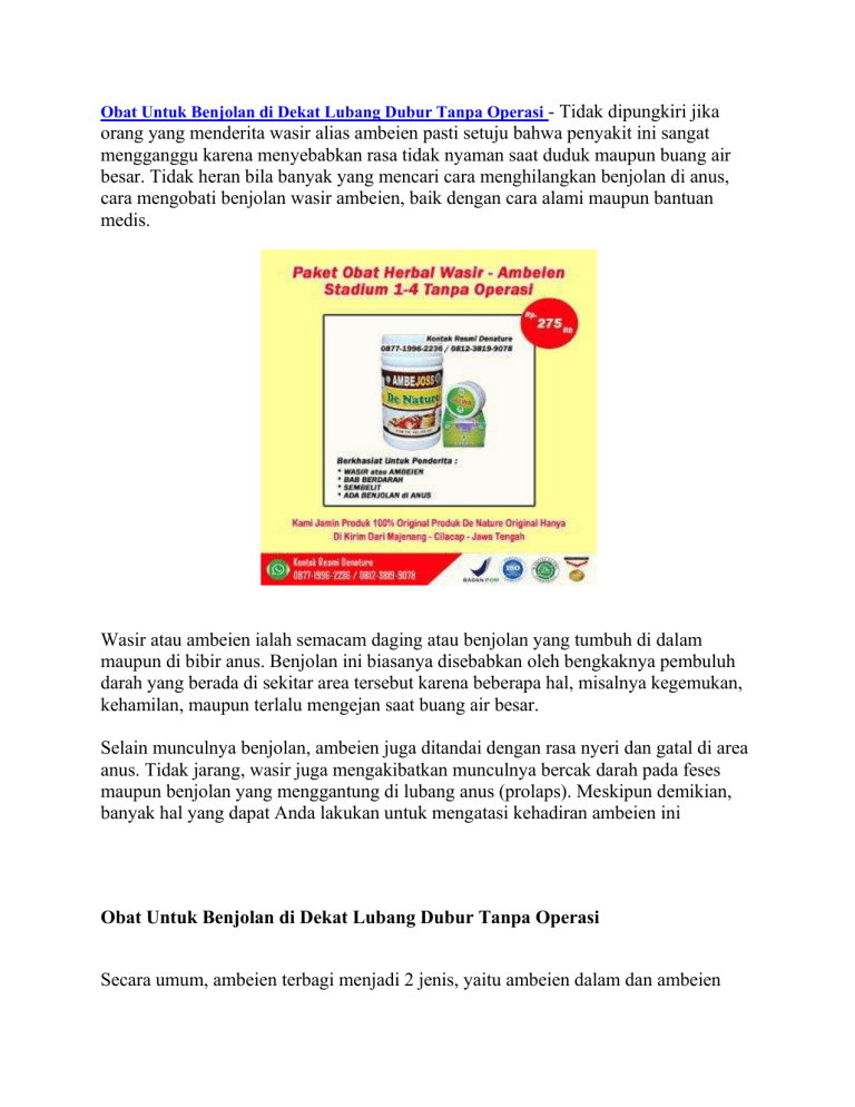 Obat Untuk Benjolan di Dekat Lubang Dubur Tanpa Operasi - Tidak dipungkiri jika orang yang menderita wasir alias ambeien pasti setuju bahwa penyakit ini sangat mengganggu karena menyebabkan rasa tidak nyaman saat duduk maupun buang air besar. Tidak heran bila banyak yang mencari cara menghilangkan benjolan di anus, cara mengobati benjolan wasir ambeien, baik dengan cara alami maupun bantuan medis. Wasir atau ambeien ialah semacam daging atau benjolan yang tumbuh di dalam maupun di bibir anus. Benjolan ini biasanya disebabkan oleh bengkaknya pembuluh darah yang berada di sekitar area tersebut karena beberapa hal, misalnya kegemukan, kehamilan, maupun terlalu mengejan saat buang air besar. Selain munculnya benjolan, ambeien juga ditandai dengan rasa nyeri dan gatal di area anus. Tidak jarang, wasir juga mengakibatkan munculnya bercak darah pada feses maupun benjolan yang menggantung di lubang anus (prolaps). Meskipun demikian, banyak hal yang dapat Anda lakukan untuk mengatasi kehadiran ambeien ini Obat Untuk Benjolan di Dekat Lubang Dubur Tanpa Operasi Secara umum, ambeien terbagi menjadi 2 jenis, yaitu ambeien dalam dan ambeien luar. Perbedaan yang utama dari kedua jenis ambeien tersebut adalah letak terbentuknya ambeien. Apa saja ciri-cirinya? Mari simak ulasan berikut. JENIS AMBEIEN DAN CIRI CIRINYA Ambeien terjadi ketika pembuluh darah di usus besar bagian akhir (rektum) dan dubur atau anus membengkak. Berdasarkan lokasi dan gejala yang ditimbulkan, ambeien terbagi menjadi 2 jenis, yaitu: Ambeien dalam (internal hemorrhoid) Disebut demikian karena pembengkakan yang terjadi berada di dalam anus, tepatnya di liang rektum. Ambeien internal jauh di dalam rektum dan tidak terlihat dari luar. Umumnya, ambeien dalam tidak menimbulkan keluhan sakit karena di liang rektum tidak banyak terdapat saraf. Seringkali, tanda pertama bahwa wasir internal hadir adalah pendarahan dubur. Gejala ambeien dalam yang lain adalah gatal dan nyeri pada anus. Gejala ini biasanya baru muncul ketika ambeien dalam menjadi semakin besar. Mengejan kadang-kadang dapat mendorong wasir internal sehingga menjorok melalui anus. Ini disebut ambeien yang menonjol atau prolaps dan bisa terasa sakit. Ambeien luar (external hemorrhoid) Pada jenis ambeien ini, lokasi pembengkakannya berada di luar rektum atau lebih tepatnya di sekitar lubang anus. Orang yang mengalami ambeien luar dapat mengeluhkan beberapa gejala, seperti: Rasa perih dan panas di sekitar anus. Gatal pada anus. Adanya benjolan atau pembengkakan di sekitar anus. BAB berdarah. Dari gejalanya, ambeien luar terasa lebih nyeri dan sering kali membuat penderitanya merasa tidak nyaman. Hal ini karena pembuluh darah yang mengalami pembengkakan berada di bawah kulit sekitar anus, di mana ada lebih banyak saraf di area tersebut. Obat Untuk Benjolan di Dekat Lubang Dubur Tanpa Operasi CIRI CIRI AMBEIEN ATAU WASIR SECARA UMUM Secara umum, ciri-ciri yang sering dialami penderita adalah perdarahan saat sedang buang air besar. Perdarahan ini bisa berupa bercak darah pada feses atau tetesan darah yang mengalir dari dubur. Selain itu, ada beberapa ciri lain yang bisa dideteksi, di antaranya: 1. Rasa Mengganjal Saat Buang Air Besar Sering kali kita merasa ada sesuatu yang membuat proses buang air besar tertahan. Akibatnya kita akan mengejan dan berusaha mengeluarkan feses dari dubur. Dalam beberapa kasus, mengejan justru akan membuat pembuluh vena pecah dan menimbulkan benjolan (ambeien). Namun, apabila sejak awal penyebab BAB tertahan adalah benjolan tersebut, maka proses mengejan justru akan memperparah ambeien atau wasir yang sudah dimiliki. Jika dibiarkan lama kelamaan akan timbul perdarahan. 2. Rasa Tidak Nyaman pada Anus Selain perdarahan dan gatal, penderita ambeien atau wasir biasanya akan memiliki benjolan di lubang anus. Nah, benjolan inilah yang sering kali menimbulkan rasa tidak nyaman. Ketika merasa tidak nyaman, penderita akan mengalami kesulitan saat harus duduk atau jongkok dalam waktu yang lama. 3. Prolaps Prolaps merupakan keluarnya bagian ambeien atau wasir dari lubang anus. Muncul benjolan keluar dari anus setelah buang air besar. Benjolan dapat masuk sendiri atau harus didorong terlebih dahulu. Jadi, jika saat meraba bagian dubur, Anda mendapati daging yang menonjol berwarna merah muda (lebih terang) dari area sekitarnya dan terasa perih atau bahkan mengeluarkan darah, bisa dipastikan Anda menderita penyakit ambeien atau wasir. 4. Anemia Skunder Wajah pucat, tubuh mudah lemas dan sulit berkonsensentrasi. Gejala ini biasanya muncul bila telah terjadi komplikasi anemia akibat perdarahan yang berlebihan. Perdarahan pada dubur akibat ambeien tentu saja akan membuat penderita mengalami kukurangan darah. Hal ini sering kali menjadi pemicu penyakit lain, salah satunya anemia sekunder. Apabila hal ini yang Anda alami, bisa saja penyebabnya adalah ambeien atau wasir. 5. Infeksi di Daerah Dubur Luka pada ambeien akibat perdarahan akan membuat kuman mudah masuk ke dalam tubuh, hal ini akan menimbulkan infeksi. Jika anus terasa sakit dan perih setiap buang air besar, bisa jadi Anda memiliki ambeien atau wasir. Tingkatan Stadium Wasir Atau sakit Ambeien Wasir stadium 1 : Wasir jenis ini biasanya tidak sampai prolaps. Rasanya hanya kurang nyaman saat BAB. Ambeien stadium 2 : Bagian anus sudah bisa diraba ada benjolan, namun biasanya benjolan bisa masuk dengan sendirinya dan kadang ada rasa panas serta gatal. Wasir stadium 3 : Benjolan pada anus sudah besar dan susah masuk lagi harus dibantu dengan jari. Ambeien stadium 4 : Benjolan wasie sudah besar sekali dan sulit untuk dimasukan lagi meskipun dengan bantuan tangan, selain itu juga menjadi sering pendarahan. Cara menghilangkan benjolan ambeien dengan bantuan medis Dokter akan memprioritaskan penanganan tanpa operasi, namun bila wasir Anda sudah sangat parah atau amat mengganggu, bukan tidak mungkin Anda akan diminta menjalani prosedur pembedahan. Cara menghilangkan benjolan ambeien tanpa operasi adalah: Rubber band liti