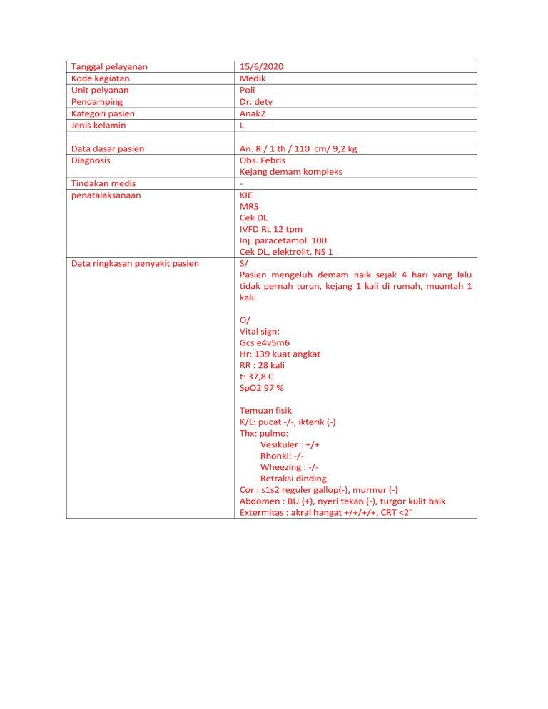 Tanggal pelayanan Kode kegiatan Unit pelyanan Pendamping Kategori pasien Jenis kelamin 15/6/2020 Medik Poli Dr. dety Anak2 L Data dasar pasien Diagnosis An. R / 1 th / 110 cm/ 9,2 kg Obs. Febris Kejang demam kompleks KIE MRS Cek DL IVFD RL 12 tpm Inj. paracetamol 100 Cek DL, elektrolit, NS 1 S/ Pasien mengeluh demam naik sejak 4 hari yang lalu tidak pernah turun, kejang 1 kali di rumah, muantah 1 kali. Tindakan medis penatalaksanaan Data ringkasan penyakit pasien O/ Vital sign: Gcs e4v5m6 Hr: 139 kuat angkat RR : 28 kali t: 37,8 C SpO2 97 % Temuan fisik K/L: pucat -/-, ikterik (-) Thx: pulmo: Vesikuler : +/+ Rhonki: -/Wheezing : -/Retraksi dinding Cor : s1s2 reguler gallop(-), murmur (-) Abdomen : BU (+), nyeri tekan (-), turgor kulit baik Extermitas : akral hangat +/+/+/+, CRT <2” Tanggal pelayanan Kode kegiatan Unit pelyanan Pendamping Kategori pasien Jenis kelamin 18/5/2020 Medik IGD Dr. Putu lansia L Data dasar pasien Diagnosis Tindakan medis penatalaksanaan Tn. H / 82 th / 160 cm/ 70 kg Tumor paru KIE MRS Cek DL, ekg O2 3 lpm Paracetamol 1 gr observasi S/ Pasien mengeluh sesak nafas sejak kemarin, batuk berdarah (+), mual/ muntah (-). Data ringkasan penyakit pasien O/ Vital sign: Gcs e4v5m6 TD : 130/90 mmHg Hr: 92 x/ kuat angkat RR : 28 kali t: 37,1 C SpO2 95 % Temuan fisik K/L: pucat -/-, ikterik (-) Thx: pulmo: Vesikuler : +/+ Rhonki: +/+ Wheezing : -/Retraksi dinding Cor : s1s2 reguler gallop(-), murmur (-) Abdomen : BU (+), nyeri tekan (-), turgor kulit baik Extermitas : akral hangat +/+/+/+, CRT <2” Tanggal pelayanan Kode kegiatan Unit pelyanan Pendamping Kategori pasien Jenis kelamin 18/5/2020 Medik IGD Dr. Putu lansia L Data dasar pasien Diagnosis Tindakan medis penatalaksanaan An. I/ 2 th/ 115 cm/ 14 kg Obs. febris KIE Cek D, NS1 Paracetamol 7,5 ml observasi S/ Pasien mengeluh demam sejak 2 hari, muntah 2x di rumah. Data ringkasan penyakit pasien O/ Vital sign: Gcs e4v5m6 Hr: 140 x/ kuat angkat RR : 30 kali t: 38,5 C SpO2 97 % Temuan fisik K/L: pucat -/-, ikterik (-) Thx: pulmo: Vesikuler : +/+ Rhonki: -/Wheezing : -/Retraksi dinding Cor : s1s2 reguler gallop(-), murmur (-) Abdomen : BU (+), nyeri tekan (-), turgor kulit baik Extermitas : akral hangat +/+/+/+, CRT <2” Tanggal pelayanan Kode kegiatan Unit pelyanan Pendamping Kategori pasien Jenis kelamin 18/5/2020 Medik IGD Dr. Putu dewasa L Data dasar pasien Diagnosis Tn. H / 55 th / 160 cm/ 66 kg Diabetik foot DM tipe 2 KIE MRS Cek DL, GDS, EKG, IVFD NaCl loading ( I ) 500 mg IVFD NaCl loading (II) 500 mg IVFD NaCl loading (III) 500 mg Inj. Ondnsentron 8 mg Inj. paracetamol 1 gr Inj. Omeprzol 40 mg Inj. Ceftriaxone 1 gr Inj. Metronidazole 500 mg S/ Pasien mengeluh nyeri luka post amputatum jari manis kaki kanan, pasien juga mengeluh perut terasa penuhm demam 2 hari yll, mual/muntah (-) Tindakan medis penatalaksanaan Data ringkasan penyakit pasien O/ Vital sign: Gcs e4v5m6 TD : 120/80 mmHg Hr: 74 x/ kuat angkat RR : 20 kali t: 37,1 C SpO2 97 % Temuan fisik K/L: pucat -/-, ikterik (-) Thx: pulmo: Vesikuler : +/+ Rhonki: +/+ Wheezing : -/Retraksi dinding Cor : s1s2 reguler gallop(-), murmur (-) Abdomen : BU (+), nyeri tekan (-), turgor kulit baik Extermitas : akral hangat +/+/+/+, CRT <2” Tanggal pelayanan Kode kegiatan Unit pelyanan Pendamping Kategori pasien Jenis kelamin 18/5/2020 Medik IGD Dr. Putu dewasa L Data dasar pasien Diagnosis Tn. J / 67 th / 161 cm/ 65 kg Hemiparesis sinistra CVA squele KIE MRS Cek DL, GDS, EKG, elektrolit IVFD RL 20 tpm Ranitidin 50 mg iv Ondansentron 8 mg iv Citicolin 500 mg S/ Pasien mengeluh lumpuh tangan dan kaki sebelah kri sejak tadi pagi, ini merupakan serangan kedua, serangan pertama pada tahun 2019 Tindakan medis penatalaksanaan Data ringkasan penyakit pasien O/ Vital sign: Gcs e4v5m6 TD : 180/100 mmHg Hr: 74 x/ kuat angkat RR : 20 kali t: 37,1 C SpO2 97 % Temuan fisik K/L: pucat -/-, ikterik (-), paresis N, III, VII, X, Thx: pulmo: Vesikuler : +/+ Rhonki: +/+ Wheezing : -/Retraksi dinding Cor : s1s2 reguler gallop(-), murmur (-) Abdomen : BU (+), nyeri tekan (-), turgor kulit baik Extermitas : akral hangat +/+/+/+, CRT <2”, motorik 1/1/4/4 Tanggal pelayanan Kode kegiatan Unit pelyanan Pendamping Kategori pasien Jenis kelamin 18/5/2020 Medik IGD Dr. Putu lan L Data dasar pasien Diagnosis Tn. J / 68 th / 163 cm/ 70 kg Hiperglikemia DVT KIE MRS Cek DL, GDS, EKG, elektrolit IVFD NS loading 1000 cc Ranitidin 50 mg iv Ondansentron 8 mg iv Ketorolac 30 mg iv Captopril 25 mg S/ Pasien mengeluh nyeri kaki kiri tiba-tiba sejak tadi pagi, bengkak (+), bintik-bitik merah, sulit digerakkan. Tindakan medis penatalaksanaan Data ringkasan penyakit pasien O/ Vital sign: Gcs e4v5m6 TD : 130/90 mmHg Hr: 107 x/ kuat angkat RR : 20 kali t: 37,1 C SpO2 95 % Temuan fisik K/L: pucat -/-, ikterik (-), Thx: pulmo: Vesikuler : +/+ Rhonki: -/Wheezing : -/Retraksi dinding Cor : s1s2 reguler gallop(-), murmur (-) Abdomen : BU (+), nyeri tekan (-), turgor kulit baik Extermitas : akral hangat +/+/+/+, CRT <2”, kaki kiri : edema, pulsasi (-), pulsasi (+). Tanggal pelayanan Kode kegiatan Unit pelyanan Pendamping Kategori pasien Jenis kelamin 18/5/2020 Medik IGD Dr. Putu dew L Data dasar pasien Diagnosis Ny. J / 36 th / 160 cm/ 60 kg BPPV Epigastric pain KIE Inj. Ondansentron 8 mg iv Inj. Ranitidin 50 mg iv Inj. Dipenhidramin iv Observasi BPL Betahistin tab 2 x 1 S/ Pasien mengeluh pusing berputar sejak 1 minggu yang lalu, muntah (-), mual (+), berdenging (-), nyeri ulu hati (+). Tindakan medis penatalaksanaan Data ringkasan penyakit pasien O/ Vital sign: Gcs e4v5m6 TD : 120/80 mmHg Hr: 100 x/ kuat angkat RR : 22 kali t: 37,1 C SpO2 99 % Temuan fisik K/L: pucat -/-, ikterik (-), nistagmus (-) Thx: pulmo: Vesikuler : +/+ Rhonki: -/Wheezing : -/Retraksi dinding Cor : s1s2 reguler gallop(-), murmur (-) Abdomen : BU (+), nyeri tekan (-), turgor kulit baik Extermitas : akral hangat +/+/+/+, CRT <2”, kaki kiri : edema, pulsasi (-), pulsasi (+). Tanggal pelayanan Kode kegiatan Unit pelyanan Pendamping Kategori pas