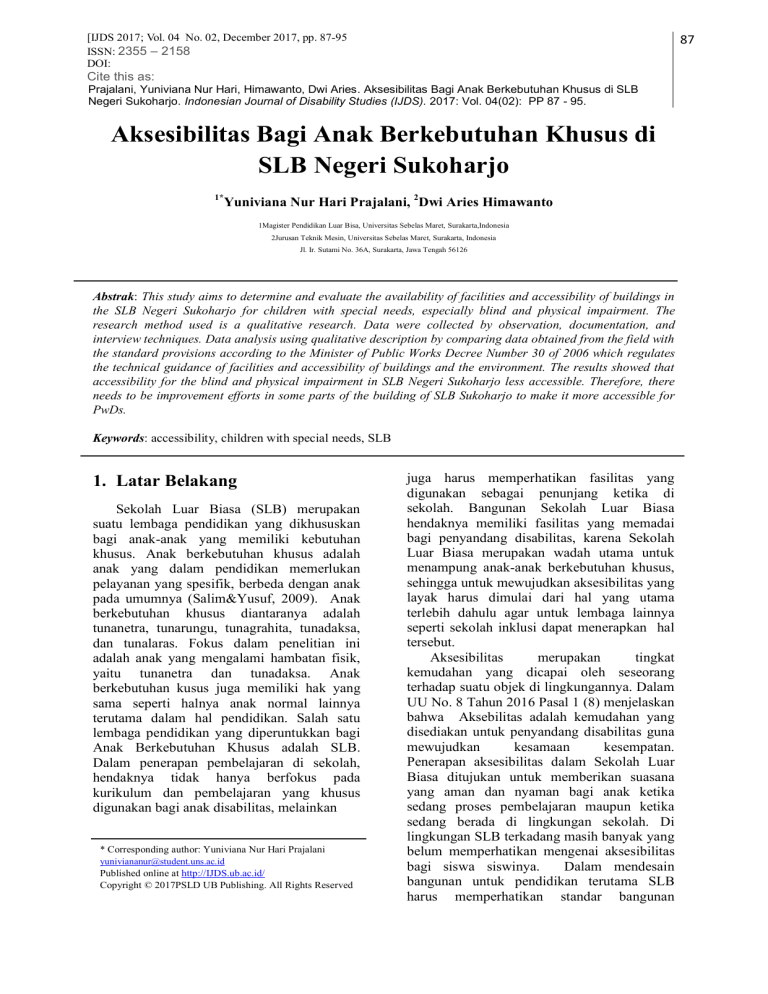 [IJDS 2017; Vol. 04 No. 02, December 2017, pp. 87-95 ISSN: 2355 – 2158 DOI: 87 Cite this as: Prajalani, Yuniviana Nur Hari, Himawanto, Dwi Aries. Aksesibilitas Bagi Anak Berkebutuhan Khusus di SLB Negeri Sukoharjo. Indonesian Journal of Disability Studies (IJDS). 2017: Vol. 04(02): PP 87 - 95. Aksesibilitas Bagi Anak Berkebutuhan Khusus di SLB Negeri Sukoharjo 1* Yuniviana Nur Hari Prajalani, 2Dwi Aries Himawanto 1Magister Pendidikan Luar Bisa, Universitas Sebelas Maret, Surakarta,Indonesia 2Jurusan Teknik Mesin, Universitas Sebelas Maret, Surakarta, Indonesia Jl. Ir. Sutami No. 36A, Surakarta, Jawa Tengah 56126 Abstrak: This study aims to determine and evaluate the availability of facilities and accessibility of buildings in the SLB Negeri Sukoharjo for children with special needs, especially blind and physical impairment. The research method used is a qualitative research. Data were collected by observation, documentation, and interview techniques. Data analysis using qualitative description by comparing data obtained from the field with the standard provisions according to the Minister of Public Works Decree Number 30 of 2006 which regulates the technical guidance of facilities and accessibility of buildings and the environment. The results showed that accessibility for the blind and physical impairment in SLB Negeri Sukoharjo less accessible. Therefore, there needs to be improvement efforts in some parts of the building of SLB Sukoharjo to make it more accessible for PwDs. Keywords: accessibility, children with special needs, SLB 1. Latar Belakang Sekolah Luar Biasa (SLB) merupakan suatu lembaga pendidikan yang dikhususkan bagi anak-anak yang memiliki kebutuhan khusus. Anak berkebutuhan khusus adalah anak yang dalam pendidikan memerlukan pelayanan yang spesifik, berbeda dengan anak pada umumnya (Salim&Yusuf, 2009). Anak berkebutuhan khusus diantaranya adalah tunanetra, tunarungu, tunagrahita, tunadaksa, dan tunalaras. Fokus dalam penelitian ini adalah anak yang mengalami hambatan fisik, yaitu tunanetra dan tunadaksa. Anak berkebutuhan kusus juga memiliki hak yang sama seperti halnya anak normal lainnya terutama dalam hal pendidikan. Salah satu lembaga pendidikan yang diperuntukkan bagi Anak Berkebutuhan Khusus adalah SLB. Dalam penerapan pembelajaran di sekolah, hendaknya tidak hanya berfokus pada kurikulum dan pembelajaran yang khusus digunakan bagi anak disabilitas, melainkan * Corresponding author: Yuniviana Nur Hari Prajalani [email protected] Published online at http://IJDS.ub.ac.id/ Copyright © 2017PSLD UB Publishing. All Rights Reserved juga harus memperhatikan fasilitas yang digunakan sebagai penunjang ketika di sekolah. Bangunan Sekolah Luar Biasa hendaknya memiliki fasilitas yang memadai bagi penyandang disabilitas, karena Sekolah Luar Biasa merupakan wadah utama untuk menampung anak-anak berkebutuhan khusus, sehingga untuk mewujudkan aksesibilitas yang layak harus dimulai dari hal yang utama terlebih dahulu agar untuk lembaga lainnya seperti sekolah inklusi dapat menerapkan hal tersebut. Aksesibilitas merupakan tingkat kemudahan yang dicapai oleh seseorang terhadap suatu objek di lingkungannya. Dalam UU No. 8 Tahun 2016 Pasal 1 (8) menjelaskan bahwa Aksebilitas adalah kemudahan yang disediakan untuk penyandang disabilitas guna mewujudkan kesamaan kesempatan. Penerapan aksesibilitas dalam Sekolah Luar Biasa ditujukan untuk memberikan suasana yang aman dan nyaman bagi anak ketika sedang proses pembelajaran maupun ketika sedang berada di lingkungan sekolah. Di lingkungan SLB terkadang masih banyak yang belum memperhatikan mengenai aksesibilitas bagi siswa siswinya. Dalam mendesain bangunan untuk pendidikan terutama SLB harus memperhatikan standar bangunan IJDS 2017; Vol. 04 No. 02, December 2017 ISSN: 2355 – 2158 DOI: berdasarkan ketntuan standar menurut Permen Nomor 30 Tahun 2006 mengenai Pedoman Teknis Fasilitas dan Aksesibilitas pada Bangunan Gedung dan Lingkungan. Pedoman teknis ini dimaksudkan untuk memberikan acuan bagi kegiatan pembangunan, yang meliputi perencanaan teknis dan pelaksanaan konstruksi serta pemanfaatan bangunan gedung dan lingkungan yang aksesibel bagi semua anak dengan mengutamakan penyandang cacat terutama anak tunadaksa dan tunanetra. Dalam pembangunan harus memperhatikan asas fasilitas dan aksesibilitas yang meliputi, keselamatan, kemudahan, kegunaan, dan kemandirian. Penelitian sebelumnya mengenai aksesibilitas telah banyak dilakukan, namun belum banyak penelitian mengenai bangunan Sekolah Luar Biasa yang mana sekolah tersebut merupakan lingkungan pendidikan utama bagi anak berkebutuhan khusus. Kebanyakan orang berpandangan bahwa Sekolah Luar Biasa sudah menyediakan fasilitas dan aksesibilitas yang sesuai untuk Anak Berkebutuhan Khusus. Namun kenyataannya tidak demikian, hasil penelitian sebelumnya menunjukkan bahwa fasilitas dan aksesibilitas sebagian besar belum memadai. Penelitian yang dilakukan oleh Ulfa dkk (2016) pada bangunan gedung pendidikan menunjukan bahwa aksesibilitas pada gedung tersebut masih kurang aksesibel bagi penyandang tunanetra. Hal tersebut ditunjukkan dengan belum adanya ramp, tanda braille, guiding block, dan tempat parkir yang tertata tidak rapi. Padahal kehadiran aksesibilitas pada fasilitas umum maupun bangunan sangat dibutuhkan bagi penyandang disabilitas. Penelitian yang dilakukan Widi dan Nirwansyah (2013) menyimpulkan bahwa bangunan sekolah utamanya Sekolah Khusus atau Sekolah Luar Biasa sangat perlu mengutamakan aksesibilitas sirkulasi maupun desain dari interior hingga eksteriornya, sehingga pencapaian rasa aman dan nyaman dalam melakukan aktivitas belajar mengajar dapat terlaksana. Panjankar (2016) menyatakan bahwa aksesibilitas sangat penting untuk sekolah. Jika aksesibilitas sekolah tidak tepat, hasilnya mungkin siswa akan putus sekolah. Berdasarkan uraian tersebut, penelitian ini bertujuan untuk mengetahui dan mengevaluasi aksesibiliatas bangunan SLB Negeri Sukoharjo bagi anak-anak berkebutuhan khusus. Sehi