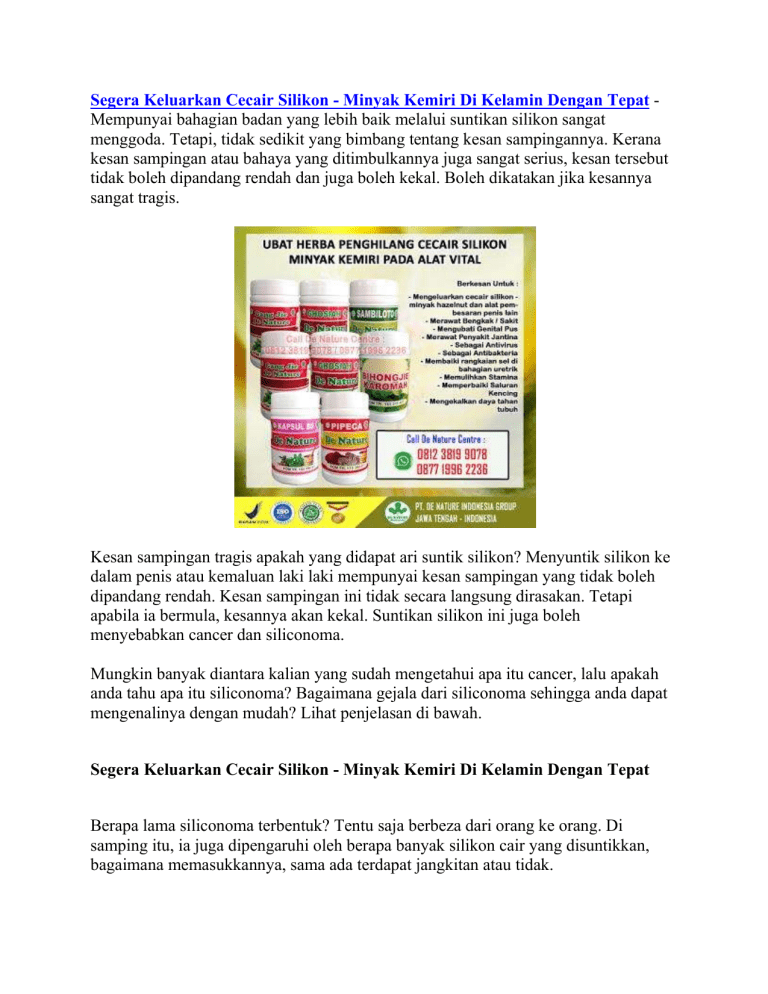Segera Keluarkan Cecair Silikon - Minyak Kemiri Di Kelamin Dengan Tepat Mempunyai bahagian badan yang lebih baik melalui suntikan silikon sangat menggoda. Tetapi, tidak sedikit yang bimbang tentang kesan sampingannya. Kerana kesan sampingan atau bahaya yang ditimbulkannya juga sangat serius, kesan tersebut tidak boleh dipandang rendah dan juga boleh kekal. Boleh dikatakan jika kesannya sangat tragis. Kesan sampingan tragis apakah yang didapat ari suntik silikon? Menyuntik silikon ke dalam penis atau kemaluan laki laki mempunyai kesan sampingan yang tidak boleh dipandang rendah. Kesan sampingan ini tidak secara langsung dirasakan. Tetapi apabila ia bermula, kesannya akan kekal. Suntikan silikon ini juga boleh menyebabkan cancer dan siliconoma. Mungkin banyak diantara kalian yang sudah mengetahui apa itu cancer, lalu apakah anda tahu apa itu siliconoma? Bagaimana gejala dari siliconoma sehingga anda dapat mengenalinya dengan mudah? Lihat penjelasan di bawah. Segera Keluarkan Cecair Silikon - Minyak Kemiri Di Kelamin Dengan Tepat Berapa lama siliconoma terbentuk? Tentu saja berbeza dari orang ke orang. Di samping itu, ia juga dipengaruhi oleh berapa banyak silikon cair yang disuntikkan, bagaimana memasukkannya, sama ada terdapat jangkitan atau tidak. Pada mulanya, suntikan silikon menjadikan bahagian tubuh tertentu kelihatan cantik dan menarik: hidung tajam, bentuk bibir, pipi dan dagu yang cantik, payudara seksi, zakar yang lebih besar dan lebih keras. Lama kelamaan akan ada benjolan/gumpalan keras. Ini adalah siliconoma, tumor yang disebabkan oleh suntikan cecair, dalam hal ini silikon. Silikon cair dianggap sebagai benda asing, jadi badan menahannya dan membentuk mekanisme pertahanan. Keradangan berkembang. Gejala yang muncul bervariasi dari tahap paling ringan dalam bentuk gatal dan kemerahan dan tentunya perubahan bentuk kulit menjadi lebih sukar, hingga pembentukan nodul atau benjolan pada kulit dan granuloma, hingga yang paling parah boleh terjadi keradangan teruk, kematian rangkaian kulit (nekrosis) dan bisul (luka yang sukar disembuhkan). Membaiki tisu yang rosak kerana silikon cair sangat sukar. Mungkin silikon tidak dapat dibersihkan sepenuhnya. Selebihnya boleh kembali menjadi radang di kemudian hari. Tidak ketinggalan, kesakitan akibat keradangan dan tekanan kerana terpaksa beroperasi berkali-kali. Sementara itu, sukar untuk kembali seperti sebelumnya. Segera Keluarkan Cecair Silikon - Minyak Kemiri Di Kelamin Dengan Tepat Selain menggunakan cairan silikon, ramai juga yang menyuntikan minyak kemiri/hazelnut, minyak aring/minyak rambut, minyak goreng dan cairan lainnya yang mereka percaya dapat memperbesar ukuran penis atau kelamin laki laki. Apakah ini boleh dilakukan? Tentu tidak, menyuntikan benda asing seperti cairan silikon, minyak kemiri, minyak urang aring, minyak goreng, minyak kasuari, minyak lintah, minyak bulus dan cairan lainnya yang tidak seharusnya bisa menimbulkan kerosakan yang sangat serius. Beberapa akibat atau kesan sampingan yang didapat dari menyuntik silikon atau menyuntikkan cecair lain ke dalam penis adalah seperti berikut: Penis membengkak dan meradang. Mengecutkan penis. Boleh menyebabkan cancer. Kecederaan maut pada penis. Sakit ketika ereksi maksimum. Bentuk penis akan berbeza dengan bentuk umum. Walaupun kelihatan besar, penis sukar didirikan. Penis menjadi kaku dan mengeras. Penis menjadi lebih pendek dalam jangka masa tertentu. Kejadian jangkitan pada penis. Kesakitan dan ketidakselesaan semasa persetubuhan. Kesakitan yang tidak tertahankan berkembang di penis. penis terasa panas, sakit dan sangat sakit ketika disentuh. penis akan mengalami jangkitan yang teruk dan bahkan mengeluarkan nanah. Berdarah. Penurunan keinginan seksual, mati pucuk dan kerentanan terhadap penyakit lain. Menyebabkan pergantungan pada suntikan. Struktur saraf di penis rosak. Jika sudah seperti ini apa bisa keadaan ini disembuhkan? Bagaimana caranya? Apakah harus dengan operasi atau bisa dengan cara alami? Keadaan ini masih dapat disembuhkan melalui proses pembedahan dan juga boleh menggunakan rawatan alternatif seperti ubat alami. Kaedah alami dipercayai digunakan sebagai langkah rawatan yang sesuai dan selamat. Kaedah alami boleh dilakukan dengan membuat ramuan anda sendiri atau dengan ubat alami atau ubat herba. Sekiranya anda ingin memilih untuk menggunakan ubat herba, pastikan ubat tersebut telah diuji secara klinikal dan mempunyai lesen pengedaran dan secara rasmi memiliki izin atau sijil BPOM. Di samping itu, pastikan produk itu halal dengan mempunyai label HALAL MUI. Lebih baik jika produk tersebut sudah mempunyai sijil ISO (9001: 2015). Jika sudah memiliki kriteria tersebut maka anda bisa menggunakannya dengan tenang, aman tanpa risau akan kesan sampingan. Kerana ubat herba tersebut dijamin aman tanpa kesan sampingan. Ubat Penghilang Silikon - Cecair Silikon - Minyak Kemiri - Minyak Urang Aring - Minyak Rambut Dan Cecair Lainnya Secara Alami Ampuh Paling Berkesan Untuk maklumat lebih lanjut mengenai Produk dan Harga, Cara Memesan / Konsultasi atau perkara lain, anda boleh menghubungi kami melalui Telefon / WhatsApp / SMS (24 jam online/Fast Respone) pada number yang tertera dalam gambar ubat di atas. Segera Keluarkan Cecair Silikon - Minyak Kemiri Di Kelamin Dengan Tepat Penelusuran yang terkait dengan Segera Keluarkan Cecair Silikon - Minyak Kemiri Di Kelamin Dengan Tepat : cara menghilangkan silikon minyak kemiri, obat herbal sebagai obat kelamin akibat suntik minyak kemiri, cara alami menghilangkan suntikan minyak kemiri, operasi pengangkatan minyak kemiri, cara menghilangkan suntik silikon secara alami, cara menghilangkan suntikan minyak urang aring, cara menghilangkan suntik silikon di wajah, biaya sedot silikon