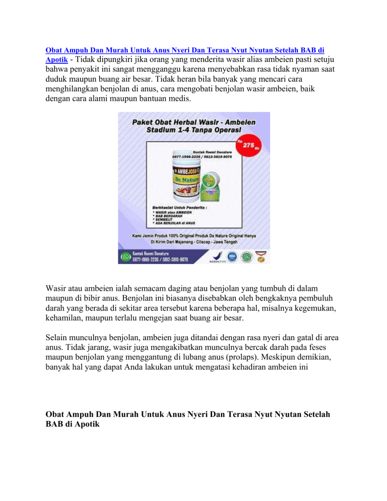 Obat Ampuh Dan Murah Untuk Anus Nyeri Dan Terasa Nyut Nyutan Setelah BAB di Apotik - Tidak dipungkiri jika orang yang menderita wasir alias ambeien pasti setuju bahwa penyakit ini sangat mengganggu karena menyebabkan rasa tidak nyaman saat duduk maupun buang air besar. Tidak heran bila banyak yang mencari cara menghilangkan benjolan di anus, cara mengobati benjolan wasir ambeien, baik dengan cara alami maupun bantuan medis. Wasir atau ambeien ialah semacam daging atau benjolan yang tumbuh di dalam maupun di bibir anus. Benjolan ini biasanya disebabkan oleh bengkaknya pembuluh darah yang berada di sekitar area tersebut karena beberapa hal, misalnya kegemukan, kehamilan, maupun terlalu mengejan saat buang air besar. Selain munculnya benjolan, ambeien juga ditandai dengan rasa nyeri dan gatal di area anus. Tidak jarang, wasir juga mengakibatkan munculnya bercak darah pada feses maupun benjolan yang menggantung di lubang anus (prolaps). Meskipun demikian, banyak hal yang dapat Anda lakukan untuk mengatasi kehadiran ambeien ini Obat Ampuh Dan Murah Untuk Anus Nyeri Dan Terasa Nyut Nyutan Setelah BAB di Apotik Secara umum, ambeien terbagi menjadi 2 jenis, yaitu ambeien dalam dan ambeien luar. Perbedaan yang utama dari kedua jenis ambeien tersebut adalah letak terbentuknya ambeien. Apa saja ciri-cirinya? Mari simak ulasan berikut. JENIS AMBEIEN DAN CIRI CIRINYA Ambeien terjadi ketika pembuluh darah di usus besar bagian akhir (rektum) dan dubur atau anus membengkak. Berdasarkan lokasi dan gejala yang ditimbulkan, ambeien terbagi menjadi 2 jenis, yaitu: Ambeien dalam (internal hemorrhoid) Disebut demikian karena pembengkakan yang terjadi berada di dalam anus, tepatnya di liang rektum. Ambeien internal jauh di dalam rektum dan tidak terlihat dari luar. Umumnya, ambeien dalam tidak menimbulkan keluhan sakit karena di liang rektum tidak banyak terdapat saraf. Seringkali, tanda pertama bahwa wasir internal hadir adalah pendarahan dubur. Gejala ambeien dalam yang lain adalah gatal dan nyeri pada anus. Gejala ini biasanya baru muncul ketika ambeien dalam menjadi semakin besar. Mengejan kadang-kadang dapat mendorong wasir internal sehingga menjorok melalui anus. Ini disebut ambeien yang menonjol atau prolaps dan bisa terasa sakit. Ambeien luar (external hemorrhoid) Pada jenis ambeien ini, lokasi pembengkakannya berada di luar rektum atau lebih tepatnya di sekitar lubang anus. Orang yang mengalami ambeien luar dapat mengeluhkan beberapa gejala, seperti: Rasa perih dan panas di sekitar anus. Gatal pada anus. Adanya benjolan atau pembengkakan di sekitar anus. BAB berdarah. Dari gejalanya, ambeien luar terasa lebih nyeri dan sering kali membuat penderitanya merasa tidak nyaman. Hal ini karena pembuluh darah yang mengalami pembengkakan berada di bawah kulit sekitar anus, di mana ada lebih banyak saraf di area tersebut. Obat Ampuh Dan Murah Untuk Anus Nyeri Dan Terasa Nyut Nyutan Setelah BAB di Apotik CIRI CIRI AMBEIEN ATAU WASIR SECARA UMUM Secara umum, ciri-ciri yang sering dialami penderita adalah perdarahan saat sedang buang air besar. Perdarahan ini bisa berupa bercak darah pada feses atau tetesan darah yang mengalir dari dubur. Selain itu, ada beberapa ciri lain yang bisa dideteksi, di antaranya: 1. Rasa Mengganjal Saat Buang Air Besar Sering kali kita merasa ada sesuatu yang membuat proses buang air besar tertahan. Akibatnya kita akan mengejan dan berusaha mengeluarkan feses dari dubur. Dalam beberapa kasus, mengejan justru akan membuat pembuluh vena pecah dan menimbulkan benjolan (ambeien). Namun, apabila sejak awal penyebab BAB tertahan adalah benjolan tersebut, maka proses mengejan justru akan memperparah ambeien atau wasir yang sudah dimiliki. Jika dibiarkan lama kelamaan akan timbul perdarahan. 2. Rasa Tidak Nyaman pada Anus Selain perdarahan dan gatal, penderita ambeien atau wasir biasanya akan memiliki benjolan di lubang anus. Nah, benjolan inilah yang sering kali menimbulkan rasa tidak nyaman. Ketika merasa tidak nyaman, penderita akan mengalami kesulitan saat harus duduk atau jongkok dalam waktu yang lama. 3. Prolaps Prolaps merupakan keluarnya bagian ambeien atau wasir dari lubang anus. Muncul benjolan keluar dari anus setelah buang air besar. Benjolan dapat masuk sendiri atau harus didorong terlebih dahulu. Jadi, jika saat meraba bagian dubur, Anda mendapati daging yang menonjol berwarna merah muda (lebih terang) dari area sekitarnya dan terasa perih atau bahkan mengeluarkan darah, bisa dipastikan Anda menderita penyakit ambeien atau wasir. 4. Anemia Skunder Wajah pucat, tubuh mudah lemas dan sulit berkonsensentrasi. Gejala ini biasanya muncul bila telah terjadi komplikasi anemia akibat perdarahan yang berlebihan. Perdarahan pada dubur akibat ambeien tentu saja akan membuat penderita mengalami kukurangan darah. Hal ini sering kali menjadi pemicu penyakit lain, salah satunya anemia sekunder. Apabila hal ini yang Anda alami, bisa saja penyebabnya adalah ambeien atau wasir. 5. Infeksi di Daerah Dubur Luka pada ambeien akibat perdarahan akan membuat kuman mudah masuk ke dalam tubuh, hal ini akan menimbulkan infeksi. Jika anus terasa sakit dan perih setiap buang air besar, bisa jadi Anda memiliki ambeien atau wasir. Tingkatan Stadium Wasir Atau sakit Ambeien Wasir stadium 1 : Wasir jenis ini biasanya tidak sampai prolaps. Rasanya hanya kurang nyaman saat BAB. Ambeien stadium 2 : Bagian anus sudah bisa diraba ada benjolan, namun biasanya benjolan bisa masuk dengan sendirinya dan kadang ada rasa panas serta gatal. Wasir stadium 3 : Benjolan pada anus sudah besar dan susah masuk lagi harus dibantu dengan jari. Ambeien stadium 4 : Benjolan wasie sudah besar sekali dan sulit untuk dimasukan lagi meskipun dengan bantuan tangan, selain itu juga menjadi sering pendarahan. Cara menghilangkan benjolan ambeien dengan bantuan medis Dokter akan memprioritaskan penanganan tanpa operasi, namun bila wasir Anda sudah sangat parah atau amat mengganggu, bukan tidak mungkin Anda akan diminta menjalani prosedur pembe