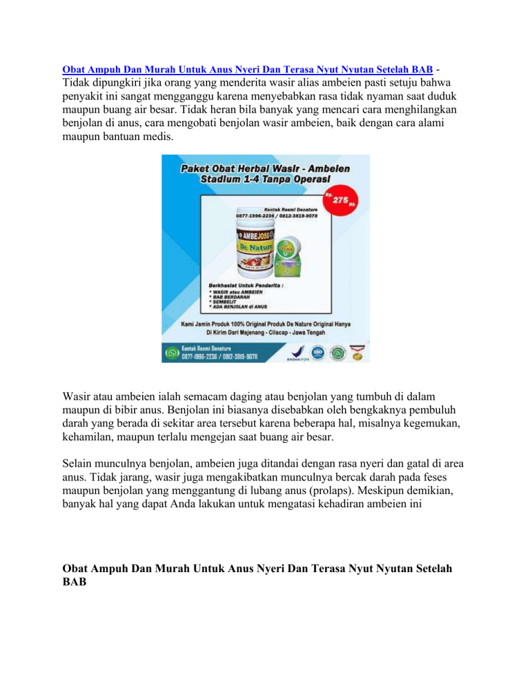 Obat Ampuh Dan Murah Untuk Anus Nyeri Dan Terasa Nyut Nyutan Setelah BAB - Tidak dipungkiri jika orang yang menderita wasir alias ambeien pasti setuju bahwa penyakit ini sangat mengganggu karena menyebabkan rasa tidak nyaman saat duduk maupun buang air besar. Tidak heran bila banyak yang mencari cara menghilangkan benjolan di anus, cara mengobati benjolan wasir ambeien, baik dengan cara alami maupun bantuan medis. Wasir atau ambeien ialah semacam daging atau benjolan yang tumbuh di dalam maupun di bibir anus. Benjolan ini biasanya disebabkan oleh bengkaknya pembuluh darah yang berada di sekitar area tersebut karena beberapa hal, misalnya kegemukan, kehamilan, maupun terlalu mengejan saat buang air besar. Selain munculnya benjolan, ambeien juga ditandai dengan rasa nyeri dan gatal di area anus. Tidak jarang, wasir juga mengakibatkan munculnya bercak darah pada feses maupun benjolan yang menggantung di lubang anus (prolaps). Meskipun demikian, banyak hal yang dapat Anda lakukan untuk mengatasi kehadiran ambeien ini Obat Ampuh Dan Murah Untuk Anus Nyeri Dan Terasa Nyut Nyutan Setelah BAB Secara umum, ambeien terbagi menjadi 2 jenis, yaitu ambeien dalam dan ambeien luar. Perbedaan yang utama dari kedua jenis ambeien tersebut adalah letak terbentuknya ambeien. Apa saja ciri-cirinya? Mari simak ulasan berikut. JENIS AMBEIEN DAN CIRI CIRINYA Ambeien terjadi ketika pembuluh darah di usus besar bagian akhir (rektum) dan dubur atau anus membengkak. Berdasarkan lokasi dan gejala yang ditimbulkan, ambeien terbagi menjadi 2 jenis, yaitu: Ambeien dalam (internal hemorrhoid) Disebut demikian karena pembengkakan yang terjadi berada di dalam anus, tepatnya di liang rektum. Ambeien internal jauh di dalam rektum dan tidak terlihat dari luar. Umumnya, ambeien dalam tidak menimbulkan keluhan sakit karena di liang rektum tidak banyak terdapat saraf. Seringkali, tanda pertama bahwa wasir internal hadir adalah pendarahan dubur. Gejala ambeien dalam yang lain adalah gatal dan nyeri pada anus. Gejala ini biasanya baru muncul ketika ambeien dalam menjadi semakin besar. Mengejan kadang-kadang dapat mendorong wasir internal sehingga menjorok melalui anus. Ini disebut ambeien yang menonjol atau prolaps dan bisa terasa sakit. Ambeien luar (external hemorrhoid) Pada jenis ambeien ini, lokasi pembengkakannya berada di luar rektum atau lebih tepatnya di sekitar lubang anus. Orang yang mengalami ambeien luar dapat mengeluhkan beberapa gejala, seperti: Rasa perih dan panas di sekitar anus. Gatal pada anus. Adanya benjolan atau pembengkakan di sekitar anus. BAB berdarah. Dari gejalanya, ambeien luar terasa lebih nyeri dan sering kali membuat penderitanya merasa tidak nyaman. Hal ini karena pembuluh darah yang mengalami pembengkakan berada di bawah kulit sekitar anus, di mana ada lebih banyak saraf di area tersebut. Obat Ampuh Dan Murah Untuk Anus Nyeri Dan Terasa Nyut Nyutan Setelah BAB CIRI CIRI AMBEIEN ATAU WASIR SECARA UMUM Secara umum, ciri-ciri yang sering dialami penderita adalah perdarahan saat sedang buang air besar. Perdarahan ini bisa berupa bercak darah pada feses atau tetesan darah yang mengalir dari dubur. Selain itu, ada beberapa ciri lain yang bisa dideteksi, di antaranya: 1. Rasa Mengganjal Saat Buang Air Besar Sering kali kita merasa ada sesuatu yang membuat proses buang air besar tertahan. Akibatnya kita akan mengejan dan berusaha mengeluarkan feses dari dubur. Dalam beberapa kasus, mengejan justru akan membuat pembuluh vena pecah dan menimbulkan benjolan (ambeien). Namun, apabila sejak awal penyebab BAB tertahan adalah benjolan tersebut, maka proses mengejan justru akan memperparah ambeien atau wasir yang sudah dimiliki. Jika dibiarkan lama kelamaan akan timbul perdarahan. 2. Rasa Tidak Nyaman pada Anus Selain perdarahan dan gatal, penderita ambeien atau wasir biasanya akan memiliki benjolan di lubang anus. Nah, benjolan inilah yang sering kali menimbulkan rasa tidak nyaman. Ketika merasa tidak nyaman, penderita akan mengalami kesulitan saat harus duduk atau jongkok dalam waktu yang lama. 3. Prolaps Prolaps merupakan keluarnya bagian ambeien atau wasir dari lubang anus. Muncul benjolan keluar dari anus setelah buang air besar. Benjolan dapat masuk sendiri atau harus didorong terlebih dahulu. Jadi, jika saat meraba bagian dubur, Anda mendapati daging yang menonjol berwarna merah muda (lebih terang) dari area sekitarnya dan terasa perih atau bahkan mengeluarkan darah, bisa dipastikan Anda menderita penyakit ambeien atau wasir. 4. Anemia Skunder Wajah pucat, tubuh mudah lemas dan sulit berkonsensentrasi. Gejala ini biasanya muncul bila telah terjadi komplikasi anemia akibat perdarahan yang berlebihan. Perdarahan pada dubur akibat ambeien tentu saja akan membuat penderita mengalami kukurangan darah. Hal ini sering kali menjadi pemicu penyakit lain, salah satunya anemia sekunder. Apabila hal ini yang Anda alami, bisa saja penyebabnya adalah ambeien atau wasir. 5. Infeksi di Daerah Dubur Luka pada ambeien akibat perdarahan akan membuat kuman mudah masuk ke dalam tubuh, hal ini akan menimbulkan infeksi. Jika anus terasa sakit dan perih setiap buang air besar, bisa jadi Anda memiliki ambeien atau wasir. Tingkatan Stadium Wasir Atau sakit Ambeien Wasir stadium 1 : Wasir jenis ini biasanya tidak sampai prolaps. Rasanya hanya kurang nyaman saat BAB. Ambeien stadium 2 : Bagian anus sudah bisa diraba ada benjolan, namun biasanya benjolan bisa masuk dengan sendirinya dan kadang ada rasa panas serta gatal. Wasir stadium 3 : Benjolan pada anus sudah besar dan susah masuk lagi harus dibantu dengan jari. Ambeien stadium 4 : Benjolan wasie sudah besar sekali dan sulit untuk dimasukan lagi meskipun dengan bantuan tangan, selain itu juga menjadi sering pendarahan. Cara menghilangkan benjolan ambeien dengan bantuan medis Dokter akan memprioritaskan penanganan tanpa operasi, namun bila wasir Anda sudah sangat parah atau amat mengganggu, bukan tidak mungkin Anda akan diminta menjalani prosedur pembedahan. Cara menghilangkan benj