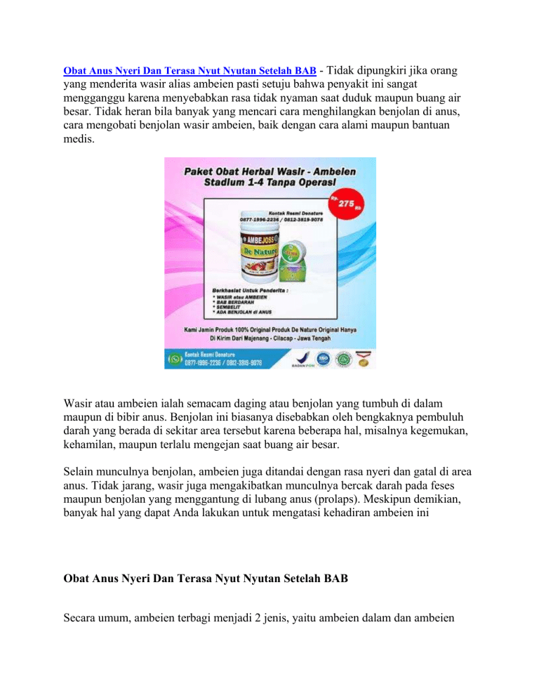 Obat Anus Nyeri Dan Terasa Nyut Nyutan Setelah BAB - Tidak dipungkiri jika orang yang menderita wasir alias ambeien pasti setuju bahwa penyakit ini sangat mengganggu karena menyebabkan rasa tidak nyaman saat duduk maupun buang air besar. Tidak heran bila banyak yang mencari cara menghilangkan benjolan di anus, cara mengobati benjolan wasir ambeien, baik dengan cara alami maupun bantuan medis. Wasir atau ambeien ialah semacam daging atau benjolan yang tumbuh di dalam maupun di bibir anus. Benjolan ini biasanya disebabkan oleh bengkaknya pembuluh darah yang berada di sekitar area tersebut karena beberapa hal, misalnya kegemukan, kehamilan, maupun terlalu mengejan saat buang air besar. Selain munculnya benjolan, ambeien juga ditandai dengan rasa nyeri dan gatal di area anus. Tidak jarang, wasir juga mengakibatkan munculnya bercak darah pada feses maupun benjolan yang menggantung di lubang anus (prolaps). Meskipun demikian, banyak hal yang dapat Anda lakukan untuk mengatasi kehadiran ambeien ini Obat Anus Nyeri Dan Terasa Nyut Nyutan Setelah BAB Secara umum, ambeien terbagi menjadi 2 jenis, yaitu ambeien dalam dan ambeien luar. Perbedaan yang utama dari kedua jenis ambeien tersebut adalah letak terbentuknya ambeien. Apa saja ciri-cirinya? Mari simak ulasan berikut. JENIS AMBEIEN DAN CIRI CIRINYA Ambeien terjadi ketika pembuluh darah di usus besar bagian akhir (rektum) dan dubur atau anus membengkak. Berdasarkan lokasi dan gejala yang ditimbulkan, ambeien terbagi menjadi 2 jenis, yaitu: Ambeien dalam (internal hemorrhoid) Disebut demikian karena pembengkakan yang terjadi berada di dalam anus, tepatnya di liang rektum. Ambeien internal jauh di dalam rektum dan tidak terlihat dari luar. Umumnya, ambeien dalam tidak menimbulkan keluhan sakit karena di liang rektum tidak banyak terdapat saraf. Seringkali, tanda pertama bahwa wasir internal hadir adalah pendarahan dubur. Gejala ambeien dalam yang lain adalah gatal dan nyeri pada anus. Gejala ini biasanya baru muncul ketika ambeien dalam menjadi semakin besar. Mengejan kadang-kadang dapat mendorong wasir internal sehingga menjorok melalui anus. Ini disebut ambeien yang menonjol atau prolaps dan bisa terasa sakit. Ambeien luar (external hemorrhoid) Pada jenis ambeien ini, lokasi pembengkakannya berada di luar rektum atau lebih tepatnya di sekitar lubang anus. Orang yang mengalami ambeien luar dapat mengeluhkan beberapa gejala, seperti: Rasa perih dan panas di sekitar anus. Gatal pada anus. Adanya benjolan atau pembengkakan di sekitar anus. BAB berdarah. Dari gejalanya, ambeien luar terasa lebih nyeri dan sering kali membuat penderitanya merasa tidak nyaman. Hal ini karena pembuluh darah yang mengalami pembengkakan berada di bawah kulit sekitar anus, di mana ada lebih banyak saraf di area tersebut. Obat Anus Nyeri Dan Terasa Nyut Nyutan Setelah BAB CIRI CIRI AMBEIEN ATAU WASIR SECARA UMUM Secara umum, ciri-ciri yang sering dialami penderita adalah perdarahan saat sedang buang air besar. Perdarahan ini bisa berupa bercak darah pada feses atau tetesan darah yang mengalir dari dubur. Selain itu, ada beberapa ciri lain yang bisa dideteksi, di antaranya: 1. Rasa Mengganjal Saat Buang Air Besar Sering kali kita merasa ada sesuatu yang membuat proses buang air besar tertahan. Akibatnya kita akan mengejan dan berusaha mengeluarkan feses dari dubur. Dalam beberapa kasus, mengejan justru akan membuat pembuluh vena pecah dan menimbulkan benjolan (ambeien). Namun, apabila sejak awal penyebab BAB tertahan adalah benjolan tersebut, maka proses mengejan justru akan memperparah ambeien atau wasir yang sudah dimiliki. Jika dibiarkan lama kelamaan akan timbul perdarahan. 2. Rasa Tidak Nyaman pada Anus Selain perdarahan dan gatal, penderita ambeien atau wasir biasanya akan memiliki benjolan di lubang anus. Nah, benjolan inilah yang sering kali menimbulkan rasa tidak nyaman. Ketika merasa tidak nyaman, penderita akan mengalami kesulitan saat harus duduk atau jongkok dalam waktu yang lama. 3. Prolaps Prolaps merupakan keluarnya bagian ambeien atau wasir dari lubang anus. Muncul benjolan keluar dari anus setelah buang air besar. Benjolan dapat masuk sendiri atau harus didorong terlebih dahulu. Jadi, jika saat meraba bagian dubur, Anda mendapati daging yang menonjol berwarna merah muda (lebih terang) dari area sekitarnya dan terasa perih atau bahkan mengeluarkan darah, bisa dipastikan Anda menderita penyakit ambeien atau wasir. 4. Anemia Skunder Wajah pucat, tubuh mudah lemas dan sulit berkonsensentrasi. Gejala ini biasanya muncul bila telah terjadi komplikasi anemia akibat perdarahan yang berlebihan. Perdarahan pada dubur akibat ambeien tentu saja akan membuat penderita mengalami kukurangan darah. Hal ini sering kali menjadi pemicu penyakit lain, salah satunya anemia sekunder. Apabila hal ini yang Anda alami, bisa saja penyebabnya adalah ambeien atau wasir. 5. Infeksi di Daerah Dubur Luka pada ambeien akibat perdarahan akan membuat kuman mudah masuk ke dalam tubuh, hal ini akan menimbulkan infeksi. Jika anus terasa sakit dan perih setiap buang air besar, bisa jadi Anda memiliki ambeien atau wasir. Tingkatan Stadium Wasir Atau sakit Ambeien Wasir stadium 1 : Wasir jenis ini biasanya tidak sampai prolaps. Rasanya hanya kurang nyaman saat BAB. Ambeien stadium 2 : Bagian anus sudah bisa diraba ada benjolan, namun biasanya benjolan bisa masuk dengan sendirinya dan kadang ada rasa panas serta gatal. Wasir stadium 3 : Benjolan pada anus sudah besar dan susah masuk lagi harus dibantu dengan jari. Ambeien stadium 4 : Benjolan wasie sudah besar sekali dan sulit untuk dimasukan lagi meskipun dengan bantuan tangan, selain itu juga menjadi sering pendarahan. Cara menghilangkan benjolan ambeien dengan bantuan medis Dokter akan memprioritaskan penanganan tanpa operasi, namun bila wasir Anda sudah sangat parah atau amat mengganggu, bukan tidak mungkin Anda akan diminta menjalani prosedur pembedahan. Cara menghilangkan benjolan ambeien tanpa operasi adalah: Rubber band litigation, yakni d