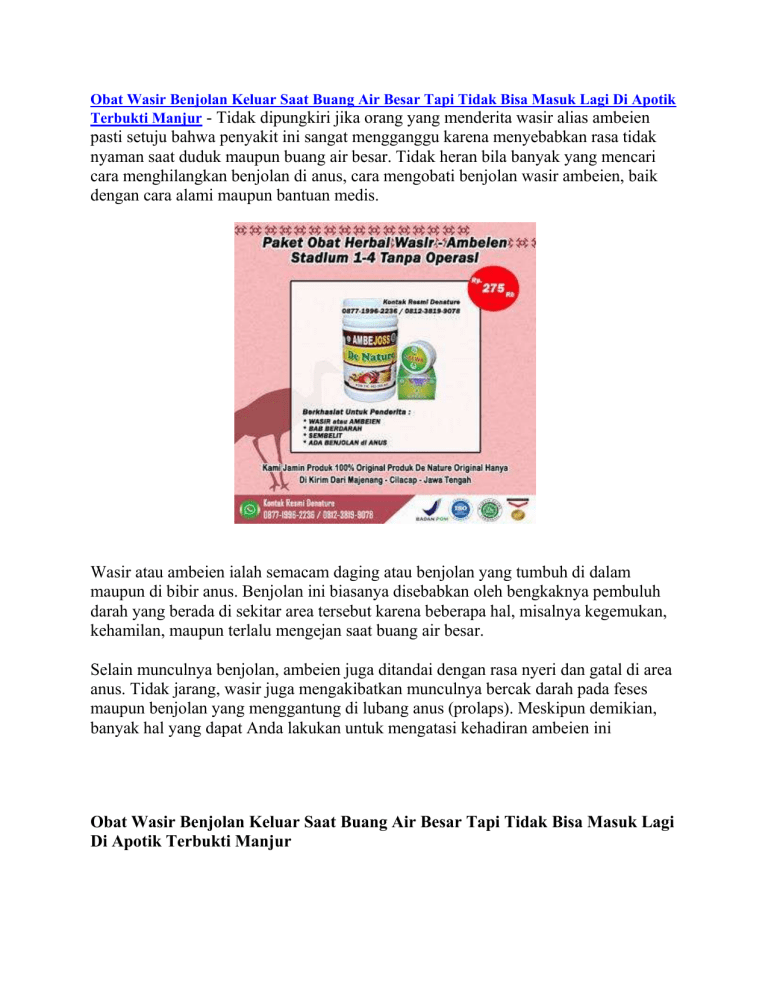 Obat Wasir Benjolan Keluar Saat Buang Air Besar Tapi Tidak Bisa Masuk Lagi Di Apotik Terbukti Manjur - Tidak dipungkiri jika orang yang menderita wasir alias ambeien pasti setuju bahwa penyakit ini sangat mengganggu karena menyebabkan rasa tidak nyaman saat duduk maupun buang air besar. Tidak heran bila banyak yang mencari cara menghilangkan benjolan di anus, cara mengobati benjolan wasir ambeien, baik dengan cara alami maupun bantuan medis. Wasir atau ambeien ialah semacam daging atau benjolan yang tumbuh di dalam maupun di bibir anus. Benjolan ini biasanya disebabkan oleh bengkaknya pembuluh darah yang berada di sekitar area tersebut karena beberapa hal, misalnya kegemukan, kehamilan, maupun terlalu mengejan saat buang air besar. Selain munculnya benjolan, ambeien juga ditandai dengan rasa nyeri dan gatal di area anus. Tidak jarang, wasir juga mengakibatkan munculnya bercak darah pada feses maupun benjolan yang menggantung di lubang anus (prolaps). Meskipun demikian, banyak hal yang dapat Anda lakukan untuk mengatasi kehadiran ambeien ini Obat Wasir Benjolan Keluar Saat Buang Air Besar Tapi Tidak Bisa Masuk Lagi Di Apotik Terbukti Manjur Secara umum, ambeien terbagi menjadi 2 jenis, yaitu ambeien dalam dan ambeien luar. Perbedaan yang utama dari kedua jenis ambeien tersebut adalah letak terbentuknya ambeien. Apa saja ciri-cirinya? Mari simak ulasan berikut. JENIS AMBEIEN DAN CIRI CIRINYA Ambeien terjadi ketika pembuluh darah di usus besar bagian akhir (rektum) dan dubur atau anus membengkak. Berdasarkan lokasi dan gejala yang ditimbulkan, ambeien terbagi menjadi 2 jenis, yaitu: Ambeien dalam (internal hemorrhoid) Disebut demikian karena pembengkakan yang terjadi berada di dalam anus, tepatnya di liang rektum. Ambeien internal jauh di dalam rektum dan tidak terlihat dari luar. Umumnya, ambeien dalam tidak menimbulkan keluhan sakit karena di liang rektum tidak banyak terdapat saraf. Seringkali, tanda pertama bahwa wasir internal hadir adalah pendarahan dubur. Gejala ambeien dalam yang lain adalah gatal dan nyeri pada anus. Gejala ini biasanya baru muncul ketika ambeien dalam menjadi semakin besar. Mengejan kadang-kadang dapat mendorong wasir internal sehingga menjorok melalui anus. Ini disebut ambeien yang menonjol atau prolaps dan bisa terasa sakit. Ambeien luar (external hemorrhoid) Pada jenis ambeien ini, lokasi pembengkakannya berada di luar rektum atau lebih tepatnya di sekitar lubang anus. Orang yang mengalami ambeien luar dapat mengeluhkan beberapa gejala, seperti: Rasa perih dan panas di sekitar anus. Gatal pada anus. Adanya benjolan atau pembengkakan di sekitar anus. BAB berdarah. Dari gejalanya, ambeien luar terasa lebih nyeri dan sering kali membuat penderitanya merasa tidak nyaman. Hal ini karena pembuluh darah yang mengalami pembengkakan berada di bawah kulit sekitar anus, di mana ada lebih banyak saraf di area tersebut. Obat Wasir Benjolan Keluar Saat Buang Air Besar Tapi Tidak Bisa Masuk Lagi Di Apotik Terbukti Manjur CIRI CIRI AMBEIEN ATAU WASIR SECARA UMUM Secara umum, ciri-ciri yang sering dialami penderita adalah perdarahan saat sedang buang air besar. Perdarahan ini bisa berupa bercak darah pada feses atau tetesan darah yang mengalir dari dubur. Selain itu, ada beberapa ciri lain yang bisa dideteksi, di antaranya: 1. Rasa Mengganjal Saat Buang Air Besar Sering kali kita merasa ada sesuatu yang membuat proses buang air besar tertahan. Akibatnya kita akan mengejan dan berusaha mengeluarkan feses dari dubur. Dalam beberapa kasus, mengejan justru akan membuat pembuluh vena pecah dan menimbulkan benjolan (ambeien). Namun, apabila sejak awal penyebab BAB tertahan adalah benjolan tersebut, maka proses mengejan justru akan memperparah ambeien atau wasir yang sudah dimiliki. Jika dibiarkan lama kelamaan akan timbul perdarahan. 2. Rasa Tidak Nyaman pada Anus Selain perdarahan dan gatal, penderita ambeien atau wasir biasanya akan memiliki benjolan di lubang anus. Nah, benjolan inilah yang sering kali menimbulkan rasa tidak nyaman. Ketika merasa tidak nyaman, penderita akan mengalami kesulitan saat harus duduk atau jongkok dalam waktu yang lama. 3. Prolaps Prolaps merupakan keluarnya bagian ambeien atau wasir dari lubang anus. Muncul benjolan keluar dari anus setelah buang air besar. Benjolan dapat masuk sendiri atau harus didorong terlebih dahulu. Jadi, jika saat meraba bagian dubur, Anda mendapati daging yang menonjol berwarna merah muda (lebih terang) dari area sekitarnya dan terasa perih atau bahkan mengeluarkan darah, bisa dipastikan Anda menderita penyakit ambeien atau wasir. 4. Anemia Skunder Wajah pucat, tubuh mudah lemas dan sulit berkonsensentrasi. Gejala ini biasanya muncul bila telah terjadi komplikasi anemia akibat perdarahan yang berlebihan. Perdarahan pada dubur akibat ambeien tentu saja akan membuat penderita mengalami kukurangan darah. Hal ini sering kali menjadi pemicu penyakit lain, salah satunya anemia sekunder. Apabila hal ini yang Anda alami, bisa saja penyebabnya adalah ambeien atau wasir. 5. Infeksi di Daerah Dubur Luka pada ambeien akibat perdarahan akan membuat kuman mudah masuk ke dalam tubuh, hal ini akan menimbulkan infeksi. Jika anus terasa sakit dan perih setiap buang air besar, bisa jadi Anda memiliki ambeien atau wasir. Tingkatan Stadium Wasir Atau sakit Ambeien Wasir stadium 1 : Wasir jenis ini biasanya tidak sampai prolaps. Rasanya hanya kurang nyaman saat BAB. Ambeien stadium 2 : Bagian anus sudah bisa diraba ada benjolan, namun biasanya benjolan bisa masuk dengan sendirinya dan kadang ada rasa panas serta gatal. Wasir stadium 3 : Benjolan pada anus sudah besar dan susah masuk lagi harus dibantu dengan jari. Ambeien stadium 4 : Benjolan wasie sudah besar sekali dan sulit untuk dimasukan lagi meskipun dengan bantuan tangan, selain itu juga menjadi sering pendarahan. Cara menghilangkan benjolan ambeien dengan bantuan medis Dokter akan memprioritaskan penanganan tanpa operasi, namun bila wasir Anda sudah sangat parah atau amat mengganggu, bukan ti