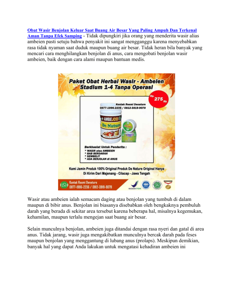 Obat Wasir Benjolan Keluar Saat Buang Air Besar Yang Paling Ampuh Dan Terkenal Aman Tanpa Efek Samping - Tidak dipungkiri jika orang yang menderita wasir alias ambeien pasti setuju bahwa penyakit ini sangat mengganggu karena menyebabkan rasa tidak nyaman saat duduk maupun buang air besar. Tidak heran bila banyak yang mencari cara menghilangkan benjolan di anus, cara mengobati benjolan wasir ambeien, baik dengan cara alami maupun bantuan medis. Wasir atau ambeien ialah semacam daging atau benjolan yang tumbuh di dalam maupun di bibir anus. Benjolan ini biasanya disebabkan oleh bengkaknya pembuluh darah yang berada di sekitar area tersebut karena beberapa hal, misalnya kegemukan, kehamilan, maupun terlalu mengejan saat buang air besar. Selain munculnya benjolan, ambeien juga ditandai dengan rasa nyeri dan gatal di area anus. Tidak jarang, wasir juga mengakibatkan munculnya bercak darah pada feses maupun benjolan yang menggantung di lubang anus (prolaps). Meskipun demikian, banyak hal yang dapat Anda lakukan untuk mengatasi kehadiran ambeien ini Obat Wasir Benjolan Keluar Saat Buang Air Besar Yang Paling Ampuh Dan Terkenal Aman Tanpa Efek Samping Secara umum, ambeien terbagi menjadi 2 jenis, yaitu ambeien dalam dan ambeien luar. Perbedaan yang utama dari kedua jenis ambeien tersebut adalah letak terbentuknya ambeien. Apa saja ciri-cirinya? Mari simak ulasan berikut. JENIS AMBEIEN DAN CIRI CIRINYA Ambeien terjadi ketika pembuluh darah di usus besar bagian akhir (rektum) dan dubur atau anus membengkak. Berdasarkan lokasi dan gejala yang ditimbulkan, ambeien terbagi menjadi 2 jenis, yaitu: Ambeien dalam (internal hemorrhoid) Disebut demikian karena pembengkakan yang terjadi berada di dalam anus, tepatnya di liang rektum. Ambeien internal jauh di dalam rektum dan tidak terlihat dari luar. Umumnya, ambeien dalam tidak menimbulkan keluhan sakit karena di liang rektum tidak banyak terdapat saraf. Seringkali, tanda pertama bahwa wasir internal hadir adalah pendarahan dubur. Gejala ambeien dalam yang lain adalah gatal dan nyeri pada anus. Gejala ini biasanya baru muncul ketika ambeien dalam menjadi semakin besar. Mengejan kadang-kadang dapat mendorong wasir internal sehingga menjorok melalui anus. Ini disebut ambeien yang menonjol atau prolaps dan bisa terasa sakit. Ambeien luar (external hemorrhoid) Pada jenis ambeien ini, lokasi pembengkakannya berada di luar rektum atau lebih tepatnya di sekitar lubang anus. Orang yang mengalami ambeien luar dapat mengeluhkan beberapa gejala, seperti: Rasa perih dan panas di sekitar anus. Gatal pada anus. Adanya benjolan atau pembengkakan di sekitar anus. BAB berdarah. Dari gejalanya, ambeien luar terasa lebih nyeri dan sering kali membuat penderitanya merasa tidak nyaman. Hal ini karena pembuluh darah yang mengalami pembengkakan berada di bawah kulit sekitar anus, di mana ada lebih banyak saraf di area tersebut. Obat Wasir Benjolan Keluar Saat Buang Air Besar Yang Paling Ampuh Dan Terkenal Aman Tanpa Efek Samping CIRI CIRI AMBEIEN ATAU WASIR SECARA UMUM Secara umum, ciri-ciri yang sering dialami penderita adalah perdarahan saat sedang buang air besar. Perdarahan ini bisa berupa bercak darah pada feses atau tetesan darah yang mengalir dari dubur. Selain itu, ada beberapa ciri lain yang bisa dideteksi, di antaranya: 1. Rasa Mengganjal Saat Buang Air Besar Sering kali kita merasa ada sesuatu yang membuat proses buang air besar tertahan. Akibatnya kita akan mengejan dan berusaha mengeluarkan feses dari dubur. Dalam beberapa kasus, mengejan justru akan membuat pembuluh vena pecah dan menimbulkan benjolan (ambeien). Namun, apabila sejak awal penyebab BAB tertahan adalah benjolan tersebut, maka proses mengejan justru akan memperparah ambeien atau wasir yang sudah dimiliki. Jika dibiarkan lama kelamaan akan timbul perdarahan. 2. Rasa Tidak Nyaman pada Anus Selain perdarahan dan gatal, penderita ambeien atau wasir biasanya akan memiliki benjolan di lubang anus. Nah, benjolan inilah yang sering kali menimbulkan rasa tidak nyaman. Ketika merasa tidak nyaman, penderita akan mengalami kesulitan saat harus duduk atau jongkok dalam waktu yang lama. 3. Prolaps Prolaps merupakan keluarnya bagian ambeien atau wasir dari lubang anus. Muncul benjolan keluar dari anus setelah buang air besar. Benjolan dapat masuk sendiri atau harus didorong terlebih dahulu. Jadi, jika saat meraba bagian dubur, Anda mendapati daging yang menonjol berwarna merah muda (lebih terang) dari area sekitarnya dan terasa perih atau bahkan mengeluarkan darah, bisa dipastikan Anda menderita penyakit ambeien atau wasir. 4. Anemia Skunder Wajah pucat, tubuh mudah lemas dan sulit berkonsensentrasi. Gejala ini biasanya muncul bila telah terjadi komplikasi anemia akibat perdarahan yang berlebihan. Perdarahan pada dubur akibat ambeien tentu saja akan membuat penderita mengalami kukurangan darah. Hal ini sering kali menjadi pemicu penyakit lain, salah satunya anemia sekunder. Apabila hal ini yang Anda alami, bisa saja penyebabnya adalah ambeien atau wasir. 5. Infeksi di Daerah Dubur Luka pada ambeien akibat perdarahan akan membuat kuman mudah masuk ke dalam tubuh, hal ini akan menimbulkan infeksi. Jika anus terasa sakit dan perih setiap buang air besar, bisa jadi Anda memiliki ambeien atau wasir. Tingkatan Stadium Wasir Atau sakit Ambeien Wasir stadium 1 : Wasir jenis ini biasanya tidak sampai prolaps. Rasanya hanya kurang nyaman saat BAB. Ambeien stadium 2 : Bagian anus sudah bisa diraba ada benjolan, namun biasanya benjolan bisa masuk dengan sendirinya dan kadang ada rasa panas serta gatal. Wasir stadium 3 : Benjolan pada anus sudah besar dan susah masuk lagi harus dibantu dengan jari. Ambeien stadium 4 : Benjolan wasie sudah besar sekali dan sulit untuk dimasukan lagi meskipun dengan bantuan tangan, selain itu juga menjadi sering pendarahan. Cara menghilangkan benjolan ambeien dengan bantuan medis Dokter akan memprioritaskan penanganan tanpa operasi, namun bila wasir Anda sudah sangat parah atau amat mengganggu, bu