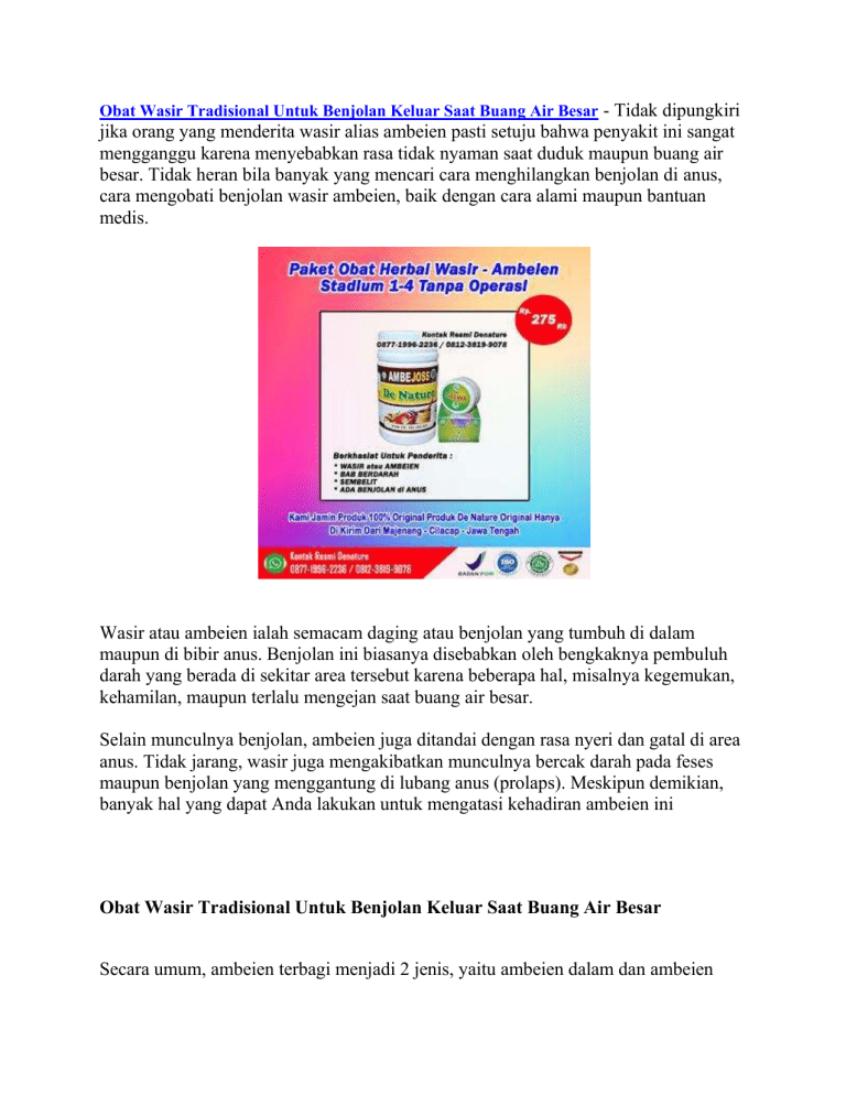 Obat Wasir Tradisional Untuk Benjolan Keluar Saat Buang Air Besar - Tidak dipungkiri jika orang yang menderita wasir alias ambeien pasti setuju bahwa penyakit ini sangat mengganggu karena menyebabkan rasa tidak nyaman saat duduk maupun buang air besar. Tidak heran bila banyak yang mencari cara menghilangkan benjolan di anus, cara mengobati benjolan wasir ambeien, baik dengan cara alami maupun bantuan medis. Wasir atau ambeien ialah semacam daging atau benjolan yang tumbuh di dalam maupun di bibir anus. Benjolan ini biasanya disebabkan oleh bengkaknya pembuluh darah yang berada di sekitar area tersebut karena beberapa hal, misalnya kegemukan, kehamilan, maupun terlalu mengejan saat buang air besar. Selain munculnya benjolan, ambeien juga ditandai dengan rasa nyeri dan gatal di area anus. Tidak jarang, wasir juga mengakibatkan munculnya bercak darah pada feses maupun benjolan yang menggantung di lubang anus (prolaps). Meskipun demikian, banyak hal yang dapat Anda lakukan untuk mengatasi kehadiran ambeien ini Obat Wasir Tradisional Untuk Benjolan Keluar Saat Buang Air Besar Secara umum, ambeien terbagi menjadi 2 jenis, yaitu ambeien dalam dan ambeien luar. Perbedaan yang utama dari kedua jenis ambeien tersebut adalah letak terbentuknya ambeien. Apa saja ciri-cirinya? Mari simak ulasan berikut. JENIS AMBEIEN DAN CIRI CIRINYA Ambeien terjadi ketika pembuluh darah di usus besar bagian akhir (rektum) dan dubur atau anus membengkak. Berdasarkan lokasi dan gejala yang ditimbulkan, ambeien terbagi menjadi 2 jenis, yaitu: Ambeien dalam (internal hemorrhoid) Disebut demikian karena pembengkakan yang terjadi berada di dalam anus, tepatnya di liang rektum. Ambeien internal jauh di dalam rektum dan tidak terlihat dari luar. Umumnya, ambeien dalam tidak menimbulkan keluhan sakit karena di liang rektum tidak banyak terdapat saraf. Seringkali, tanda pertama bahwa wasir internal hadir adalah pendarahan dubur. Gejala ambeien dalam yang lain adalah gatal dan nyeri pada anus. Gejala ini biasanya baru muncul ketika ambeien dalam menjadi semakin besar. Mengejan kadang-kadang dapat mendorong wasir internal sehingga menjorok melalui anus. Ini disebut ambeien yang menonjol atau prolaps dan bisa terasa sakit. Ambeien luar (external hemorrhoid) Pada jenis ambeien ini, lokasi pembengkakannya berada di luar rektum atau lebih tepatnya di sekitar lubang anus. Orang yang mengalami ambeien luar dapat mengeluhkan beberapa gejala, seperti: Rasa perih dan panas di sekitar anus. Gatal pada anus. Adanya benjolan atau pembengkakan di sekitar anus. BAB berdarah. Dari gejalanya, ambeien luar terasa lebih nyeri dan sering kali membuat penderitanya merasa tidak nyaman. Hal ini karena pembuluh darah yang mengalami pembengkakan berada di bawah kulit sekitar anus, di mana ada lebih banyak saraf di area tersebut. Obat Wasir Tradisional Untuk Benjolan Keluar Saat Buang Air Besar CIRI CIRI AMBEIEN ATAU WASIR SECARA UMUM Secara umum, ciri-ciri yang sering dialami penderita adalah perdarahan saat sedang buang air besar. Perdarahan ini bisa berupa bercak darah pada feses atau tetesan darah yang mengalir dari dubur. Selain itu, ada beberapa ciri lain yang bisa dideteksi, di antaranya: 1. Rasa Mengganjal Saat Buang Air Besar Sering kali kita merasa ada sesuatu yang membuat proses buang air besar tertahan. Akibatnya kita akan mengejan dan berusaha mengeluarkan feses dari dubur. Dalam beberapa kasus, mengejan justru akan membuat pembuluh vena pecah dan menimbulkan benjolan (ambeien). Namun, apabila sejak awal penyebab BAB tertahan adalah benjolan tersebut, maka proses mengejan justru akan memperparah ambeien atau wasir yang sudah dimiliki. Jika dibiarkan lama kelamaan akan timbul perdarahan. 2. Rasa Tidak Nyaman pada Anus Selain perdarahan dan gatal, penderita ambeien atau wasir biasanya akan memiliki benjolan di lubang anus. Nah, benjolan inilah yang sering kali menimbulkan rasa tidak nyaman. Ketika merasa tidak nyaman, penderita akan mengalami kesulitan saat harus duduk atau jongkok dalam waktu yang lama. 3. Prolaps Prolaps merupakan keluarnya bagian ambeien atau wasir dari lubang anus. Muncul benjolan keluar dari anus setelah buang air besar. Benjolan dapat masuk sendiri atau harus didorong terlebih dahulu. Jadi, jika saat meraba bagian dubur, Anda mendapati daging yang menonjol berwarna merah muda (lebih terang) dari area sekitarnya dan terasa perih atau bahkan mengeluarkan darah, bisa dipastikan Anda menderita penyakit ambeien atau wasir. 4. Anemia Skunder Wajah pucat, tubuh mudah lemas dan sulit berkonsensentrasi. Gejala ini biasanya muncul bila telah terjadi komplikasi anemia akibat perdarahan yang berlebihan. Perdarahan pada dubur akibat ambeien tentu saja akan membuat penderita mengalami kukurangan darah. Hal ini sering kali menjadi pemicu penyakit lain, salah satunya anemia sekunder. Apabila hal ini yang Anda alami, bisa saja penyebabnya adalah ambeien atau wasir. 5. Infeksi di Daerah Dubur Luka pada ambeien akibat perdarahan akan membuat kuman mudah masuk ke dalam tubuh, hal ini akan menimbulkan infeksi. Jika anus terasa sakit dan perih setiap buang air besar, bisa jadi Anda memiliki ambeien atau wasir. Tingkatan Stadium Wasir Atau sakit Ambeien Wasir stadium 1 : Wasir jenis ini biasanya tidak sampai prolaps. Rasanya hanya kurang nyaman saat BAB. Ambeien stadium 2 : Bagian anus sudah bisa diraba ada benjolan, namun biasanya benjolan bisa masuk dengan sendirinya dan kadang ada rasa panas serta gatal. Wasir stadium 3 : Benjolan pada anus sudah besar dan susah masuk lagi harus dibantu dengan jari. Ambeien stadium 4 : Benjolan wasie sudah besar sekali dan sulit untuk dimasukan lagi meskipun dengan bantuan tangan, selain itu juga menjadi sering pendarahan. Cara menghilangkan benjolan ambeien dengan bantuan medis Dokter akan memprioritaskan penanganan tanpa operasi, namun bila wasir Anda sudah sangat parah atau amat mengganggu, bukan tidak mungkin Anda akan diminta menjalani prosedur pembedahan. Cara menghilangkan benjolan ambeien tanpa op