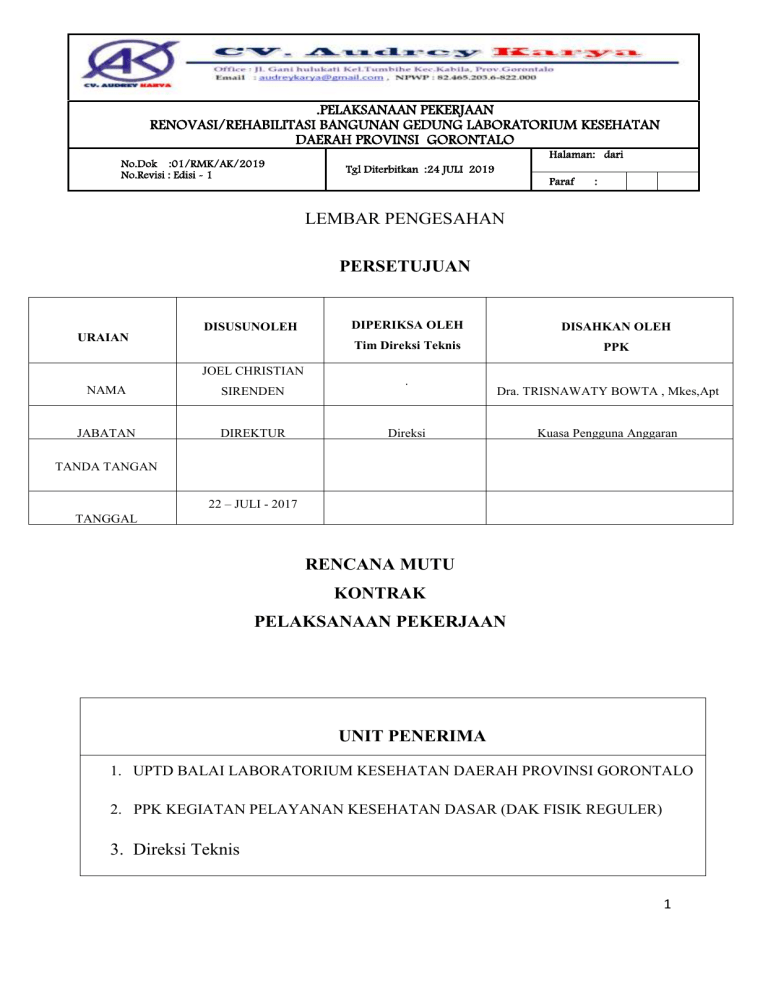 .PELAKSANAAN PEKERJAAN RENOVASI/REHABILITASI BANGUNAN GEDUNG LABORATORIUM KESEHATAN DAERAH PROVINSI GORONTALO No.Dok :01/RMK/AK/2019 No.Revisi : Edisi - 1 Halaman: dari Tgl Diterbitkan :24 JULI 2019 Paraf : LEMBAR PENGESAHAN PERSETUJUAN URAIAN DISUSUNOLEH JOEL CHRISTIAN DIPERIKSA OLEH DISAHKAN OLEH Tim Direksi Teknis PPK NAMA SIRENDEN .. Dra. TRISNAWATY BOWTA , Mkes,Apt JABATAN DIREKTUR Direksi Kuasa Pengguna Anggaran ..... . TANDA TANGAN 22 – JULI - 2017 TANGGAL RENCANA MUTU KONTRAK PELAKSANAAN PEKERJAAN UNIT PENERIMA 1. UPTD BALAI LABORATORIUM KESEHATAN DAERAH PROVINSI GORONTALO 2. PPK KEGIATAN PELAYANAN KESEHATAN DASAR (DAK FISIK REGULER) 3. Direksi Teknis 1 .PELAKSANAAN PEKERJAAN RENOVASI/REHABILITASI BANGUNAN GEDUNG LABORATORIUM KESEHATAN DAERAH PROVINSI GORONTALO No.Dok :01/RMK/AK/2019 No.Revisi : Edisi - 1 Halaman: dari Tgl Diterbitkan :24 JULI 2019 Paraf : STATUS DOKUMEN EDISI : 1 Nomor EDISI : 2 Nomor : 01/RMK/AK/2019 Tanggal : 24 JULI 2019 Tanggal EDISI : Nomor : : Tanggal : 2 .PELAKSANAAN PEKERJAAN RENOVASI/REHABILITASI BANGUNAN GEDUNG LABORATORIUM KESEHATAN DAERAH PROVINSI GORONTALO No.Dok :01/RMK/AK/2019 No.Revisi : Edisi - 1 Halaman: dari Tgl Diterbitkan :24 JULI 2019 Paraf : SEJARAHDOKUMEN TANGGAL CATATAN PERUBAHAN KETERANGAN 3 .PELAKSANAAN PEKERJAAN RENOVASI/REHABILITASI BANGUNAN GEDUNG LABORATORIUM KESEHATAN DAERAH PROVINSI GORONTALO No.Dok :01/RMK/AK/2019 No.Revisi : Edisi - 1 Halaman: dari Tgl Diterbitkan :24 JULI 2019 Paraf : DAFTAR ISI LEMBAR PENGESAHAN ...........................................................................................1 SEJARAHDOKUMEN ..................................................................................................1 DAFTAR ISI..................................................................................................................4 1. LATAR BELAKANG .........................................................................................5 2. INFORMASI KEGIATAN ..................................................................................8 3. SASARANMUTU .............................................................................................18 4. PERSYARATAN TEKNIS DAN ADMINISTRASI ........................................18 5. STRUKTUR ORGANISASI DAN TUGAS & TANGGUNG JAWAB ...........19 6. BAGAN ALIR PELAKSANAAN PEKERJAAN.............................................22 7. JADWAL PELAKSANAAN PEKERJAAN .....................................................57 8. JADWALPERALATAN .........................Ошибка! Закладка не определена. 9. JADWALPERSONIL ........................................................................................18 10. JADWAL ARUS KAS ......................................................................................61 11. RENCANADANMETODAVERIFIKASI,VALIDASI,MONITORING,EVALUASI, INSPEKS 12. DAFTAR KRITERIA PENERIMAAN ...Ошибка! Закладка не определена. 13. DAFTAR INDUK DOKUMEN DAN REKAMAN .........................................25 4 .PELAKSANAAN PEKERJAAN RENOVASI/REHABILITASI BANGUNAN GEDUNG LABORATORIUM KESEHATAN DAERAH PROVINSI GORONTALO No.Dok :01/RMK/AK/2019 No.Revisi : Edisi - 1 Halaman: dari Tgl Diterbitkan :24 JULI 2019 Paraf : 1. LATAR BELAKANG Dalam rangka usaha menjaga dan meningkatkan kualitas pekerjaan, maka diperlukan suatu panduan pengendalian mutu, proses serta persyaratan-persyaratan yang harus dilaksanakan dalam pelaksanaan pekerjaan, yaitu berupa Rencana Mutu Kontrak (RMK). Rencana Mutu Kontrak adalah suatu pedoman jaminan mutu dalam pelaksanaan pekerjaan, agar produk akhir pekerjaan sesuai dengan syarat teknis yang tercantum dalam kontrak. Rencana Mutu Kontrak (RMK) ini digunakan untuk memonitor dan menilai pelaksanaan/penerapan spesifikasi teknik yang melekat pada kontrak kerja konstruksi antara : UPTD Balai Laboratorium Kesehatan Daerah Provinsi Gorontalo Dan CV.Audrey Karya. Rencana Mutu Kontrak (RMK) dimaksudkan untuk menerapkan lingkup prosedur jaminan mutu pelaksanaan kontrak pekerjaan dan dijadikan sebagai acuan untuk menguraikan secara rinci, lengkap dan jelas tentang tata cara melaksanakan pekerjaan secara benar sesuai dengan tahapan kegiatan yang disyaratkan dalam dokumen pelaksanaan (dokumen kontrak). Sedangkan tujuannya adalah sebagai alat kontrol/pengendali terhadap mutu suatu pekerjaan, apakah semua item pekerjaan dilaksanakan sesuai dengan spesifikasi atau kriteria yang berlaku, sehingga apabila terjadi suatu penyimpangan, maka dengan adanya Rencana Mutu Kontrak (RMK) dapat diketahui dari awal dan kesalahan yang lebih fatal dapat dihindari, serta kualitas pekerjaan pun dapat dipertanggung jawabkan sesuai dengan yang diharapkan. 5 .PELAKSANAAN PEKERJAAN RENOVASI/REHABILITASI BANGUNAN GEDUNG LABORATORIUM KESEHATAN DAERAH PROVINSI GORONTALO No.Dok :01/RMK/AK/2019 No.Revisi : Edisi - 1 Halaman: dari Tgl Diterbitkan :24 JULI 2019 Paraf : KATA PENGANTAR Sebagai realisasi kontrak kerja antara UPTD Balai Laboratorium Kesehatan Daerah Provinsi Gorontalo Dan CV.Audrey Karya. mengenai pekerjaan : Renovasi /Rehabilitasi Bangunan Gedung Laboratorium Kesehatan Daerah Provinsi Gorontalo sebagai kontraktor pelaksana CV.Audrey Karya berkewajiban menyusun laporan rencana mutu kontrak (RMK) Laporan Rencana Mutu Kontrak (RMK) meliputi penjelasan tentang semua kegiatan yang akan dilakukan oleh kontraktor, termasuk metode pelaksanaan, sasaran yang dipergunakan dan jadwal pelaksanaan pekerjaan, tenaga kerja, bahan dan alat. Tujuan dari laporan ini untuk evaluasi dan pengawasan pelaksanaan pekerjaan yang akan dilakukan oleh kontraktor. Demikian laporan Rencana Mutu Kontrak (RMK) disusun dengan harapan dapat digunakan untuk kemajuan pekerjaan secara keseluruhan, sehingga pekerjaan dapat diselesaikan dengan baik, tepat mutu dan tepat waktu. Gorontalo, 22 Juli 2019 CV. AUDREY KARYA JOEL CHRISTIAN SIRENDEN Direktur BAB I 6 .PELAKSANAAN PEKERJAAN RENOVASI/REHABILITASI BANGUNAN GEDUNG LABORATORIUM KESEHATAN DAERAH PROVINSI GORON