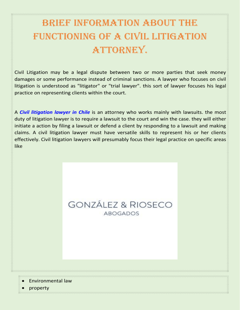 Brief information aBout the functioning of a civil litigation attorney. Civil Litigation may be a legal dispute between two or more parties that seek money damages or some performance instead of criminal sanctions. A lawyer who focuses on civil litigation is understood as "litigator" or "trial lawyer". this sort of lawyer focuses his legal practice on representing clients within the court. A Civil litigation lawyer in Chile is an attorney who works mainly with lawsuits. the most duty of litigation lawyer is to require a lawsuit to the court and win the case. they will either initiate a action by filing a lawsuit or defend a client by responding to a lawsuit and making claims. A civil litigation lawyer must have versatile skills to represent his or her clients effectively. Civil litigation lawyers will presumably focus their legal practice on specific areas like Environmental law property Landlord/tenant Products liability Personal injury Construction Medical malpractice Employment and labor land Anti-trust Worker's compensation Education law A Civil matter lawyers in Chile has got to work calmly and professionally with the clients. The three main experience levels of litigation levels-junior, 0-3 years of experience; midlevel, 3-more years of experience; senior, 4 to more years of experience The role of the litigation professional is extremely challenging since civil litigation is an adversarial process. The civil litigation lawyer knows the ins and outs of the system and can handle all types of paperwork and letters involved in any civil court matter. the talents required for the litigation are: Knowledge of procedural and substantial law Strong oral and written advocacy skills Logical and analytical reasoning abilities Ability to synthesize factual and sophisticated legal material Superior interpersonal skills Client development and negotiation skills Knowledge of legal software techniques. HOW CIVIL LIGITATION LAW WORKS Civil litigation is often divided into seven stages: investigation, pleadings, discovery, pretrial, trial, settlement and appeal. Not every lawsuit passes through every stages of litigation. The lifespan of lawsuit ranges from several months to many years. Complex civil litigation takes years to pass from pre suit investigation through trial/settlement. Discovery is that the longest and laborious stage of civil litigation. Litigation law is extremely detailed and its case is typically large. A party who initiates a legal action during a court by filing a complaint is designated as plaintiff. The party against whom the complaint is filed is understood as defendant. The complaint may be a plain statement that describes the dispute and typically contains a money damage requests. It must be served on the defendant on the sheriff authorized by a law. Upon receipt, the defendant has got to answer the complaint within a specified period. After filing his answer to the complaint by the defendant, the invention phase of the civil litigation process starts. the invention rules are designed to assist delineate the fabric issues within the dispute before trial therefore the trial is conducted on the merit of the case. Once discovery is concluded, a pre-trial conference is scheduled to resolve any outstanding issues by the court.