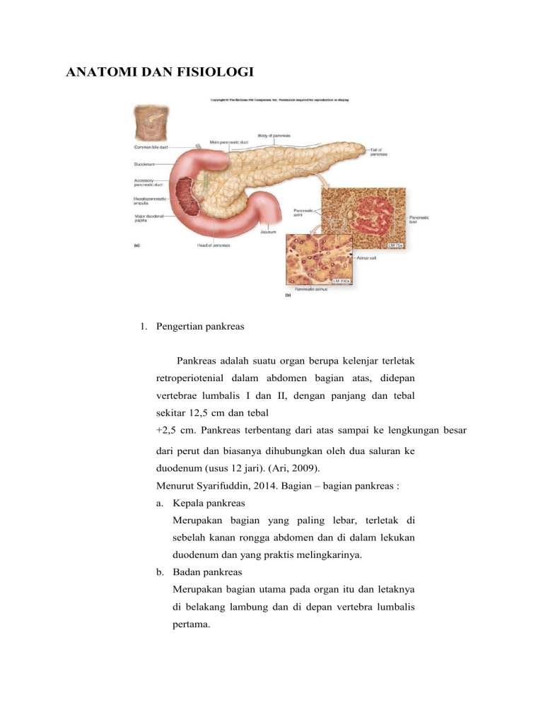 ANATOMI DAN FISIOLOGI 1. Pengertian pankreas Pankreas adalah suatu organ berupa kelenjar terletak retroperiotenial dalam abdomen bagian atas, didepan vertebrae lumbalis I dan II, dengan panjang dan tebal sekitar 12,5 cm dan tebal +2,5 cm. Pankreas terbentang dari atas sampai ke lengkungan besar dari perut dan biasanya dihubungkan oleh dua saluran ke duodenum (usus 12 jari). (Ari, 2009). Menurut Syarifuddin, 2014. Bagian – bagian pankreas : a. Kepala pankreas Merupakan bagian yang paling lebar, terletak di sebelah kanan rongga abdomen dan di dalam lekukan duodenum dan yang praktis melingkarinya. b. Badan pankreas Merupakan bagian utama pada organ itu dan letaknya di belakang lambung dan di depan vertebra lumbalis pertama. c. Ekor pankreas Merupakan bagian yang runcing di sebelah kiri dan yang sebenarnya menyentuh limpa. Pankreas mendapat darah dari arteri lienalis dan arteri mesenterika superior. Duktus pankreatikus bersatu dengan duktus koledukus dan masuk ke duodenum, pankreas menghasilkan dua kelenjar yaitu kelenjar endokrin dan kelenjar eksokrin. Pankreas menghasilkan endokrin bagian dari kelompok sel yang membentuk pulau-pulau Langerhans. Pulau–pulau Langerhans berbentuk oval terbesar di seluruh pankreas. Dalam tubuh manusia terdapat 1 – 2 juta pulau–pulau Langerhans yang dibedakan atas granulasi dan pewarnaan, setengah hormon dari sel ini menyekresi insulin. (syarifuddin, 2014) 2. Struktur Jaringan Penyusun Pankreas. Ada dua jaringan utama yang menyusun pankreas : a. Jaringan Asini. berfungsi untuk mensekresi getah pecernaan dalam duodenum. b. Pulau Langerhans Pulau Langerhans adalah kumpulan sel berbentuk ovoid, berukuran 76×175 mm dan berdiameter 20 sampai 300 mikron tersebar di seluruh pankreas, walaupun lebih banyak ditemukan di ekor daripada kepala dan badan pankreas. Pulau-pulau ini menyusun 1-2% berat pankreas. Pada manusia terdapat 1-2 juta pulau. Masing-masing memiliki pasokan darah yang besar dan darah dari pulau Langerhans seperti darah dari saluran cerna tetapi tidak seperti darah dari organ endokrin lain, mengalir ke vena hepatika. Sel-sel dalam pulau dapat dibagi menjadi beberapa jenis bergantung pada sifat pewarnaan dan morfologinya. Pada manusia paling sedikit terdapat empat jenis sel : 1) Sel-sel A (alfa) sekitar 20-40% memproduksi glukagon menjadi faktor hiperglikemik, mempunayi anti- insulin aktif. Pulau-pulau yang kaya akan sel A secara embriologis berasal dari tonjolan pankreas dorsal, dan pulau yang kaya akan sel F berasal dari tonjolan pankreas sentral. Kedua tonjolan ini berasal dari tempat yang berbeda di duodenum. 2) Sel-sel B (beta) 60-80% fungsinya membuat insulin, umumnya terletak di bagian tengah pulau. Sel beta yang ada di pulau langerhans memproduksi hormon insulin yang berperan dalam menurunkan kadar glukosa darah dan secara fisiologi memiliki peranan yang berlawanan dengan glukosa. Insulin menurunkan kadar gula darah dengan beberapa cara. Insulin mempercepat transportasi glukosa dari darah ke dalam sel, khususnya serabut otot rangka glukosa masuk ke dalam sel tergantung dari keberadaan reseptor insulin yang ada di permukaan sel target. Insulin juga mempercepat perubahan glukosa menjadi glikogen, menurunkan glycogenolysis dan gluconeogenesis, menstimulasi perubahan glukosa atau zat gizi lainnya ke dalam asam lemak (lipogenesis), dan membantu menstimulasi sintesis protein. 3) Sel-sel D5- 15% membuat somatostatin 4) Sel-sel F 1% mengandung dan menyekresi pankreatik polipeptida. 3. Pengaturan sekresi insulin Pengaturan seresi insulin seperti sekresi glukagon yaitu langsung ditentukan oleh kadar gula dalam darah dan berdasarkan dari mekanisme umpan balik (feed back negative system). Bagaimana pun hormon lainnya secara tidak langsung juga dapat mempengaruhi produksi insulin. Sebagai contoh hormon pertumbuhan manusia (HGH) meningkatkan kadar glukosa darah dan meningkatnya kadar glukosa mengerakkan (menyebabkan) sekresi insulin. Hormon adrenocorticotropi (ACTH) yang distimulasi oleh sekresi glukocortikoid menghasilkan hyperglikemia dan secara tidak langsung juga menstimulasi pelepasan insulin. Peningkatan kadar asam amino dalam darah menstimulasi pelepasan insulin. Hormon-hormon pencernaan seperti stomatch dan interstinal gastrin, sekretin, cholecystokinin (CCK) dan Gastric Inhibitory Peptide (GIP) juga menstimulasi sekresi insulin, GHIH (Somatostatin) menghalangi sekresi insulin (Ari, 2009). 4. Getah pankreas Getah pankreas mengandung enzim-enzim untuk pencernaan ketiga jenis makanan utama : protein, karbohidrat, dan lemak. Getah pankreas juga mngandung ion biakarbonat dalam jumlah besar, yang memegang peranan penting dalam menetralkan asam yang dikeluarkan oleh lambung ke dalam duodenum. Enzim-enzim proteolitik adalah tripsin, kimotripsin, karboksipeptidase, ribonuklease, deoksiribonuklease. Tiga enzim petama memecahkan keseluruhan dan secara parsial protein yang dicernakan, sedangkan neklease memecahkan kedua jenis asam nukleat : asam ribonukleat dan deoksinukleat. (syarifuddin, 2014) Enzim pencernaan untuk karbohidrat adalah amilase pankreas, yang menghidrolisis pati, glikogen, dan sebagian besar karbohidrat lain kecuali selulosa untuk membentuk karbohidrat, sedangkan enzim- enzim untuk pencernaan lemak adalah lipase pankreas, yang menghidrolisis lemak netral menjadi gliserol, asam lemak dan kolesterol esterase, yang menyebabkan hidrolisis ester-ester kolesterol. (syarifuddin, 2014) Enzim-enzim proteolitik waktu disintesis dalam sel-sel pankreas berada dalam bentuk tidak aktif ; tripsinogen, kimotripsinogen, dan prokarboksipeptidase, yang semuanya secara enzimtik tidak aktif. Zatzat ini hanya menjadi aktif setelah mereka disekresi ke dalam saluran cerna. Tripsinogen diaktifkan oleh suatu enzim yang dinamakan enterokinase, yang disekresi oleh mukosa usus ketike kimus mengadakan kontak dengan mukosa. Tripsinogen juga dapat diaktifkan oleh tripsin yang telah dibentuk. Kimotripsinogen diaktifkan oleh tripsin menjadi kimotripsin, dan prokarboksipept
