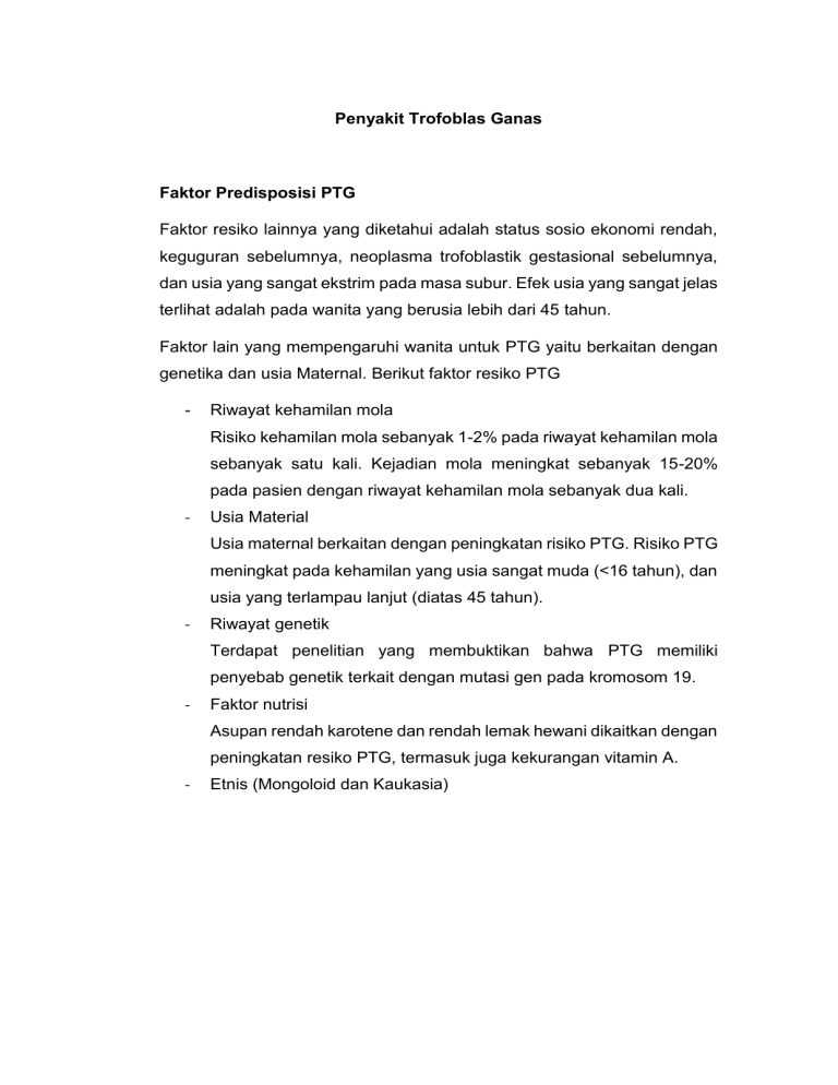 Penyakit Trofoblas Ganas Faktor Predisposisi PTG Faktor resiko lainnya yang diketahui adalah status sosio ekonomi rendah, keguguran sebelumnya, neoplasma trofoblastik gestasional sebelumnya, dan usia yang sangat ekstrim pada masa subur. Efek usia yang sangat jelas terlihat adalah pada wanita yang berusia lebih dari 45 tahun. Faktor lain yang mempengaruhi wanita untuk PTG yaitu berkaitan dengan genetika dan usia Maternal. Berikut faktor resiko PTG - Riwayat kehamilan mola Risiko kehamilan mola sebanyak 1-2% pada riwayat kehamilan mola sebanyak satu kali. Kejadian mola meningkat sebanyak 15-20% pada pasien dengan riwayat kehamilan mola sebanyak dua kali. - Usia Material Usia maternal berkaitan dengan peningkatan risiko PTG. Risiko PTG meningkat pada kehamilan yang usia sangat muda (<16 tahun), dan usia yang terlampau lanjut (diatas 45 tahun). - Riwayat genetik Terdapat penelitian yang membuktikan bahwa PTG memiliki penyebab genetik terkait dengan mutasi gen pada kromosom 19. - Faktor nutrisi Asupan rendah karotene dan rendah lemak hewani dikaitkan dengan peningkatan resiko PTG, termasuk juga kekurangan vitamin A. - Etnis (Mongoloid dan Kaukasia) Manifestasi Klinis PTG Tanda dan gejala PTG adalah sebagai berikut (Tjandra,2016) : - Perdarahan pervaginam (coklat atau merah) - Mual muntah yang hebat - Pertumbuhan uterus yang cepat, tidak sesuai dengan usia kehamilan - Nyeri tekan pada pervis (jarang) - Tekanan Darah Tinggi - Pre Eklampsia (>20 minggu) - Anemia - Hipertiroidisme Daftar pustaka: Friadi, A. (2019). Update on the Diagnosis of Gestational Trophoblastic Disease. UMI Medical Journal : Jurnal Kedokteran, 4(2). Hal 20-30. Tjandra,O. 2016. Gestational trophoblastic disease. Jurnal Bina Cendekia Kebidanan, 2(2). Hal 188-192.