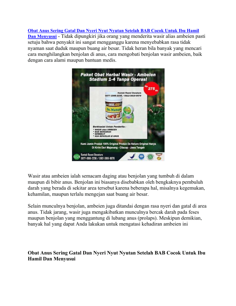 Obat Anus Sering Gatal Dan Nyeri Nyut Nyutan Setelah BAB Cocok Untuk Ibu Hamil Dan Menyusui - Tidak dipungkiri jika orang yang menderita wasir alias ambeien pasti setuju bahwa penyakit ini sangat mengganggu karena menyebabkan rasa tidak nyaman saat duduk maupun buang air besar. Tidak heran bila banyak yang mencari cara menghilangkan benjolan di anus, cara mengobati benjolan wasir ambeien, baik dengan cara alami maupun bantuan medis. Wasir atau ambeien ialah semacam daging atau benjolan yang tumbuh di dalam maupun di bibir anus. Benjolan ini biasanya disebabkan oleh bengkaknya pembuluh darah yang berada di sekitar area tersebut karena beberapa hal, misalnya kegemukan, kehamilan, maupun terlalu mengejan saat buang air besar. Selain munculnya benjolan, ambeien juga ditandai dengan rasa nyeri dan gatal di area anus. Tidak jarang, wasir juga mengakibatkan munculnya bercak darah pada feses maupun benjolan yang menggantung di lubang anus (prolaps). Meskipun demikian, banyak hal yang dapat Anda lakukan untuk mengatasi kehadiran ambeien ini Obat Anus Sering Gatal Dan Nyeri Nyut Nyutan Setelah BAB Cocok Untuk Ibu Hamil Dan Menyusui Secara umum, ambeien terbagi menjadi 2 jenis, yaitu ambeien dalam dan ambeien luar. Perbedaan yang utama dari kedua jenis ambeien tersebut adalah letak terbentuknya ambeien. Apa saja ciri-cirinya? Mari simak ulasan berikut. JENIS AMBEIEN DAN CIRI CIRINYA Ambeien terjadi ketika pembuluh darah di usus besar bagian akhir (rektum) dan dubur atau anus membengkak. Berdasarkan lokasi dan gejala yang ditimbulkan, ambeien terbagi menjadi 2 jenis, yaitu: Ambeien dalam (internal hemorrhoid) Disebut demikian karena pembengkakan yang terjadi berada di dalam anus, tepatnya di liang rektum. Ambeien internal jauh di dalam rektum dan tidak terlihat dari luar. Umumnya, ambeien dalam tidak menimbulkan keluhan sakit karena di liang rektum tidak banyak terdapat saraf. Seringkali, tanda pertama bahwa wasir internal hadir adalah pendarahan dubur. Gejala ambeien dalam yang lain adalah gatal dan nyeri pada anus. Gejala ini biasanya baru muncul ketika ambeien dalam menjadi semakin besar. Mengejan kadang-kadang dapat mendorong wasir internal sehingga menjorok melalui anus. Ini disebut ambeien yang menonjol atau prolaps dan bisa terasa sakit. Ambeien luar (external hemorrhoid) Pada jenis ambeien ini, lokasi pembengkakannya berada di luar rektum atau lebih tepatnya di sekitar lubang anus. Orang yang mengalami ambeien luar dapat mengeluhkan beberapa gejala, seperti: Rasa perih dan panas di sekitar anus. Gatal pada anus. Adanya benjolan atau pembengkakan di sekitar anus. BAB berdarah. Dari gejalanya, ambeien luar terasa lebih nyeri dan sering kali membuat penderitanya merasa tidak nyaman. Hal ini karena pembuluh darah yang mengalami pembengkakan berada di bawah kulit sekitar anus, di mana ada lebih banyak saraf di area tersebut. Obat Anus Sering Gatal Dan Nyeri Nyut Nyutan Setelah BAB Cocok Untuk Ibu Hamil Dan Menyusui CIRI CIRI AMBEIEN ATAU WASIR SECARA UMUM Secara umum, ciri-ciri yang sering dialami penderita adalah perdarahan saat sedang buang air besar. Perdarahan ini bisa berupa bercak darah pada feses atau tetesan darah yang mengalir dari dubur. Selain itu, ada beberapa ciri lain yang bisa dideteksi, di antaranya: 1. Rasa Mengganjal Saat Buang Air Besar Sering kali kita merasa ada sesuatu yang membuat proses buang air besar tertahan. Akibatnya kita akan mengejan dan berusaha mengeluarkan feses dari dubur. Dalam beberapa kasus, mengejan justru akan membuat pembuluh vena pecah dan menimbulkan benjolan (ambeien). Namun, apabila sejak awal penyebab BAB tertahan adalah benjolan tersebut, maka proses mengejan justru akan memperparah ambeien atau wasir yang sudah dimiliki. Jika dibiarkan lama kelamaan akan timbul perdarahan. 2. Rasa Tidak Nyaman pada Anus Selain perdarahan dan gatal, penderita ambeien atau wasir biasanya akan memiliki benjolan di lubang anus. Nah, benjolan inilah yang sering kali menimbulkan rasa tidak nyaman. Ketika merasa tidak nyaman, penderita akan mengalami kesulitan saat harus duduk atau jongkok dalam waktu yang lama. 3. Prolaps Prolaps merupakan keluarnya bagian ambeien atau wasir dari lubang anus. Muncul benjolan keluar dari anus setelah buang air besar. Benjolan dapat masuk sendiri atau harus didorong terlebih dahulu. Jadi, jika saat meraba bagian dubur, Anda mendapati daging yang menonjol berwarna merah muda (lebih terang) dari area sekitarnya dan terasa perih atau bahkan mengeluarkan darah, bisa dipastikan Anda menderita penyakit ambeien atau wasir. 4. Anemia Skunder Wajah pucat, tubuh mudah lemas dan sulit berkonsensentrasi. Gejala ini biasanya muncul bila telah terjadi komplikasi anemia akibat perdarahan yang berlebihan. Perdarahan pada dubur akibat ambeien tentu saja akan membuat penderita mengalami kukurangan darah. Hal ini sering kali menjadi pemicu penyakit lain, salah satunya anemia sekunder. Apabila hal ini yang Anda alami, bisa saja penyebabnya adalah ambeien atau wasir. 5. Infeksi di Daerah Dubur Luka pada ambeien akibat perdarahan akan membuat kuman mudah masuk ke dalam tubuh, hal ini akan menimbulkan infeksi. Jika anus terasa sakit dan perih setiap buang air besar, bisa jadi Anda memiliki ambeien atau wasir. Tingkatan Stadium Wasir Atau sakit Ambeien Wasir stadium 1 : Wasir jenis ini biasanya tidak sampai prolaps. Rasanya hanya kurang nyaman saat BAB. Ambeien stadium 2 : Bagian anus sudah bisa diraba ada benjolan, namun biasanya benjolan bisa masuk dengan sendirinya dan kadang ada rasa panas serta gatal. Wasir stadium 3 : Benjolan pada anus sudah besar dan susah masuk lagi harus dibantu dengan jari. Ambeien stadium 4 : Benjolan wasie sudah besar sekali dan sulit untuk dimasukan lagi meskipun dengan bantuan tangan, selain itu juga menjadi sering pendarahan. Cara menghilangkan benjolan ambeien dengan bantuan medis Dokter akan memprioritaskan penanganan tanpa operasi, namun bila wasir Anda sudah sangat parah atau amat mengganggu, bukan tidak mungkin Anda akan dimin