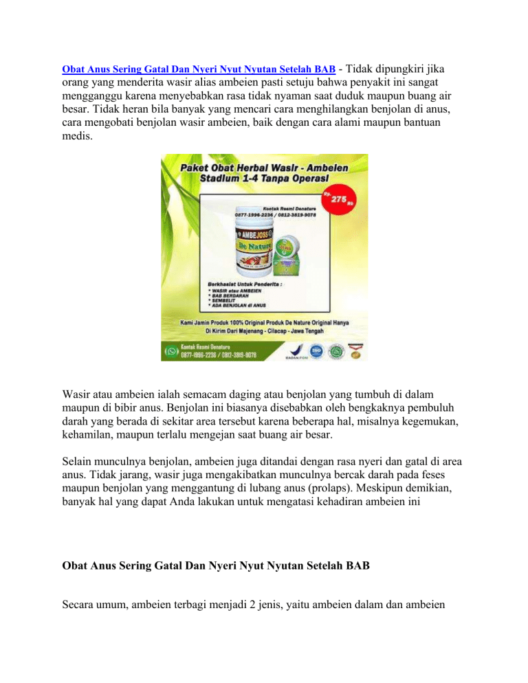 Obat Anus Sering Gatal Dan Nyeri Nyut Nyutan Setelah BAB - Tidak dipungkiri jika orang yang menderita wasir alias ambeien pasti setuju bahwa penyakit ini sangat mengganggu karena menyebabkan rasa tidak nyaman saat duduk maupun buang air besar. Tidak heran bila banyak yang mencari cara menghilangkan benjolan di anus, cara mengobati benjolan wasir ambeien, baik dengan cara alami maupun bantuan medis. Wasir atau ambeien ialah semacam daging atau benjolan yang tumbuh di dalam maupun di bibir anus. Benjolan ini biasanya disebabkan oleh bengkaknya pembuluh darah yang berada di sekitar area tersebut karena beberapa hal, misalnya kegemukan, kehamilan, maupun terlalu mengejan saat buang air besar. Selain munculnya benjolan, ambeien juga ditandai dengan rasa nyeri dan gatal di area anus. Tidak jarang, wasir juga mengakibatkan munculnya bercak darah pada feses maupun benjolan yang menggantung di lubang anus (prolaps). Meskipun demikian, banyak hal yang dapat Anda lakukan untuk mengatasi kehadiran ambeien ini Obat Anus Sering Gatal Dan Nyeri Nyut Nyutan Setelah BAB Secara umum, ambeien terbagi menjadi 2 jenis, yaitu ambeien dalam dan ambeien luar. Perbedaan yang utama dari kedua jenis ambeien tersebut adalah letak terbentuknya ambeien. Apa saja ciri-cirinya? Mari simak ulasan berikut. JENIS AMBEIEN DAN CIRI CIRINYA Ambeien terjadi ketika pembuluh darah di usus besar bagian akhir (rektum) dan dubur atau anus membengkak. Berdasarkan lokasi dan gejala yang ditimbulkan, ambeien terbagi menjadi 2 jenis, yaitu: Ambeien dalam (internal hemorrhoid) Disebut demikian karena pembengkakan yang terjadi berada di dalam anus, tepatnya di liang rektum. Ambeien internal jauh di dalam rektum dan tidak terlihat dari luar. Umumnya, ambeien dalam tidak menimbulkan keluhan sakit karena di liang rektum tidak banyak terdapat saraf. Seringkali, tanda pertama bahwa wasir internal hadir adalah pendarahan dubur. Gejala ambeien dalam yang lain adalah gatal dan nyeri pada anus. Gejala ini biasanya baru muncul ketika ambeien dalam menjadi semakin besar. Mengejan kadang-kadang dapat mendorong wasir internal sehingga menjorok melalui anus. Ini disebut ambeien yang menonjol atau prolaps dan bisa terasa sakit. Ambeien luar (external hemorrhoid) Pada jenis ambeien ini, lokasi pembengkakannya berada di luar rektum atau lebih tepatnya di sekitar lubang anus. Orang yang mengalami ambeien luar dapat mengeluhkan beberapa gejala, seperti: Rasa perih dan panas di sekitar anus. Gatal pada anus. Adanya benjolan atau pembengkakan di sekitar anus. BAB berdarah. Dari gejalanya, ambeien luar terasa lebih nyeri dan sering kali membuat penderitanya merasa tidak nyaman. Hal ini karena pembuluh darah yang mengalami pembengkakan berada di bawah kulit sekitar anus, di mana ada lebih banyak saraf di area tersebut. Obat Anus Sering Gatal Dan Nyeri Nyut Nyutan Setelah BAB CIRI CIRI AMBEIEN ATAU WASIR SECARA UMUM Secara umum, ciri-ciri yang sering dialami penderita adalah perdarahan saat sedang buang air besar. Perdarahan ini bisa berupa bercak darah pada feses atau tetesan darah yang mengalir dari dubur. Selain itu, ada beberapa ciri lain yang bisa dideteksi, di antaranya: 1. Rasa Mengganjal Saat Buang Air Besar Sering kali kita merasa ada sesuatu yang membuat proses buang air besar tertahan. Akibatnya kita akan mengejan dan berusaha mengeluarkan feses dari dubur. Dalam beberapa kasus, mengejan justru akan membuat pembuluh vena pecah dan menimbulkan benjolan (ambeien). Namun, apabila sejak awal penyebab BAB tertahan adalah benjolan tersebut, maka proses mengejan justru akan memperparah ambeien atau wasir yang sudah dimiliki. Jika dibiarkan lama kelamaan akan timbul perdarahan. 2. Rasa Tidak Nyaman pada Anus Selain perdarahan dan gatal, penderita ambeien atau wasir biasanya akan memiliki benjolan di lubang anus. Nah, benjolan inilah yang sering kali menimbulkan rasa tidak nyaman. Ketika merasa tidak nyaman, penderita akan mengalami kesulitan saat harus duduk atau jongkok dalam waktu yang lama. 3. Prolaps Prolaps merupakan keluarnya bagian ambeien atau wasir dari lubang anus. Muncul benjolan keluar dari anus setelah buang air besar. Benjolan dapat masuk sendiri atau harus didorong terlebih dahulu. Jadi, jika saat meraba bagian dubur, Anda mendapati daging yang menonjol berwarna merah muda (lebih terang) dari area sekitarnya dan terasa perih atau bahkan mengeluarkan darah, bisa dipastikan Anda menderita penyakit ambeien atau wasir. 4. Anemia Skunder Wajah pucat, tubuh mudah lemas dan sulit berkonsensentrasi. Gejala ini biasanya muncul bila telah terjadi komplikasi anemia akibat perdarahan yang berlebihan. Perdarahan pada dubur akibat ambeien tentu saja akan membuat penderita mengalami kukurangan darah. Hal ini sering kali menjadi pemicu penyakit lain, salah satunya anemia sekunder. Apabila hal ini yang Anda alami, bisa saja penyebabnya adalah ambeien atau wasir. 5. Infeksi di Daerah Dubur Luka pada ambeien akibat perdarahan akan membuat kuman mudah masuk ke dalam tubuh, hal ini akan menimbulkan infeksi. Jika anus terasa sakit dan perih setiap buang air besar, bisa jadi Anda memiliki ambeien atau wasir. Tingkatan Stadium Wasir Atau sakit Ambeien Wasir stadium 1 : Wasir jenis ini biasanya tidak sampai prolaps. Rasanya hanya kurang nyaman saat BAB. Ambeien stadium 2 : Bagian anus sudah bisa diraba ada benjolan, namun biasanya benjolan bisa masuk dengan sendirinya dan kadang ada rasa panas serta gatal. Wasir stadium 3 : Benjolan pada anus sudah besar dan susah masuk lagi harus dibantu dengan jari. Ambeien stadium 4 : Benjolan wasie sudah besar sekali dan sulit untuk dimasukan lagi meskipun dengan bantuan tangan, selain itu juga menjadi sering pendarahan. Cara menghilangkan benjolan ambeien dengan bantuan medis Dokter akan memprioritaskan penanganan tanpa operasi, namun bila wasir Anda sudah sangat parah atau amat mengganggu, bukan tidak mungkin Anda akan diminta menjalani prosedur pembedahan. Cara menghilangkan benjolan ambeien tanpa operasi adalah: Rubber band l